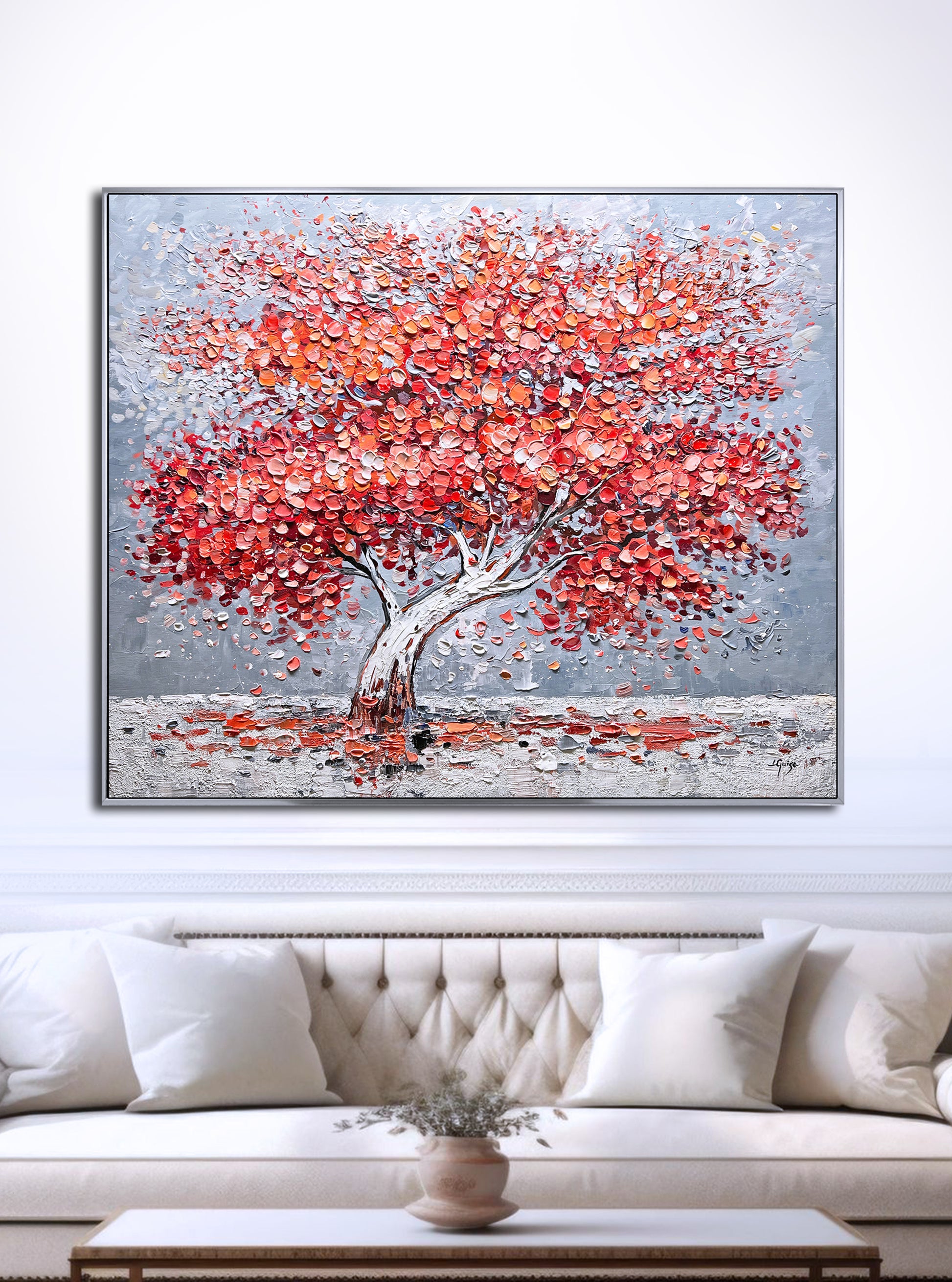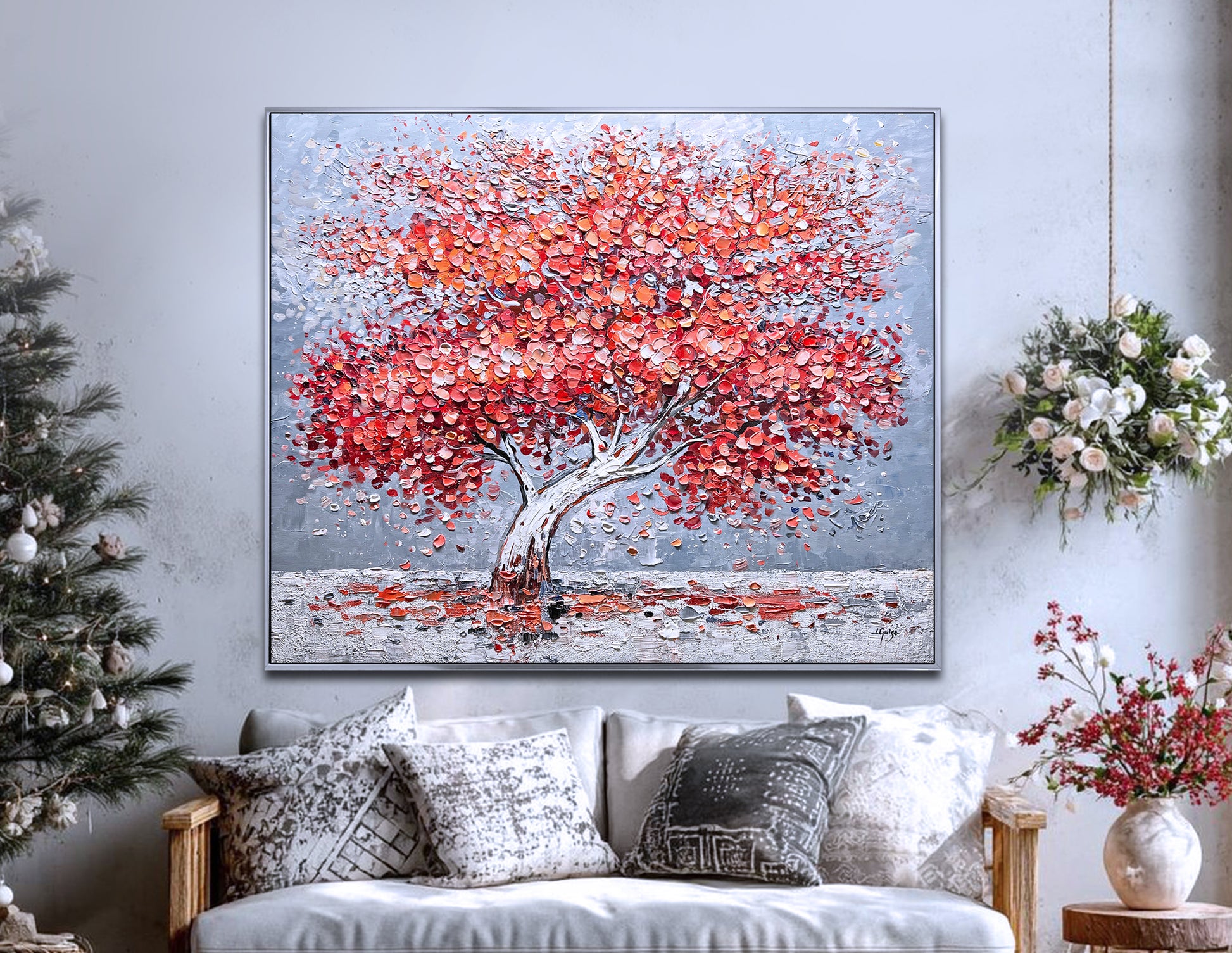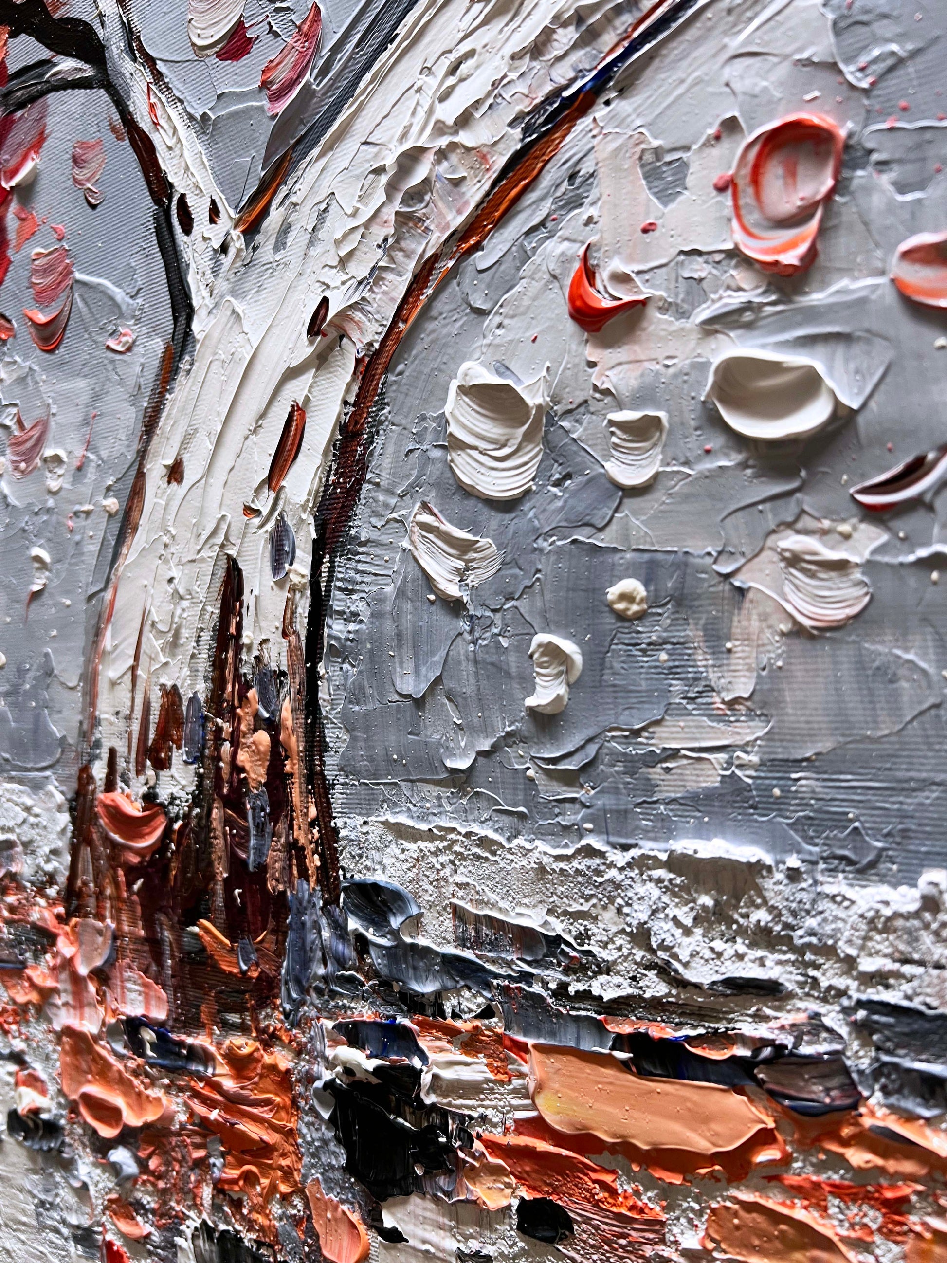 "Scarlet Tree" is a textured original painting created with bold, vibrant shades of red, balanced beautifully with soft greys and crisp whites.
