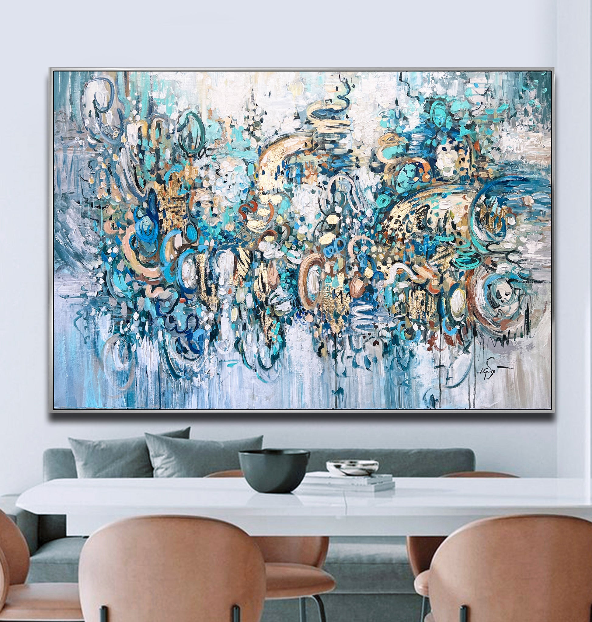 Consider a floating silver frame to showcase the canvas, its metallic sheen intensifying the blues’ sparkle and giving the piece a shimmering, breath-like movement when light hits it.