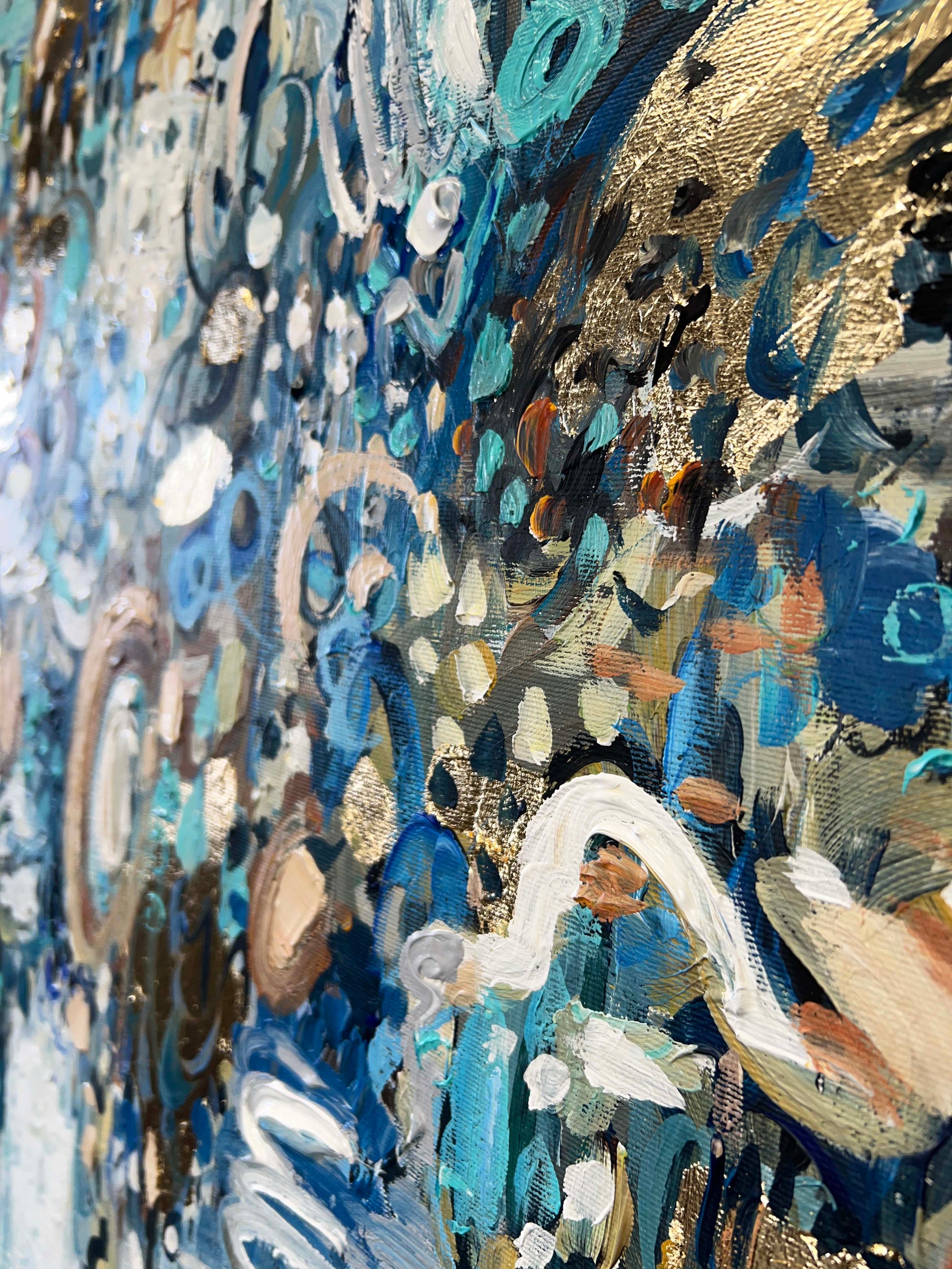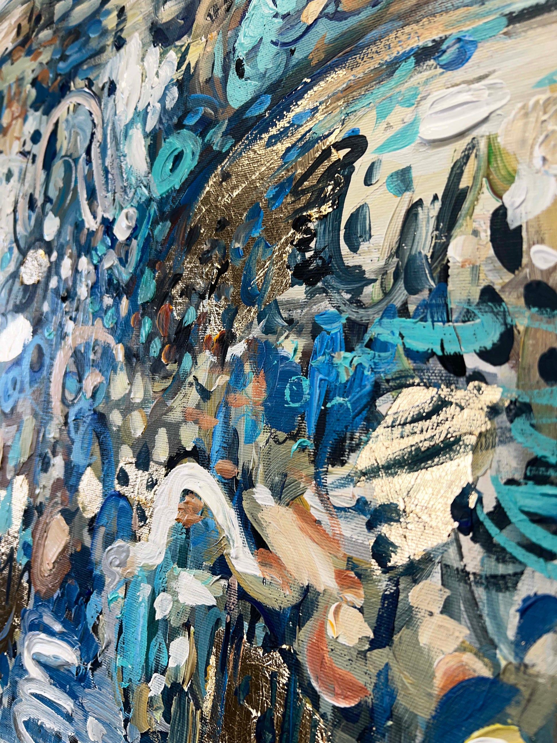 Think rich ultramarine, teal, and turquoise swirling together, with little bursts of gold shining through like hidden treasure.