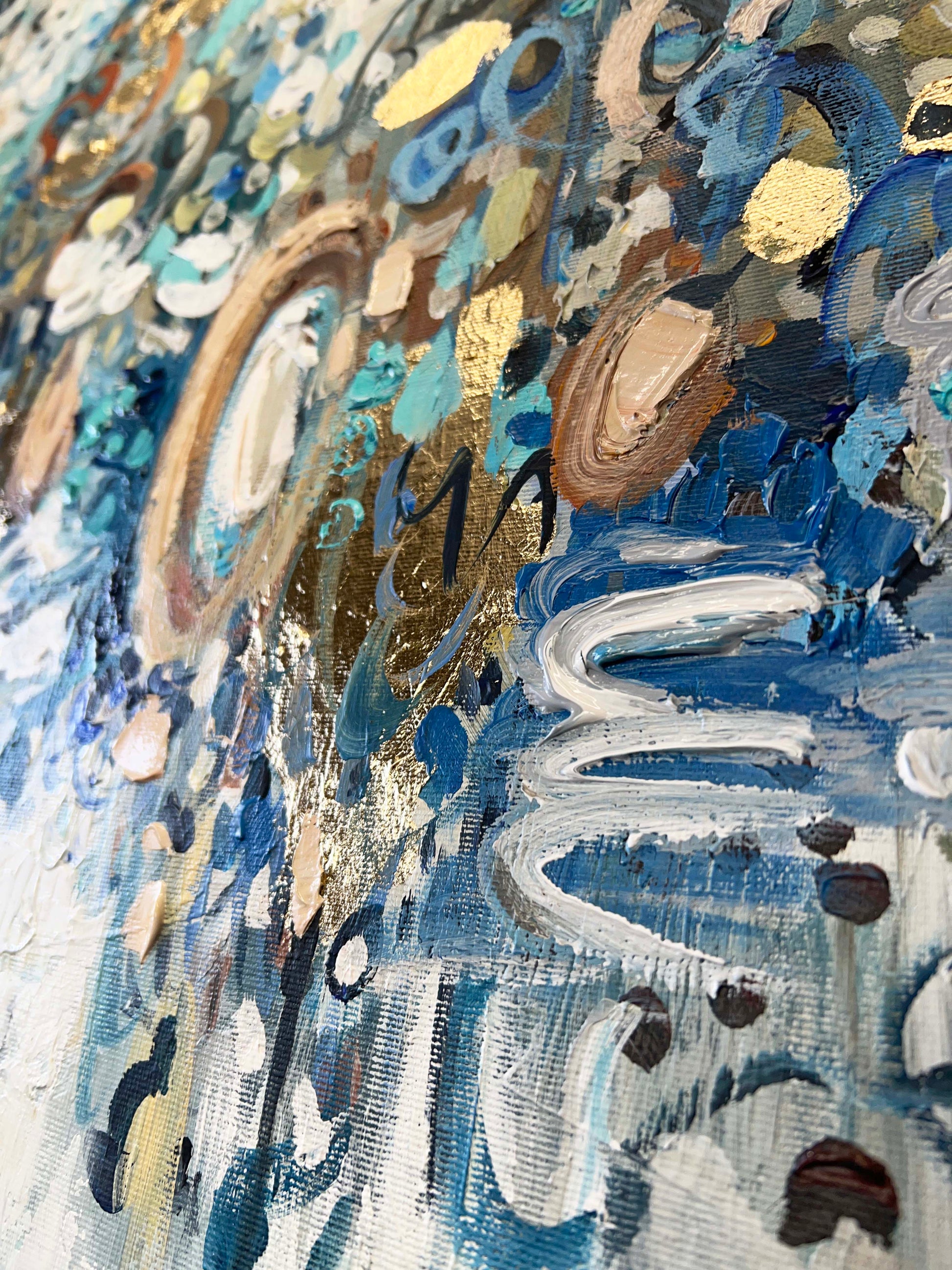 Up close, you can see thick ridges of paint catching the light, while softer, hazy strokes sit underneath to hint at deeper, quieter water.