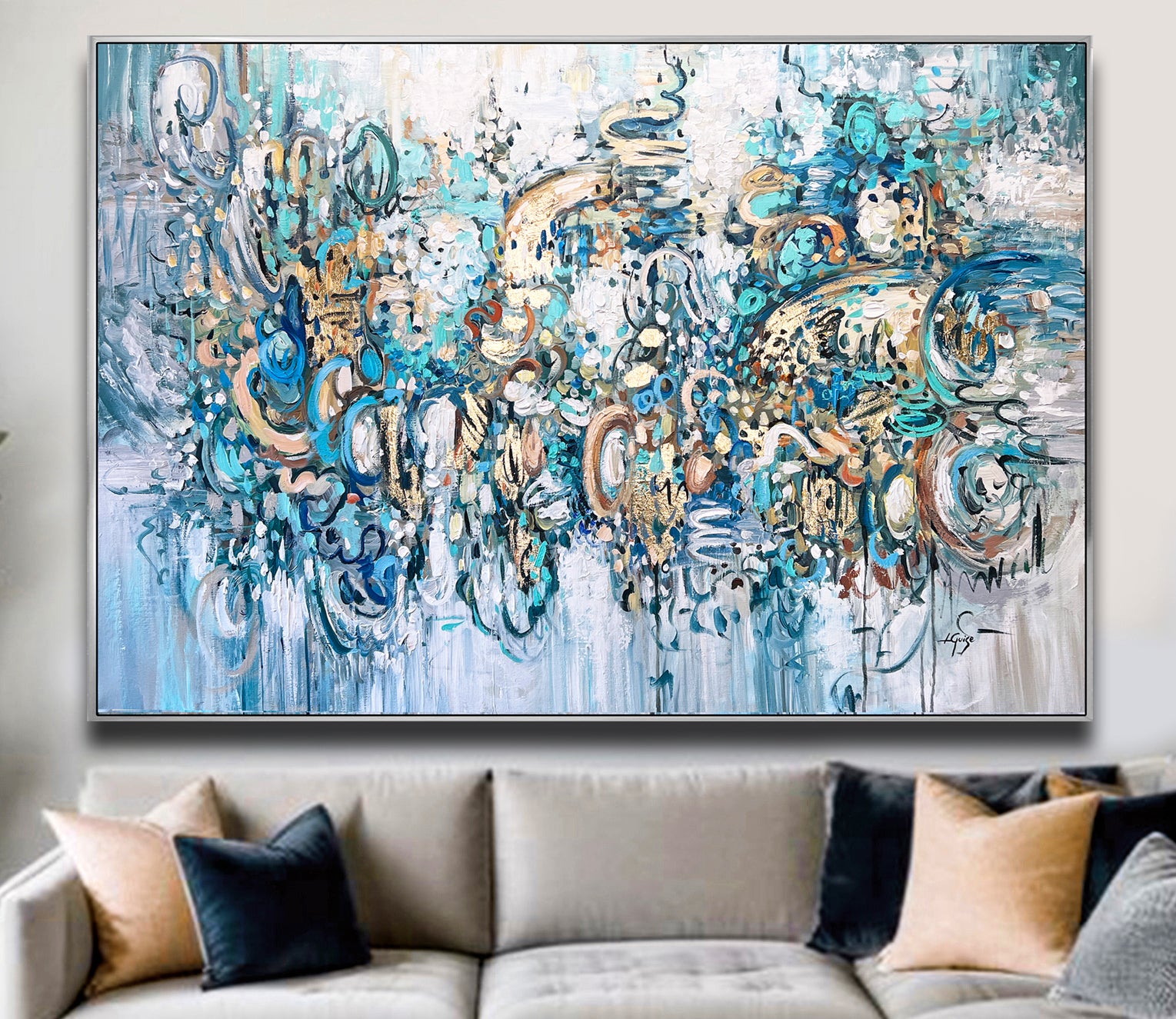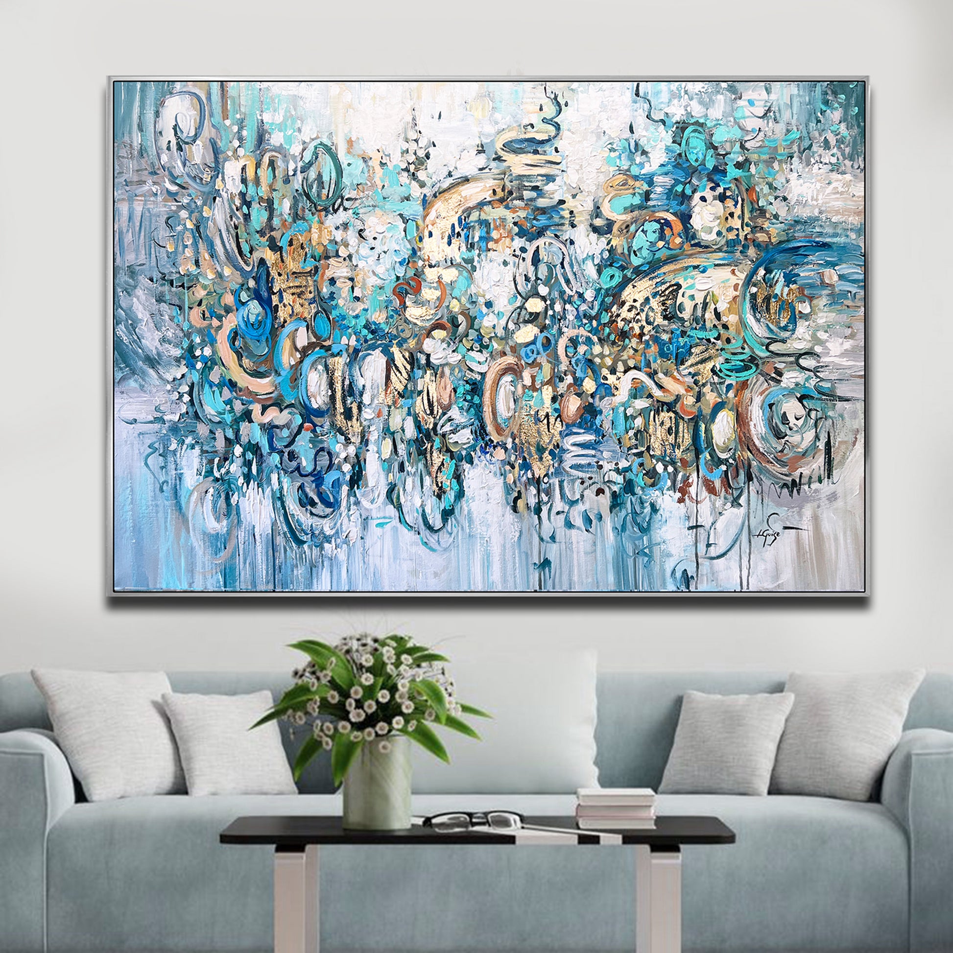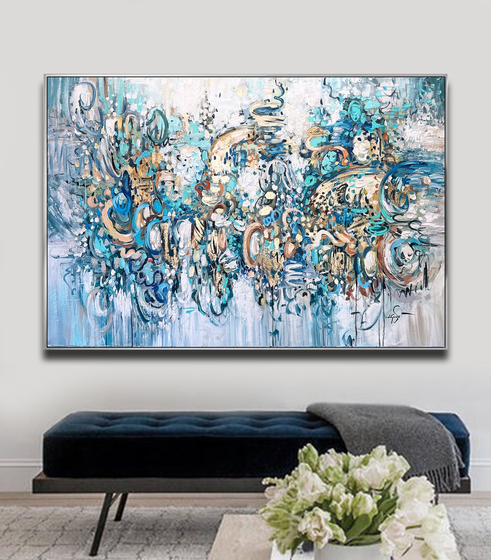 Consider a floating silver frame to showcase the canvas, its metallic sheen intensifying the blues’ sparkle and giving the piece a shimmering, breath-like movement when light hits it.