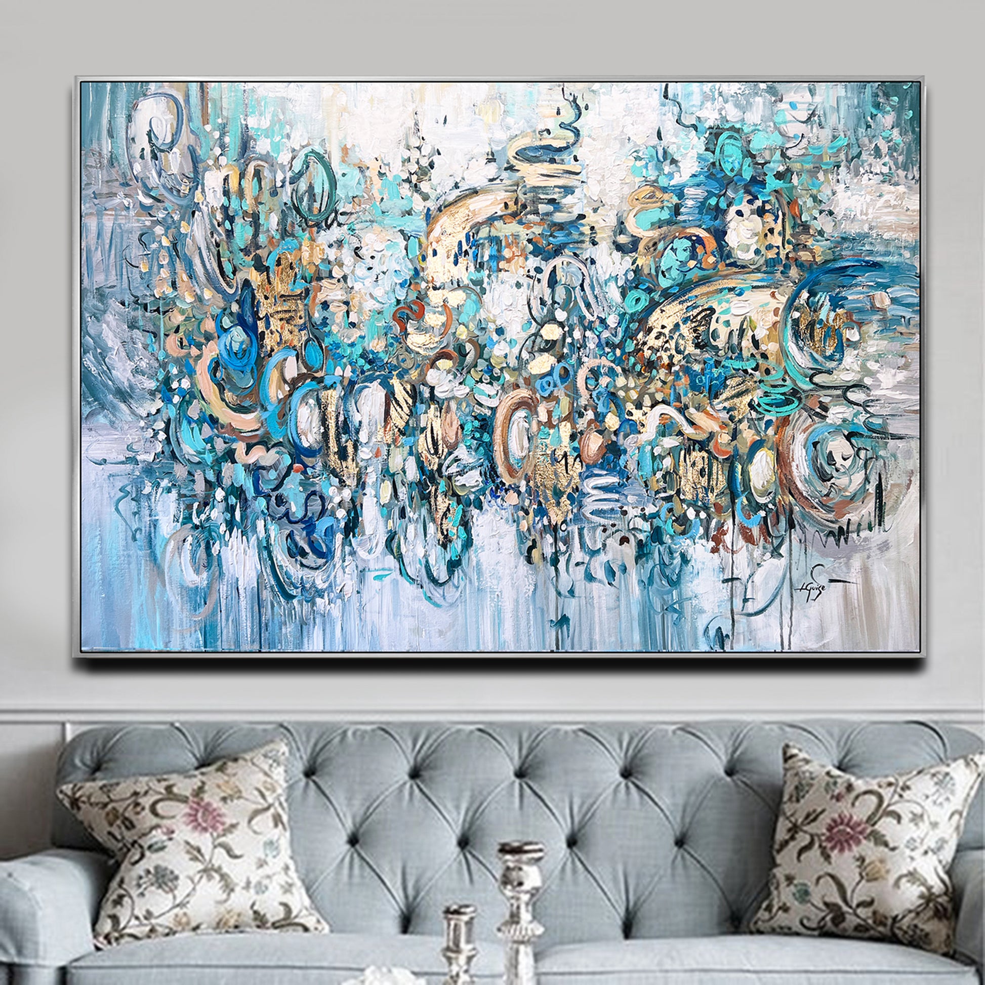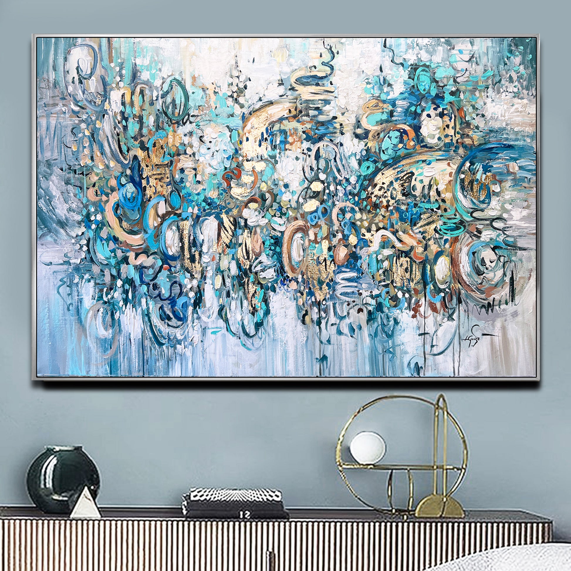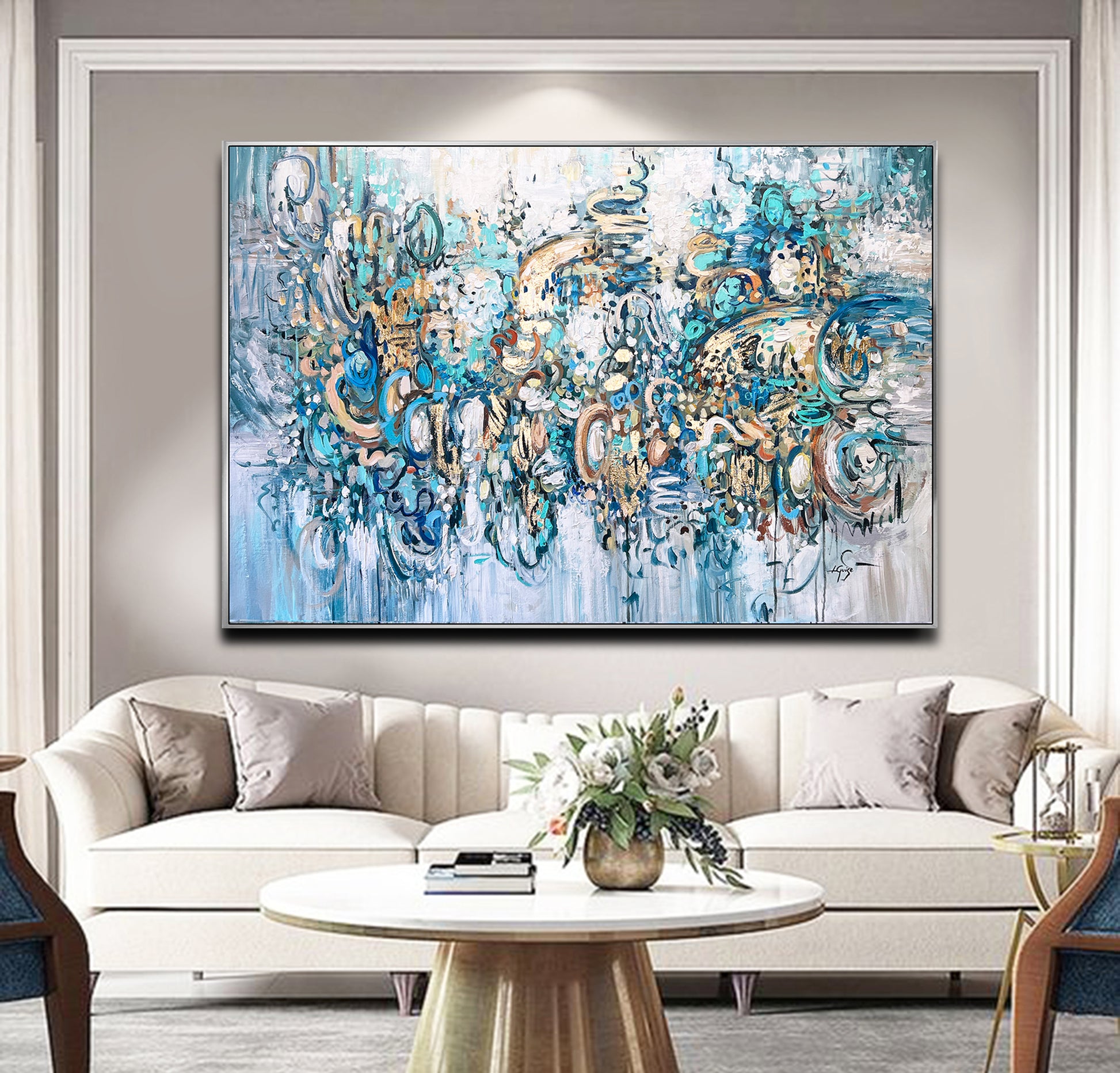 Consider a floating silver frame to showcase the canvas, its metallic sheen intensifying the blues’ sparkle and giving the piece a shimmering, breath-like movement when light hits it.
