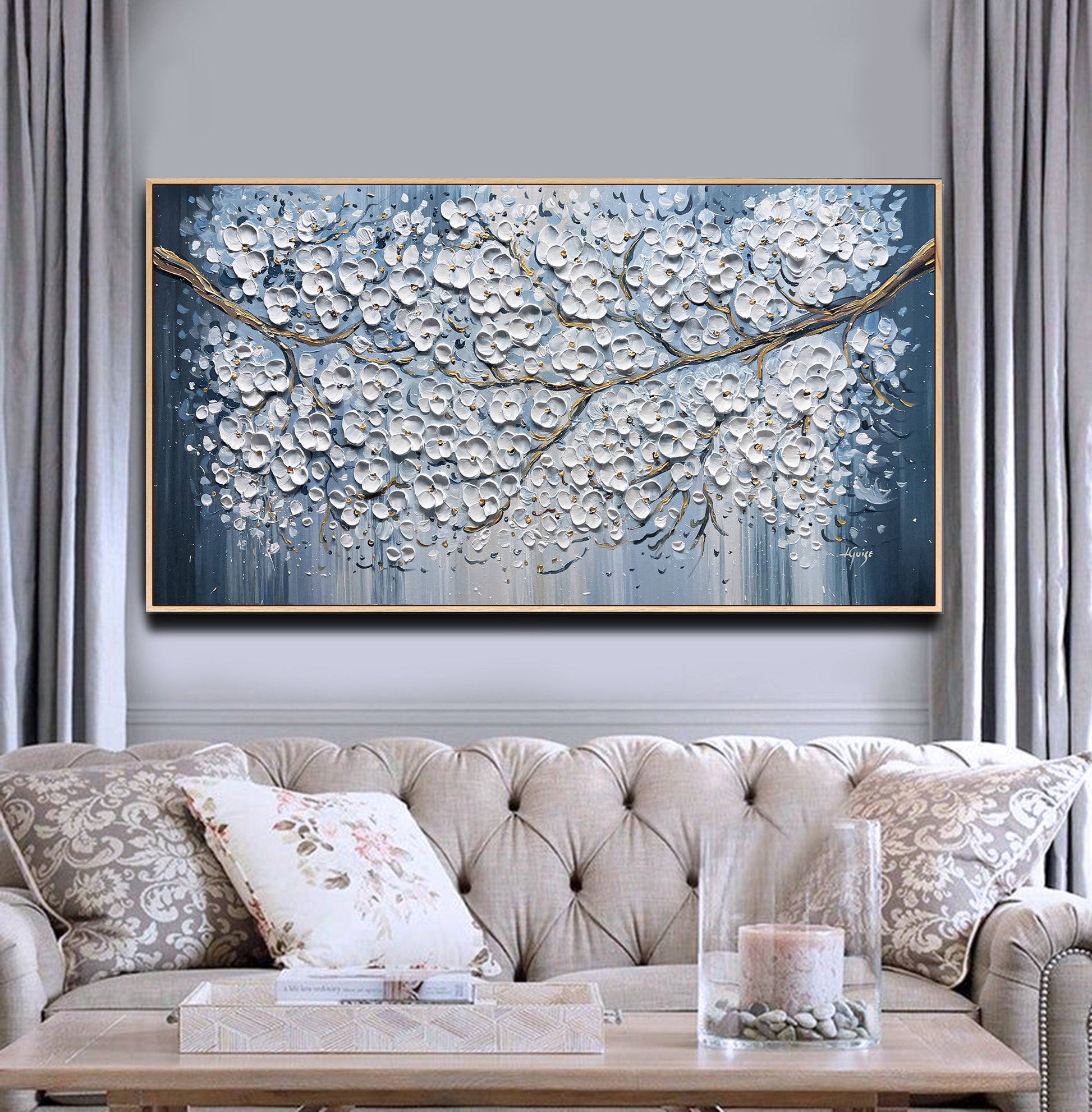 The ethereal beauty of the White Flowers against the subtle hues of Grey and Blue creates a captivating focus that effortlessly draws the eye and sparks conversation.