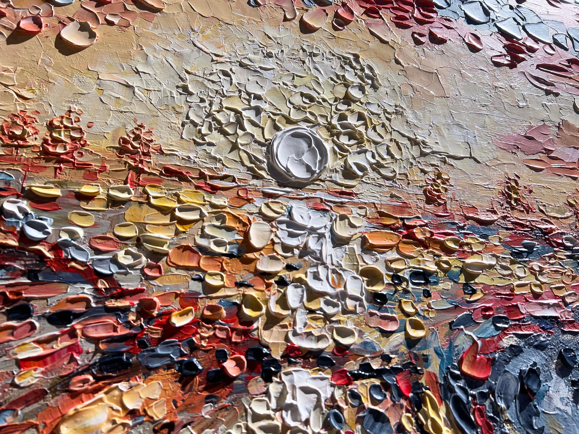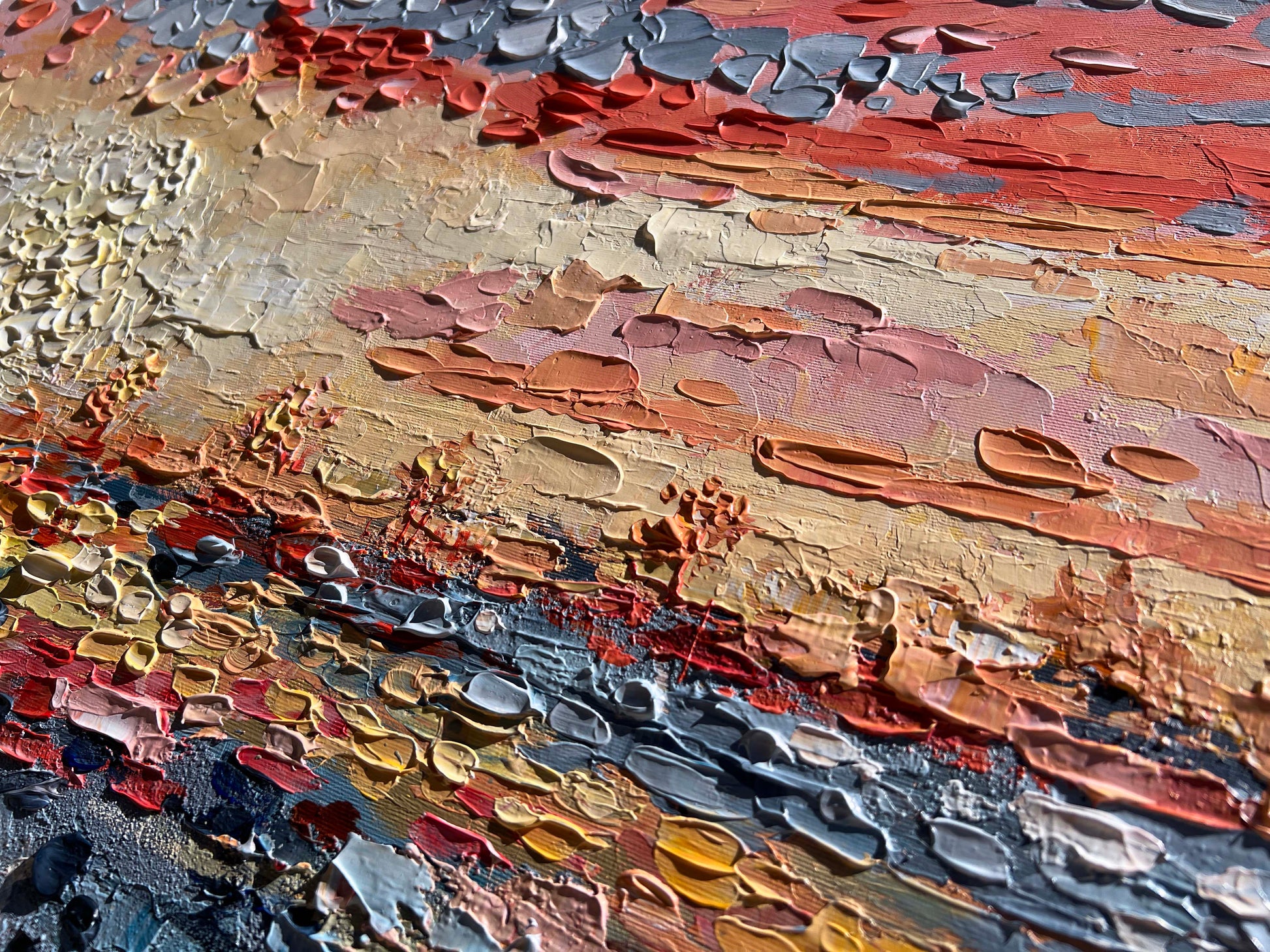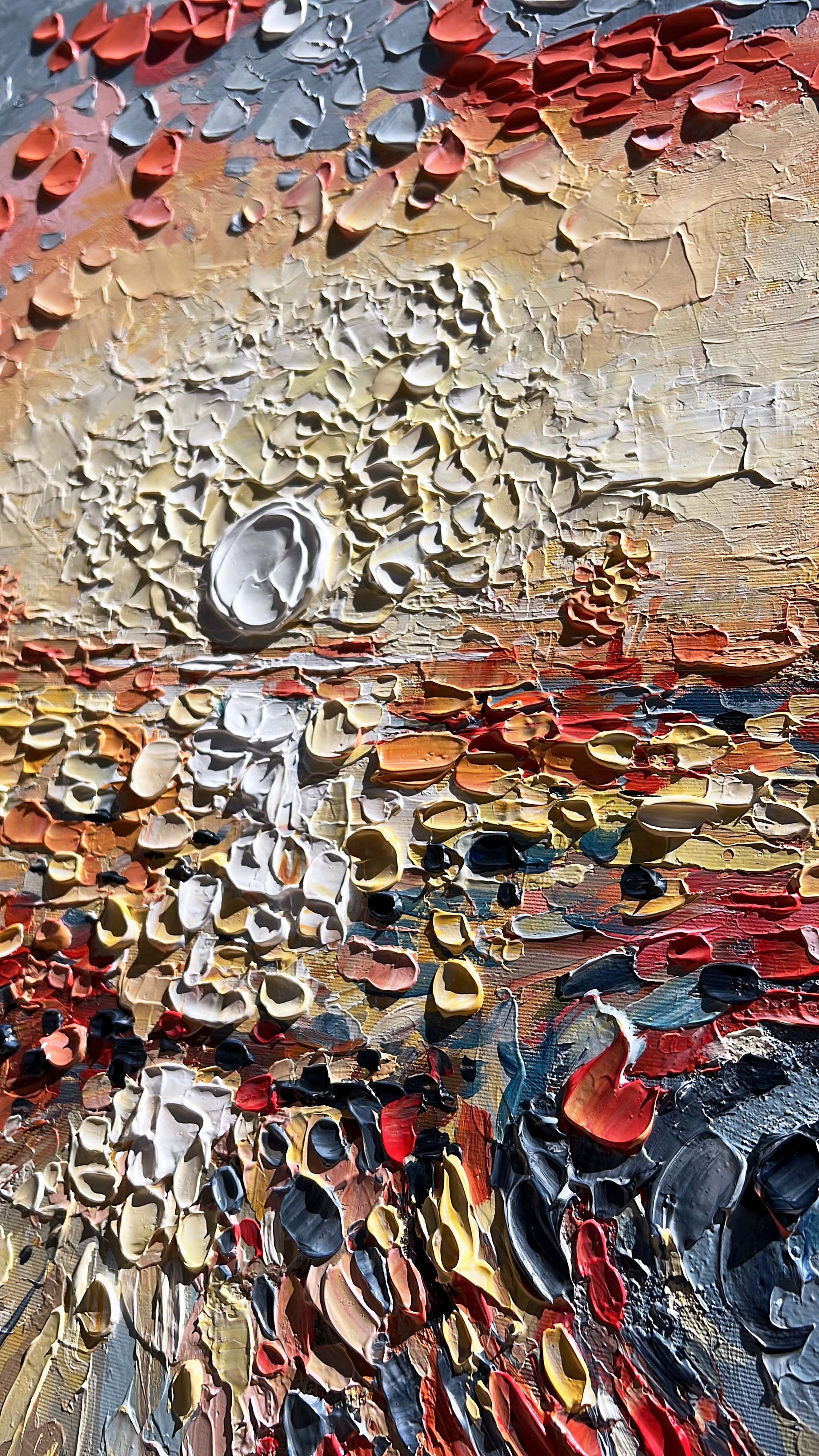 This textured painting captures the breathtaking moment when the sun rises to meet the earth, flooding the landscape with warmth and light. Vibrant strokes of gray and red intertwine — a dance between cold and warm tones — creating a striking balance of contrast and harmony. The sculptural layers of paint give depth and movement, making the sunrise feel alive as it illuminates every corner of the scene.