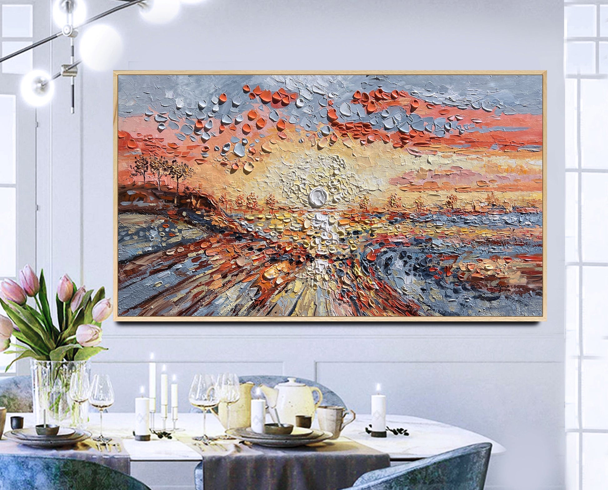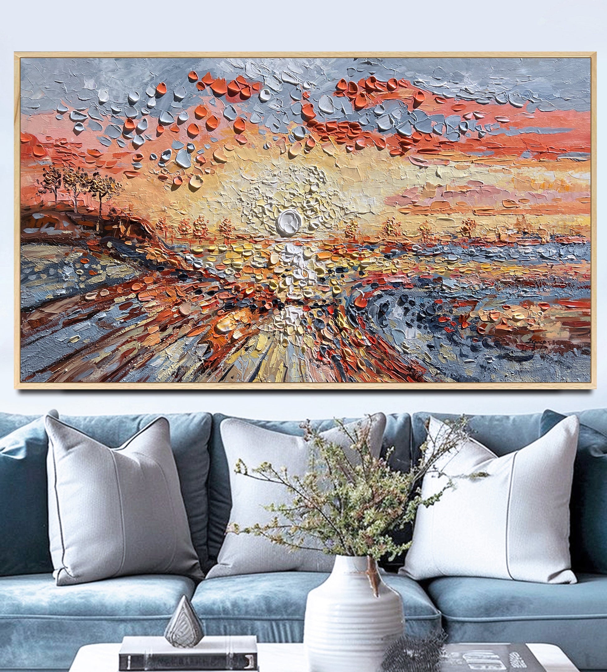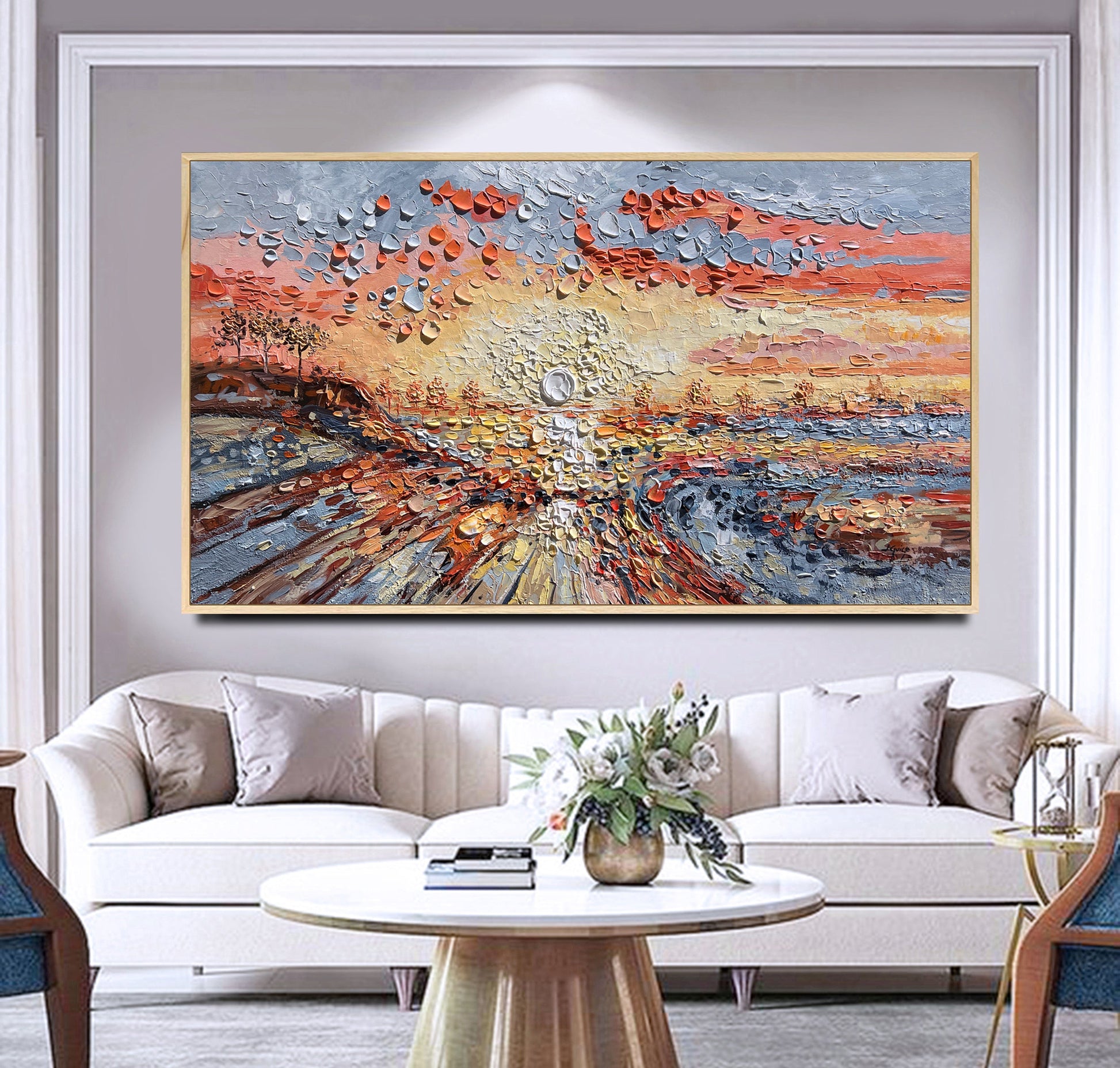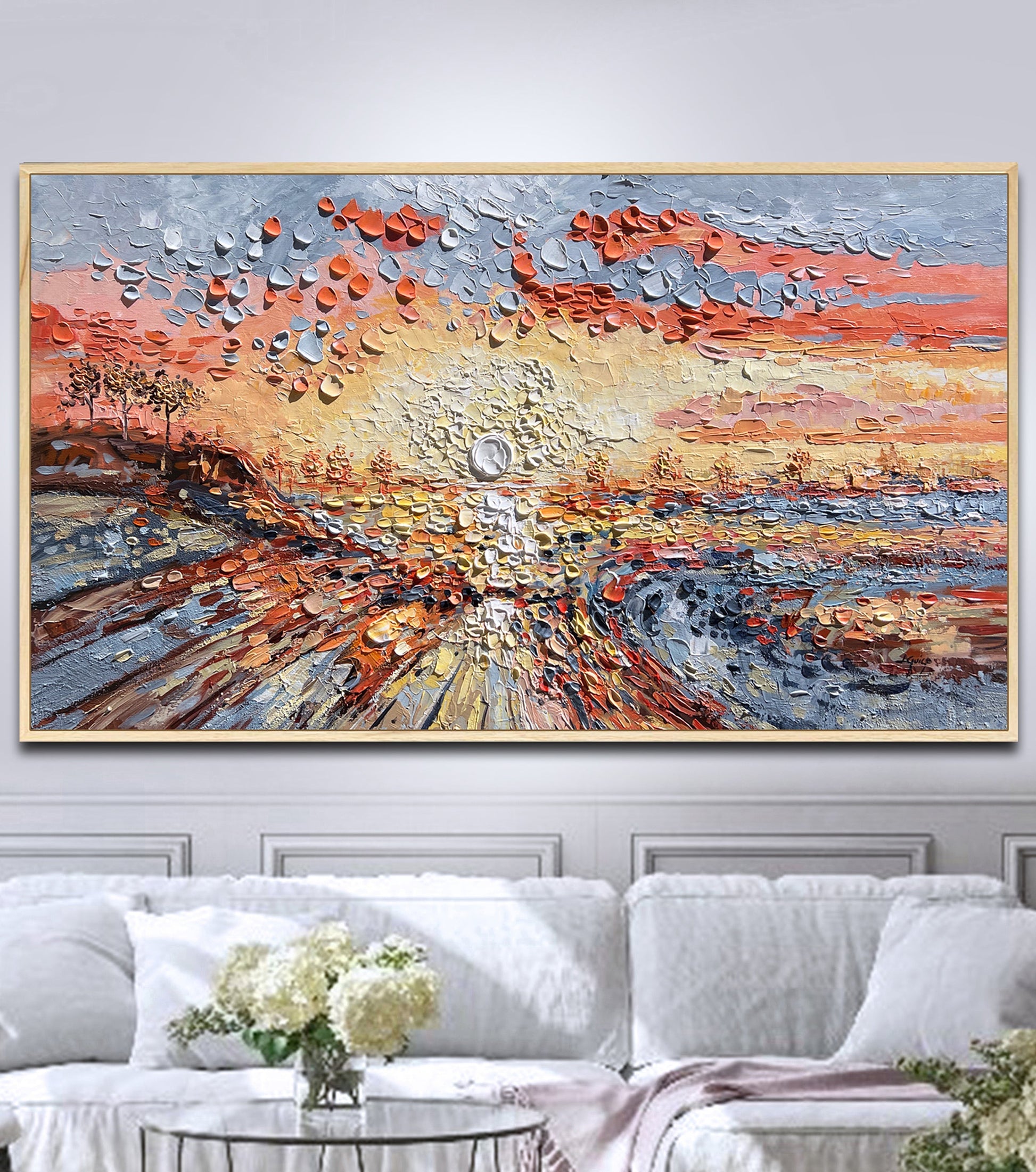 This textured painting captures the breathtaking moment when the sun rises to meet the earth, flooding the landscape with warmth and light. Vibrant strokes of gray and red intertwine — a dance between cold and warm tones — creating a striking balance of contrast and harmony. The sculptural layers of paint give depth and movement, making the sunrise feel alive as it illuminates every corner of the scene.