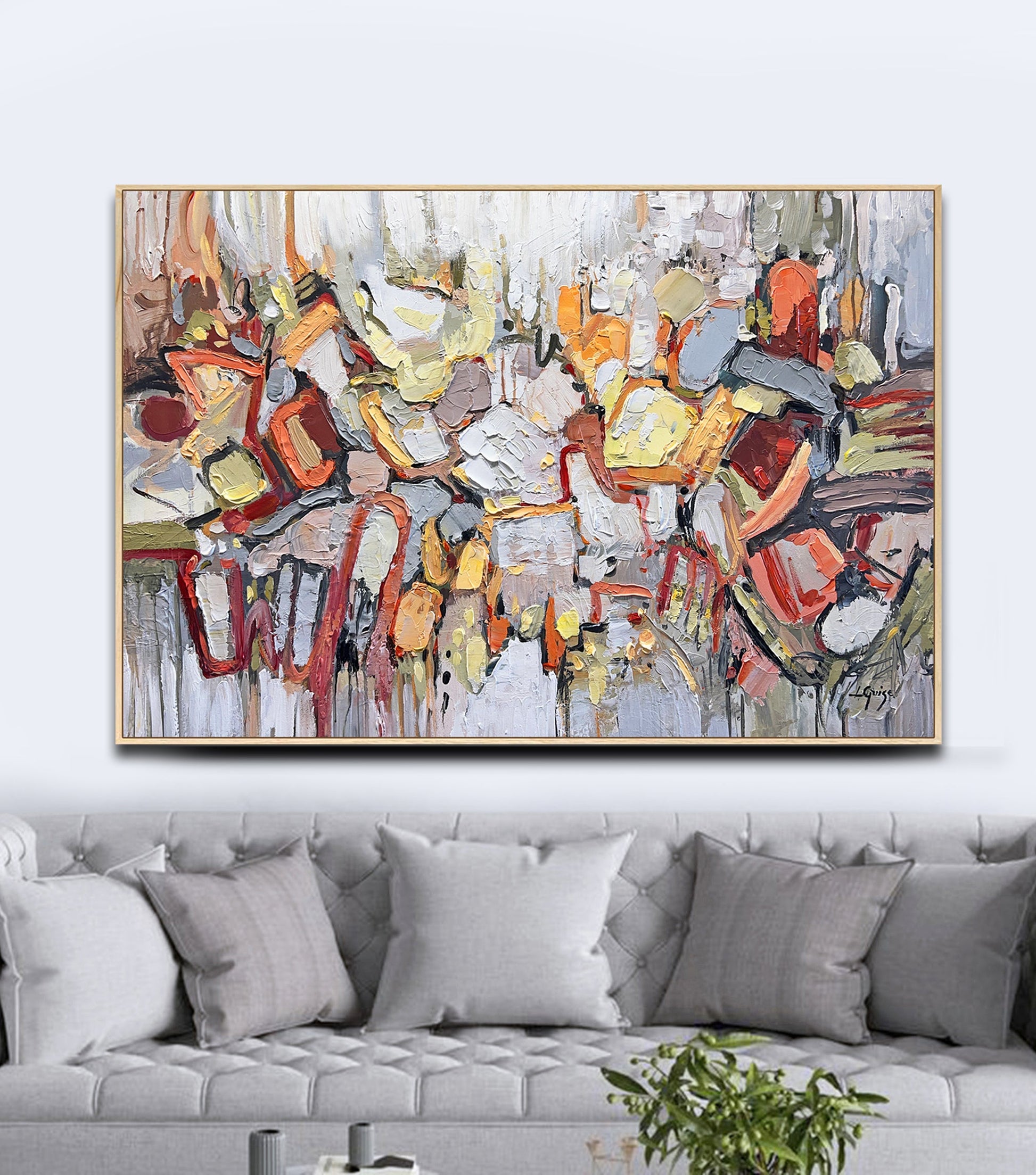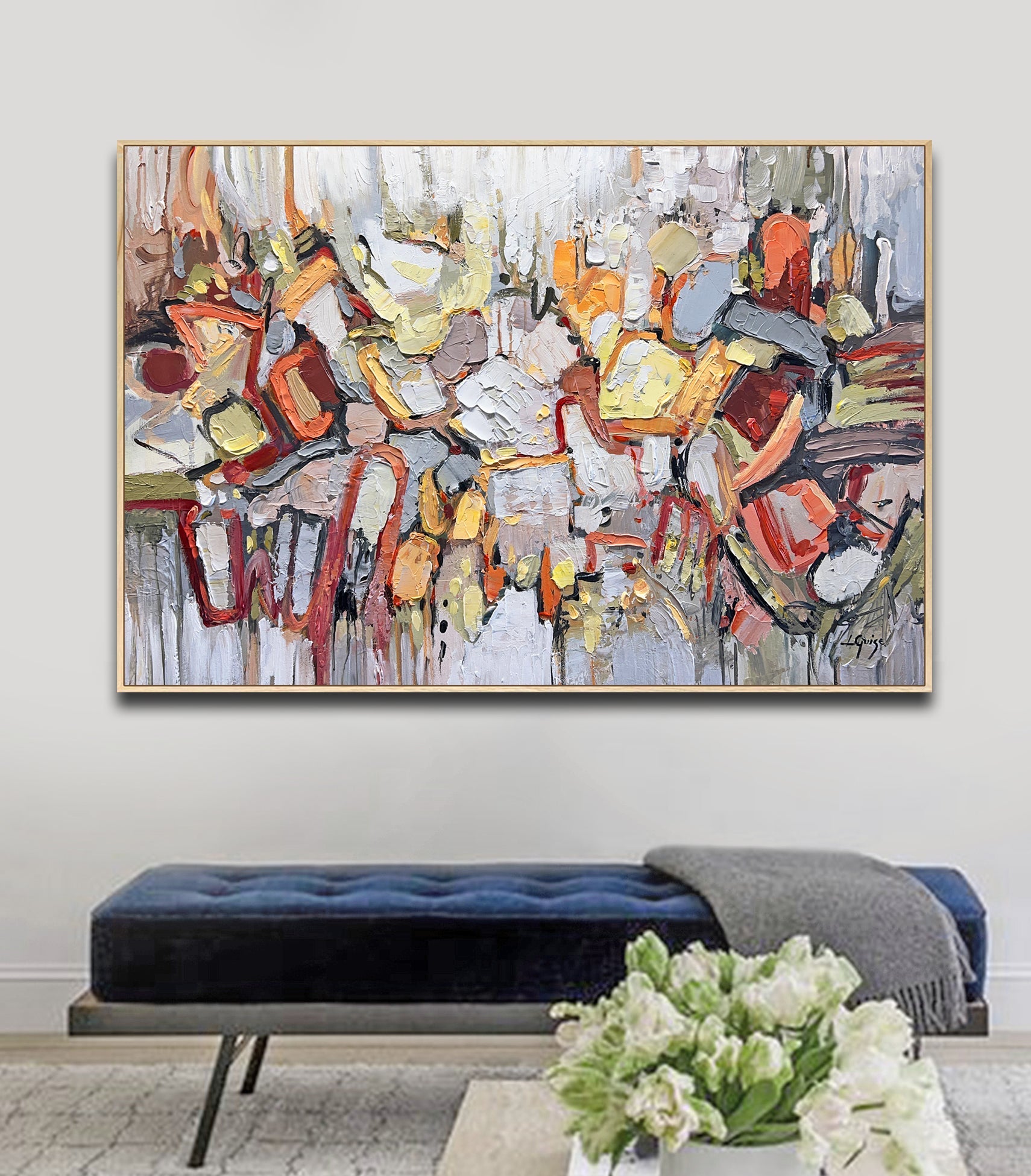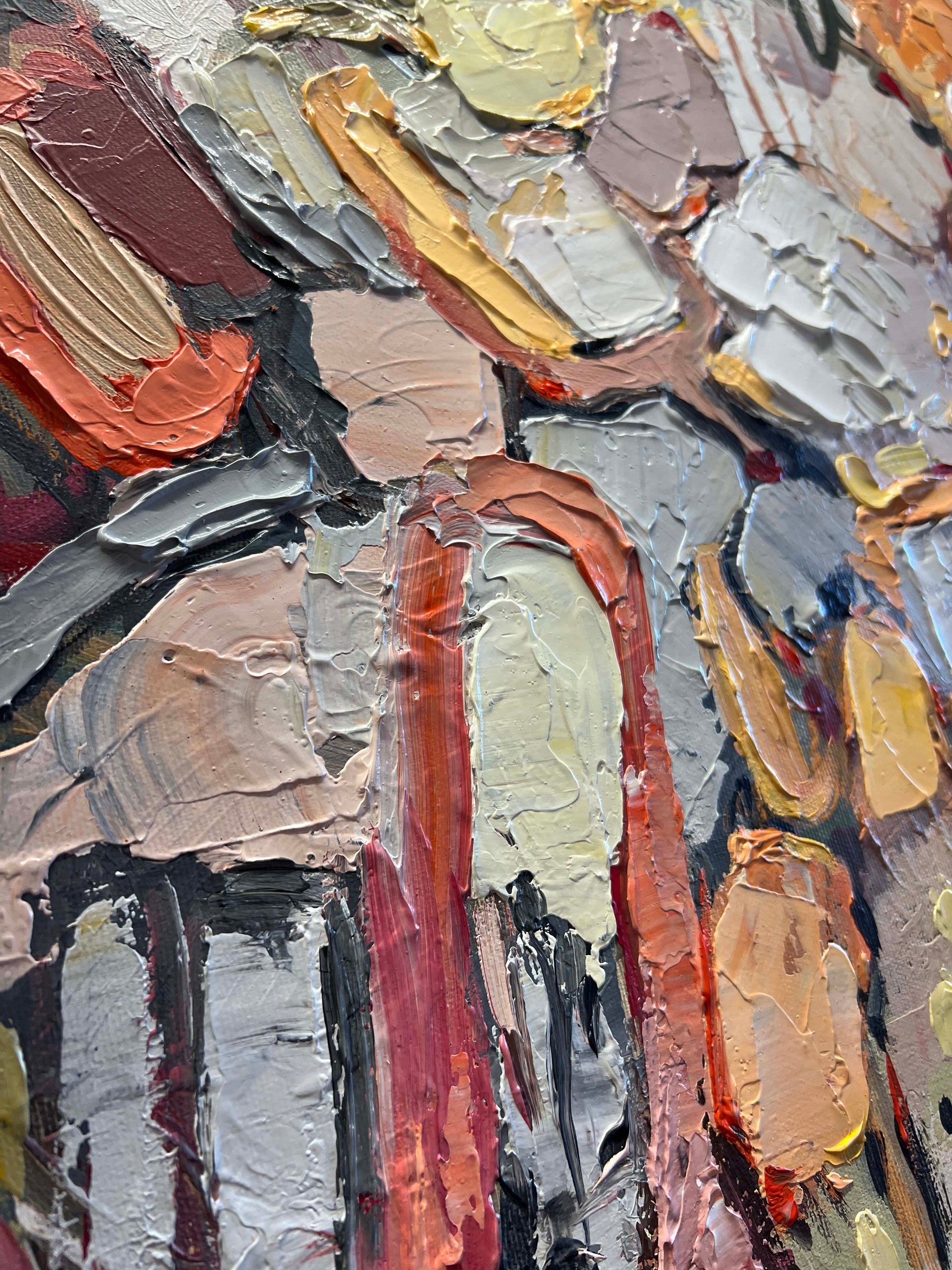 Thick, textured strokes of gold, burnt orange, and deep crimson intertwine with cooler greys and muted neutrals, creating a sense of vibrant movement and layered depth.