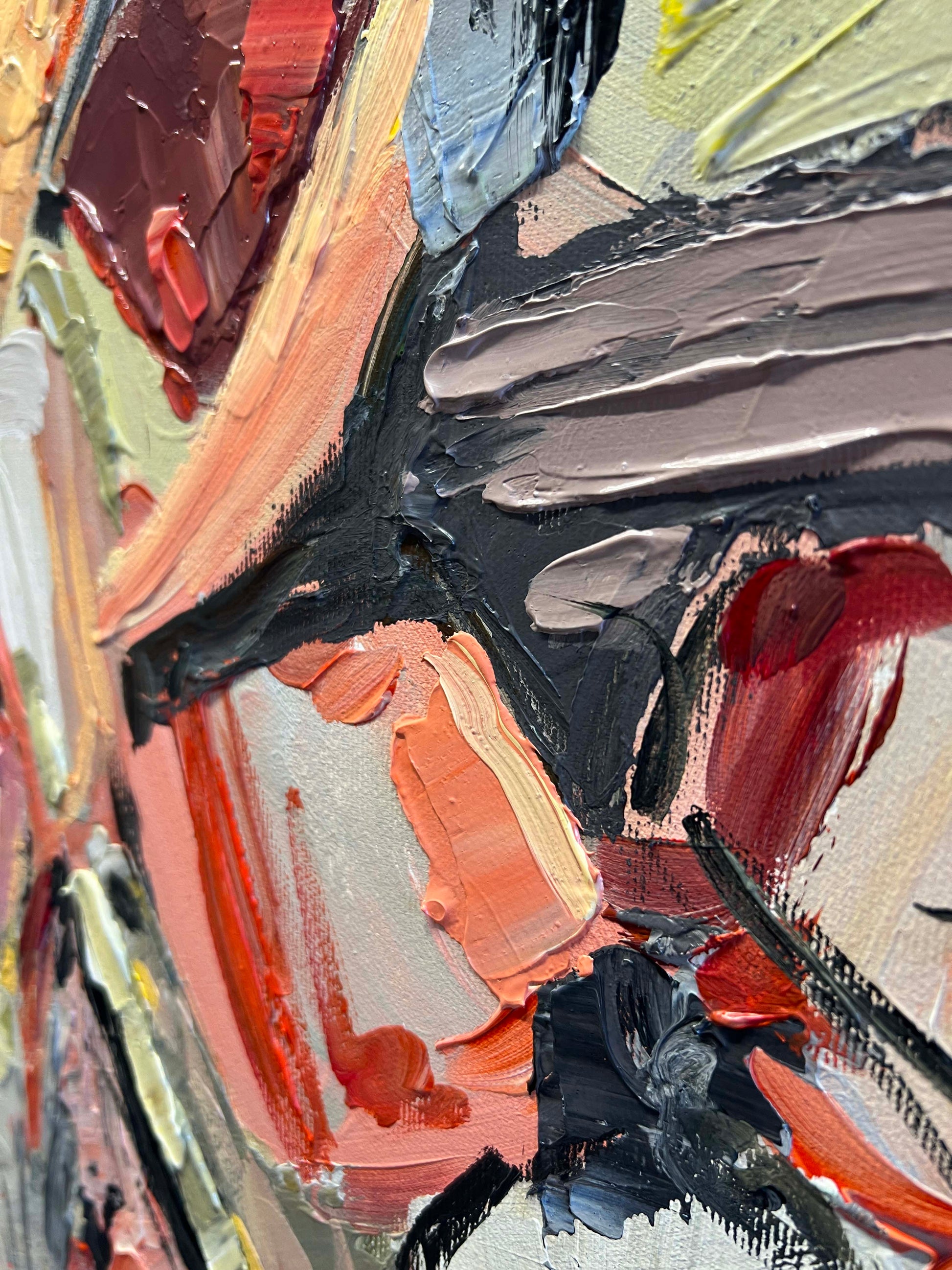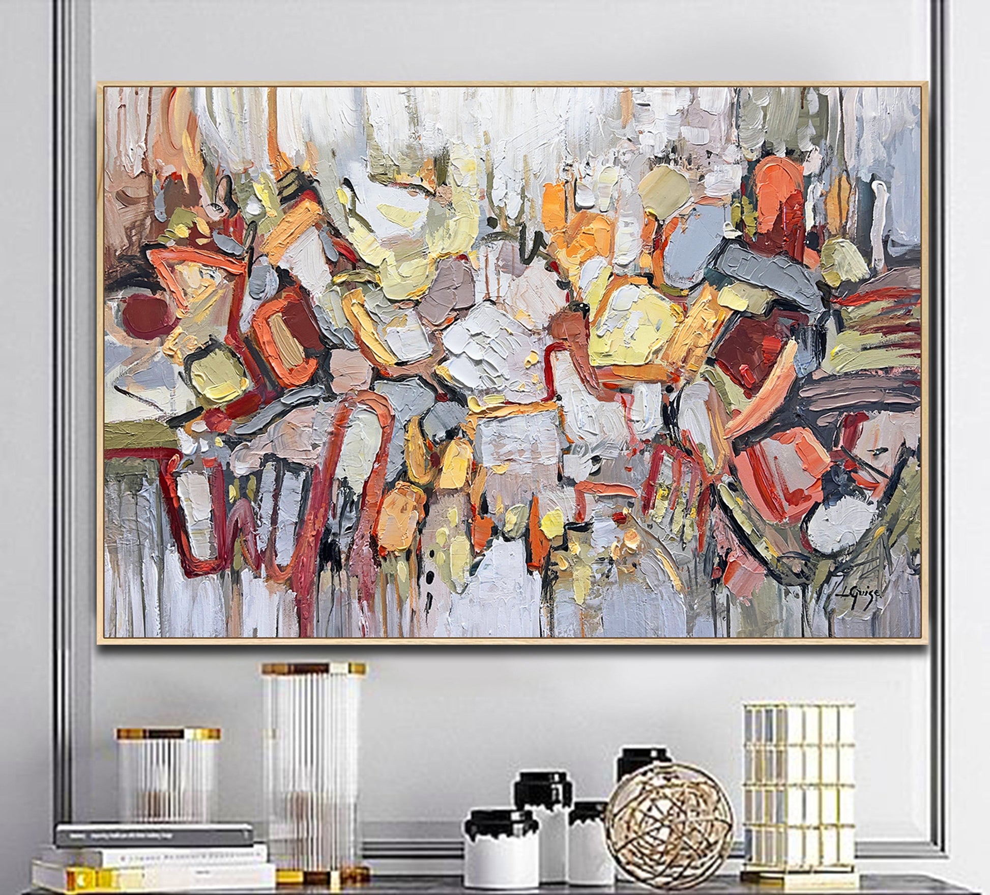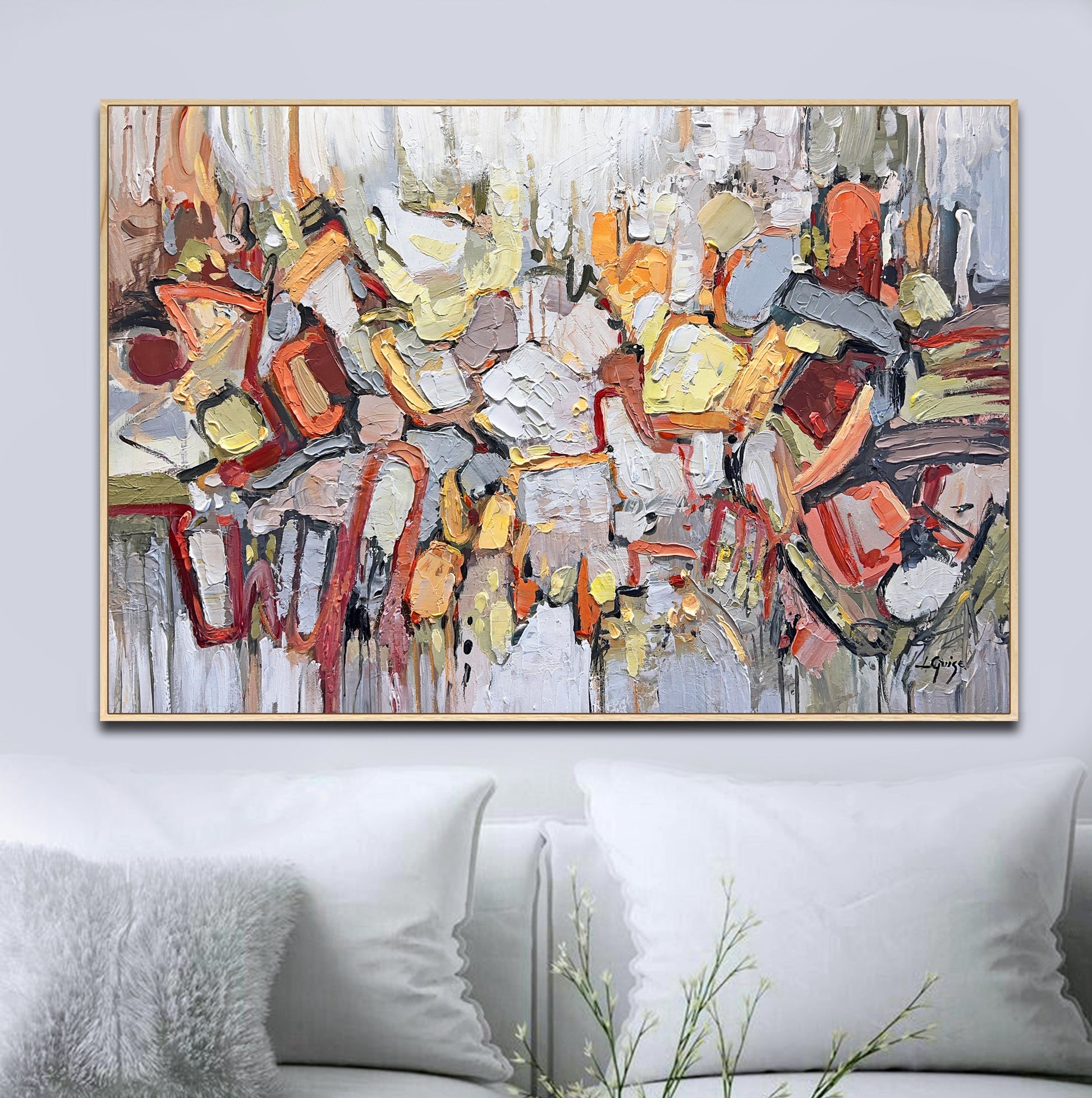 Thick, textured strokes of gold, burnt orange, and deep crimson intertwine with cooler greys and muted neutrals, creating a sense of vibrant movement and layered depth.
