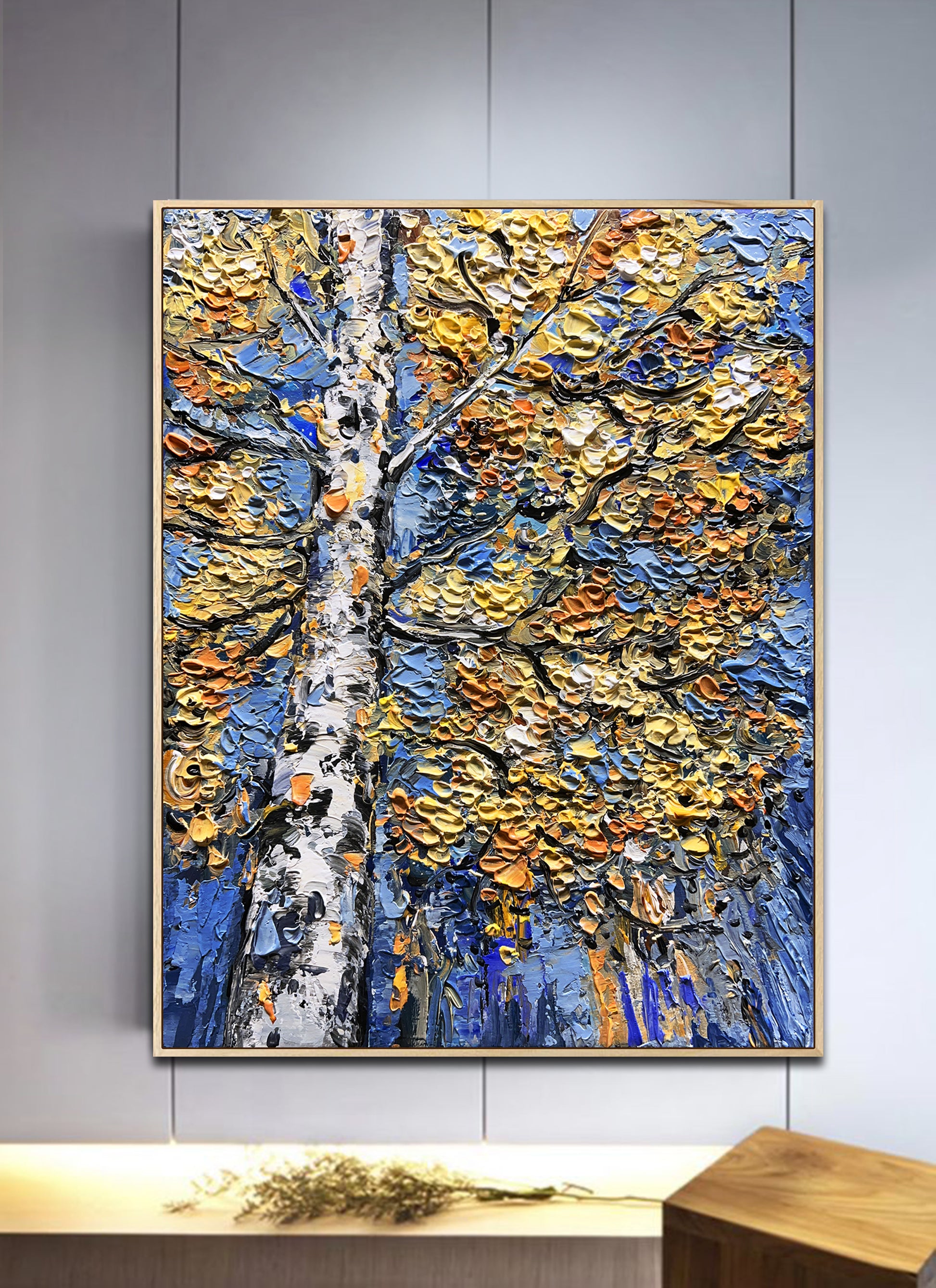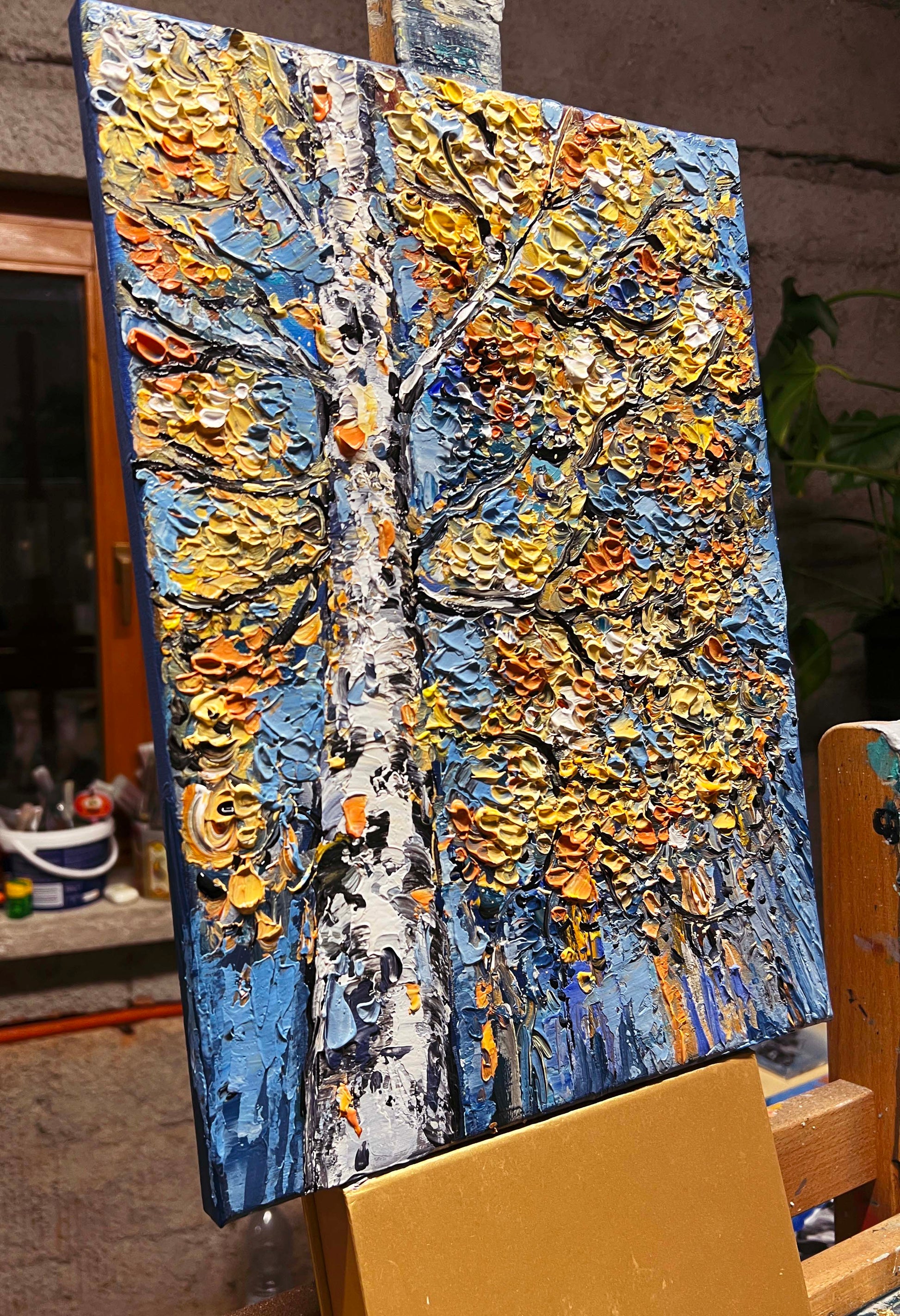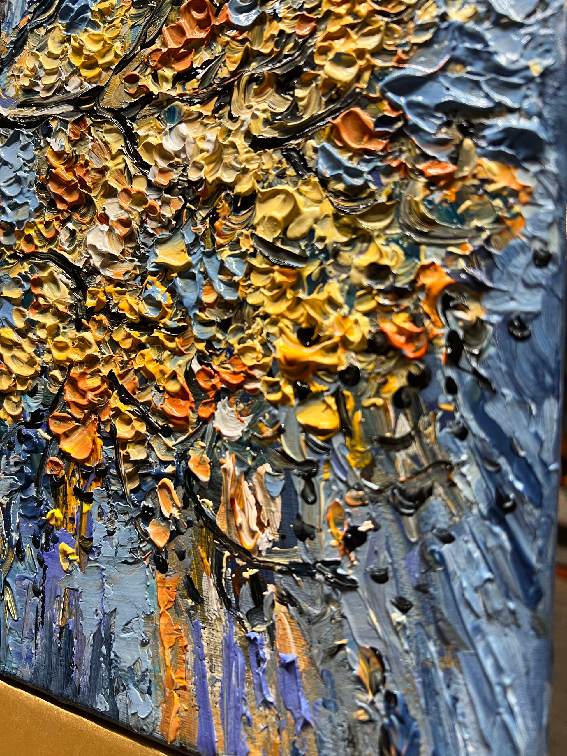 Thick, expressive palette-knife strokes create a rich, sculptural texture, giving the painting a sense of movement and depth that feels both grounded and luminous.