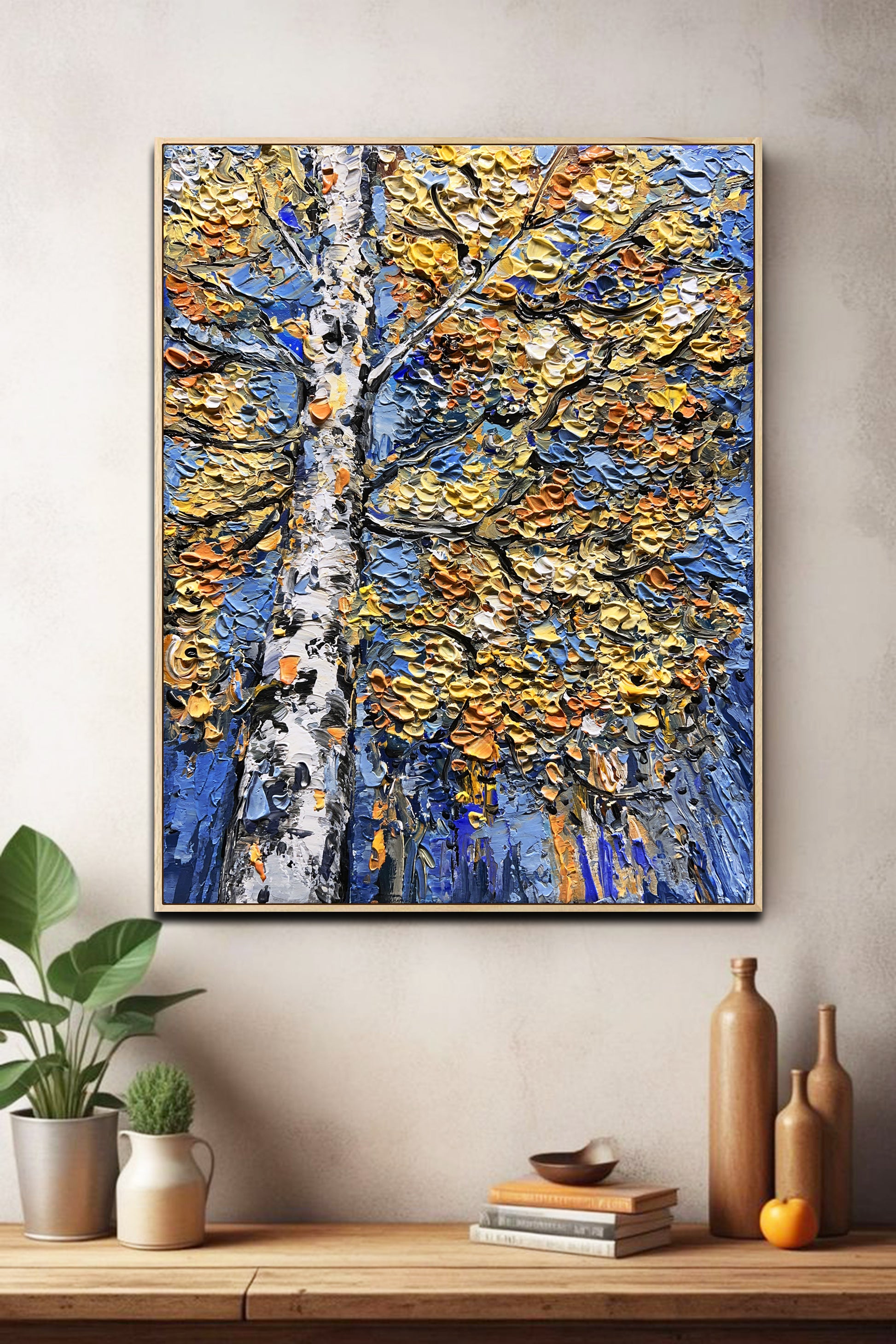 Framed in natural wood, the artwork feels organic and timeless. The wooden frame enhances the warmth of the amber tones and brings a sense of harmony and earthiness to the composition.