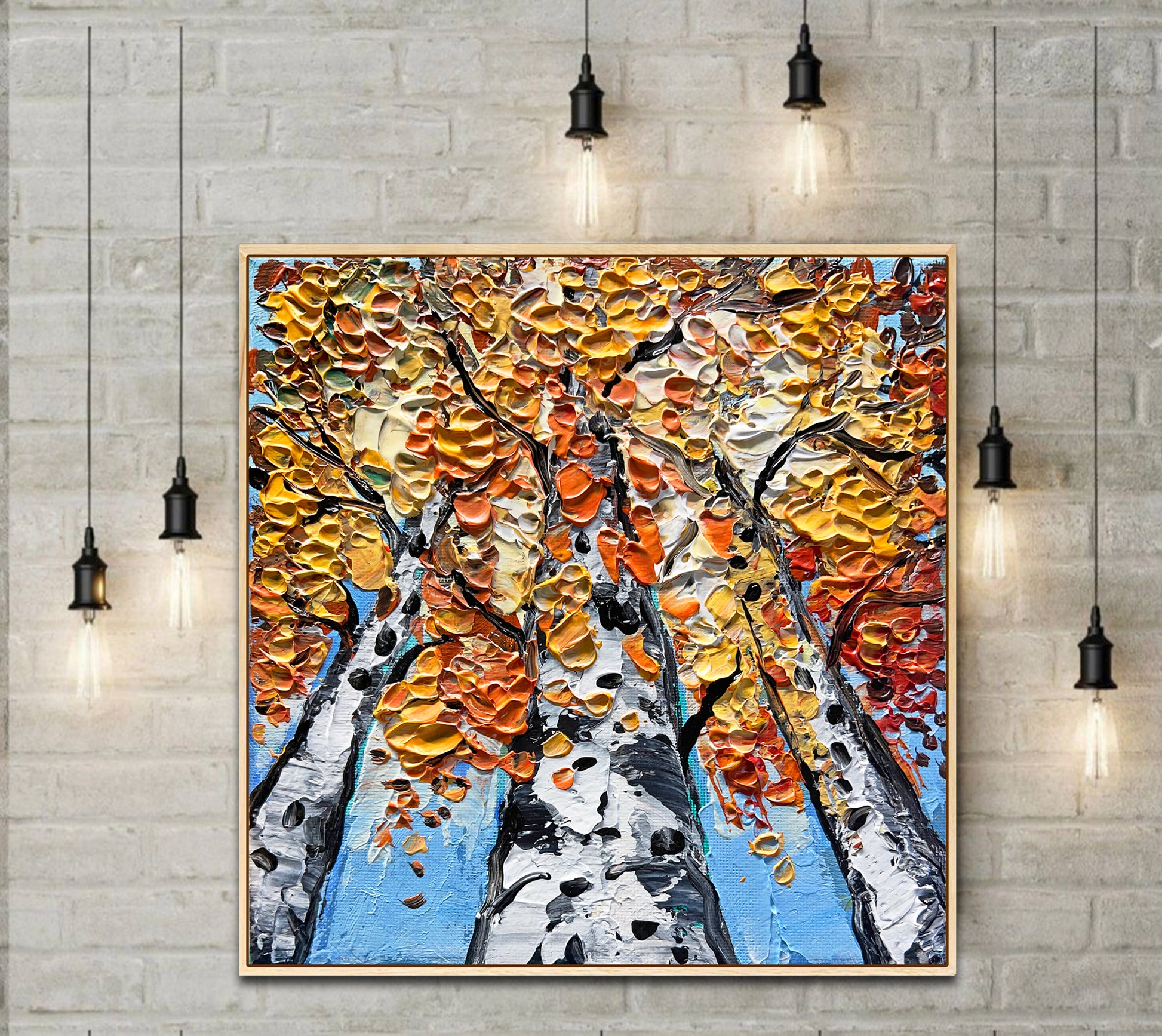 "Birch Collection" features six vibrant 20 × 20 cm (8 × 8 inch) palette-knife paintings, best complemented by a natural wooden frame that enhances their texture and warmth.