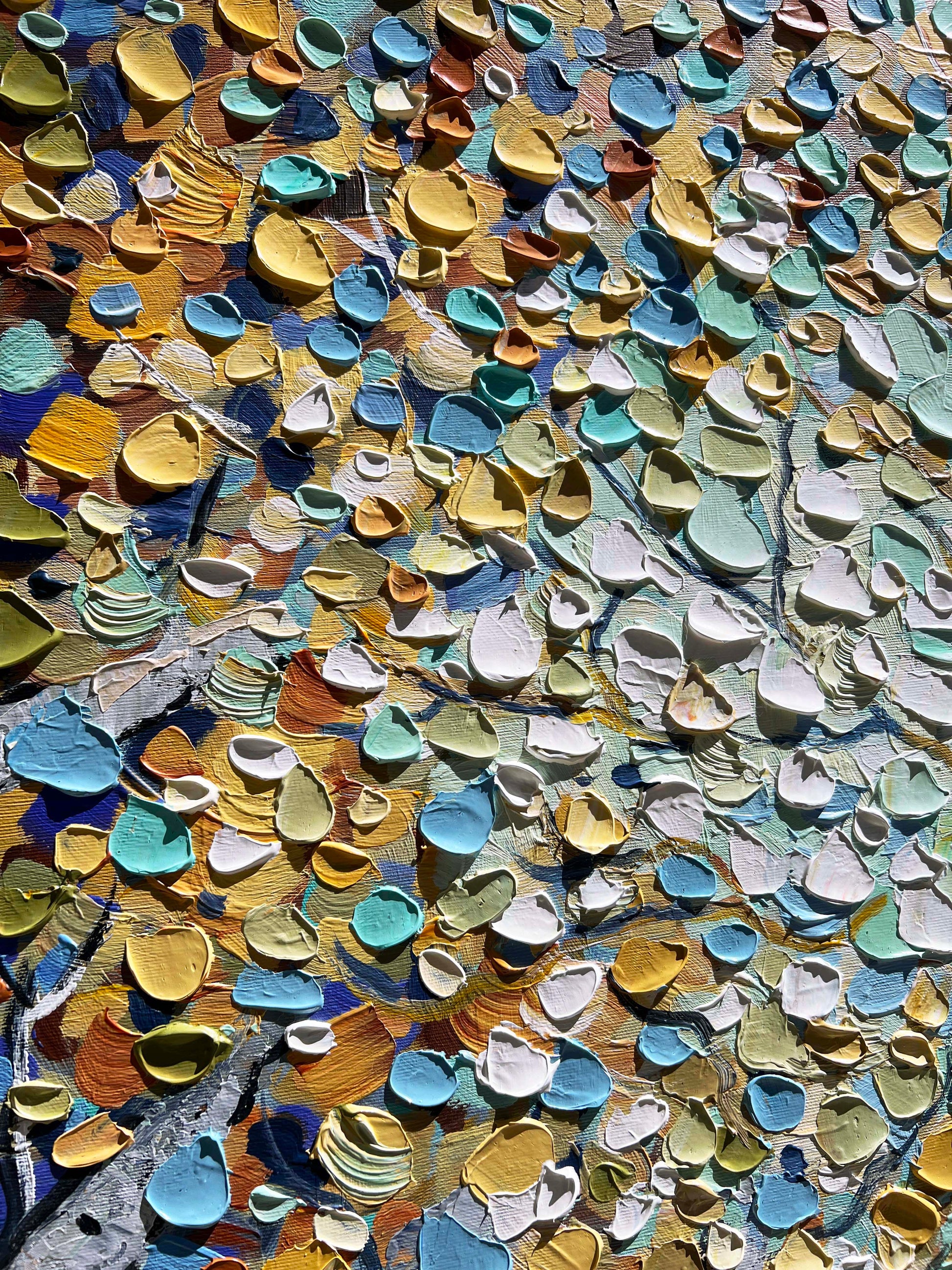 Thick, expressive brushstrokes give the painting a vivid sense of movement and depth, while sunlight filtering through the foliage evokes serenity, wonder, and the quiet majesty of nature.