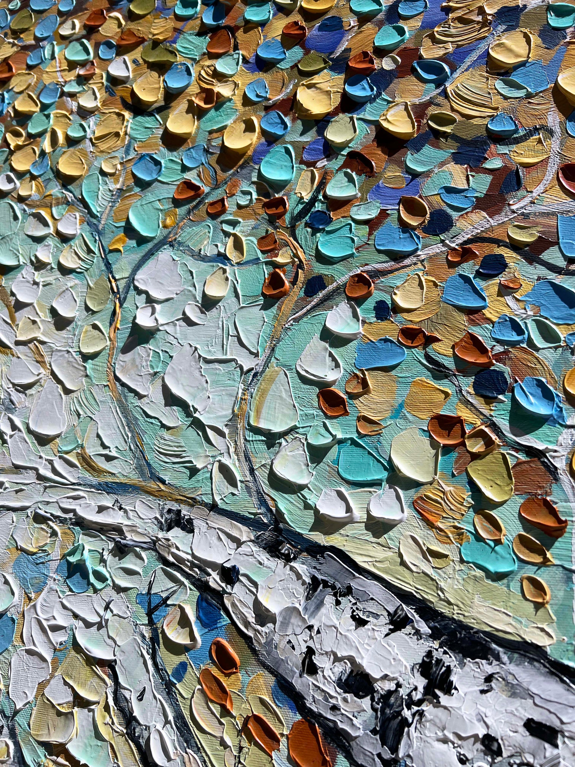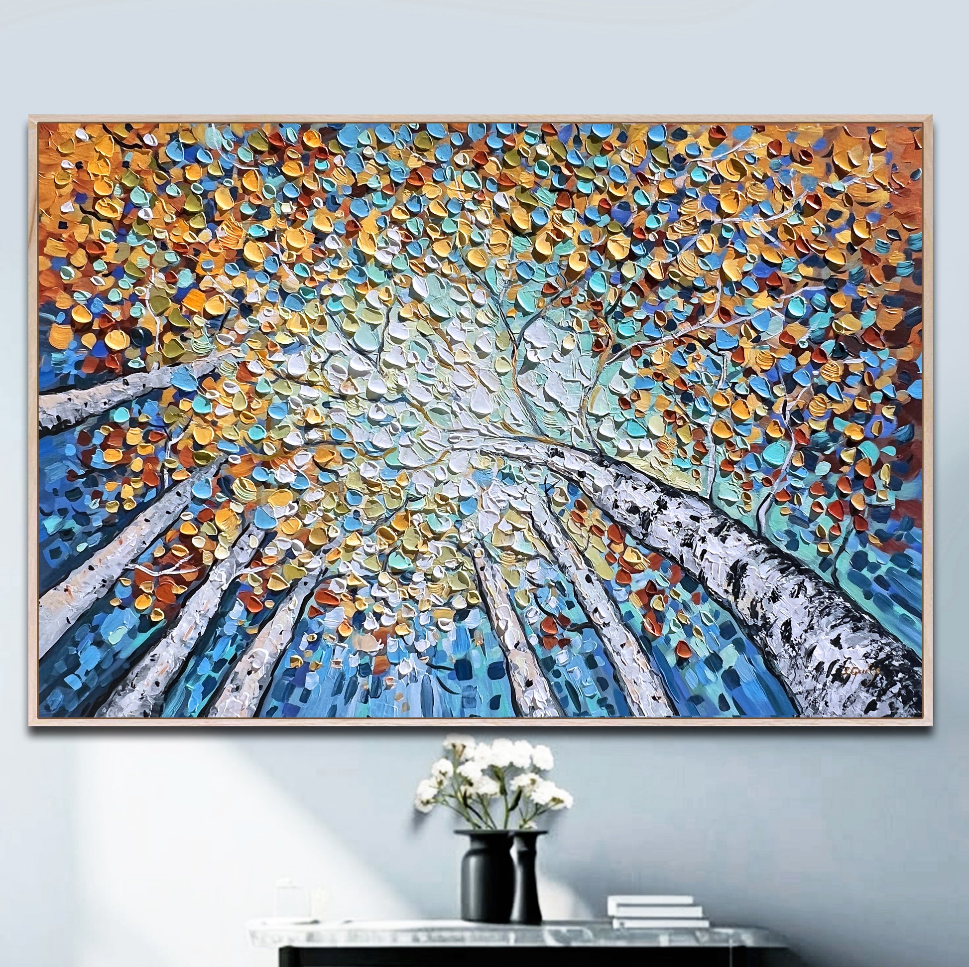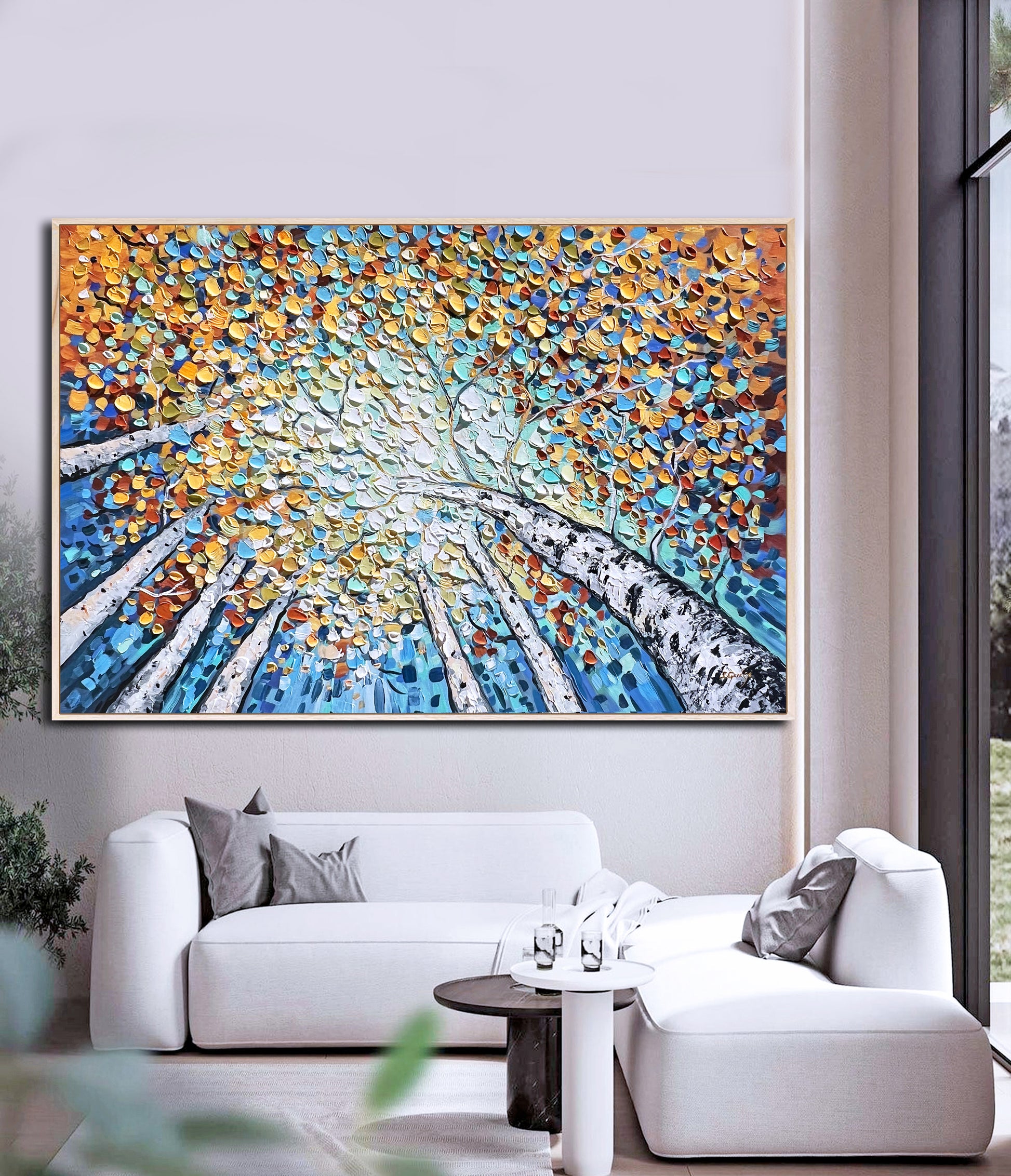 It draws the viewer into the experience of standing beneath a luminous canopy of birch trees, gazing upward as golden, turquoise, and amber leaves dance above.