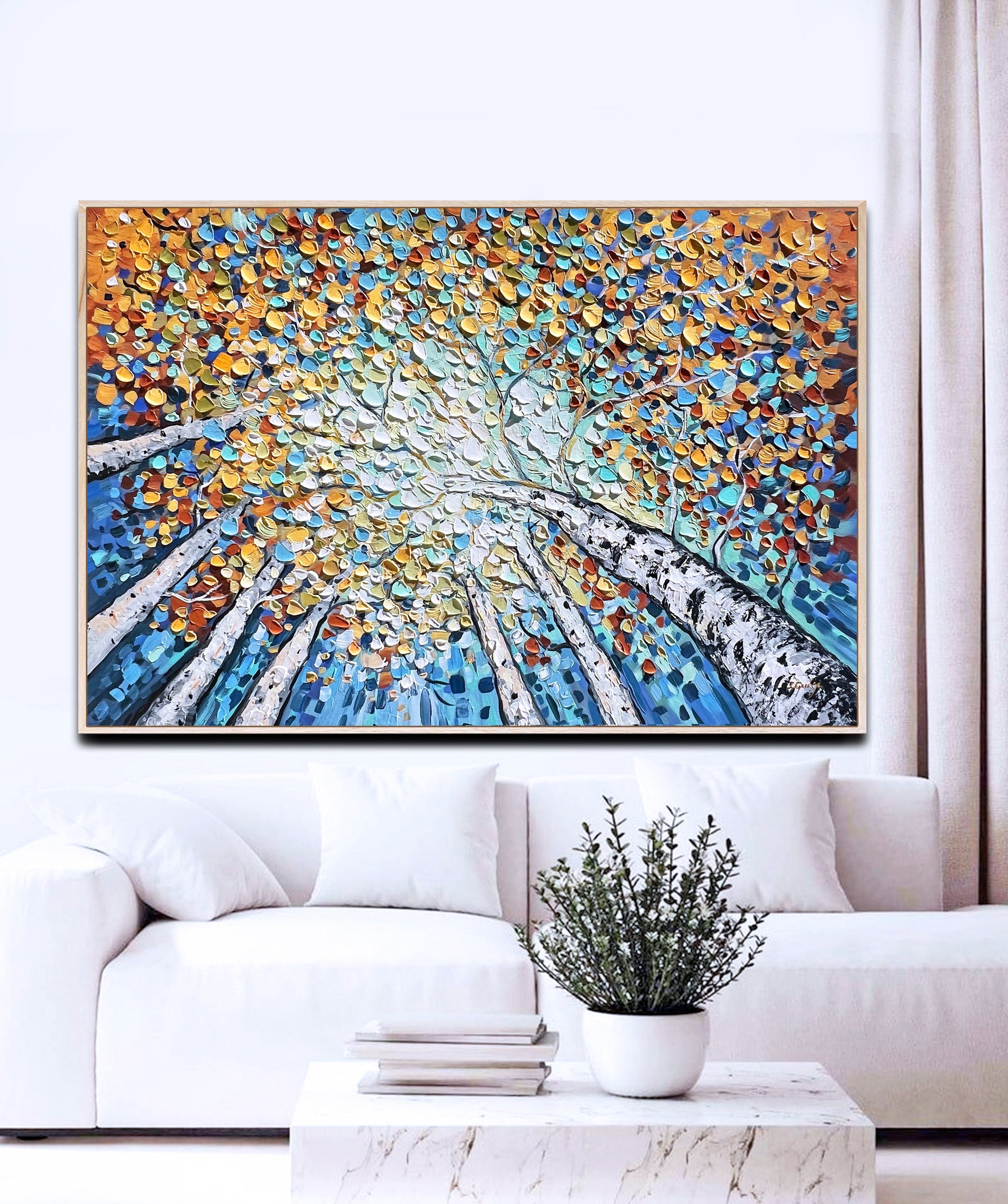 It draws the viewer into the experience of standing beneath a luminous canopy of birch trees, gazing upward as golden, turquoise, and amber leaves dance above.