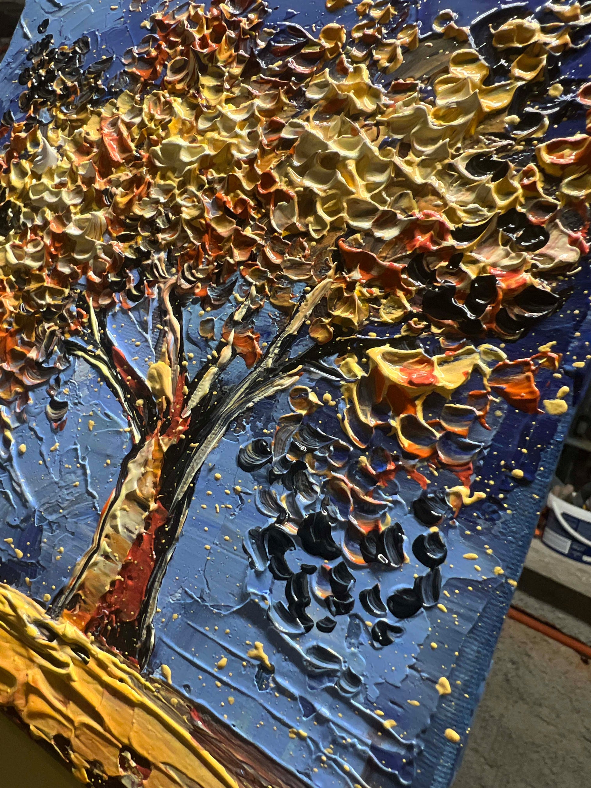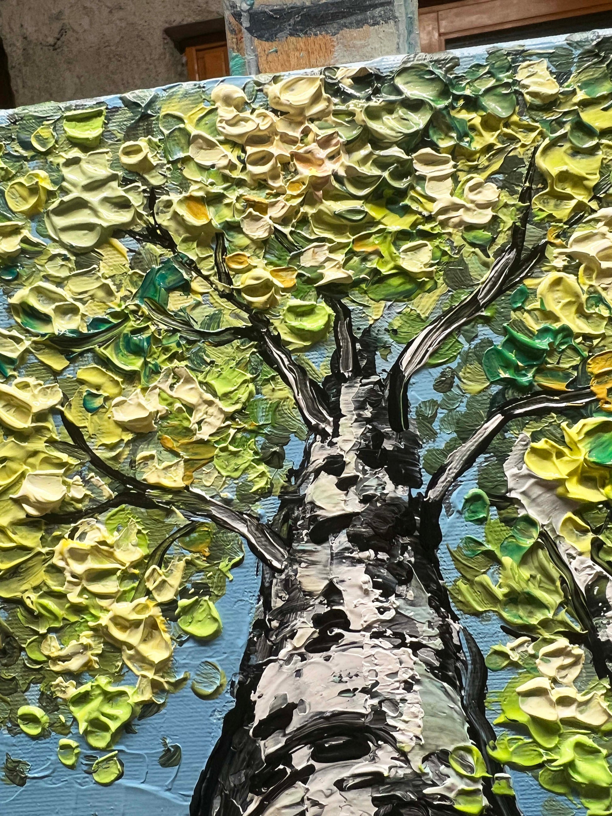 Painted with palette knife, the richly textured surfaces bring both foliage and trunks vividly to life.