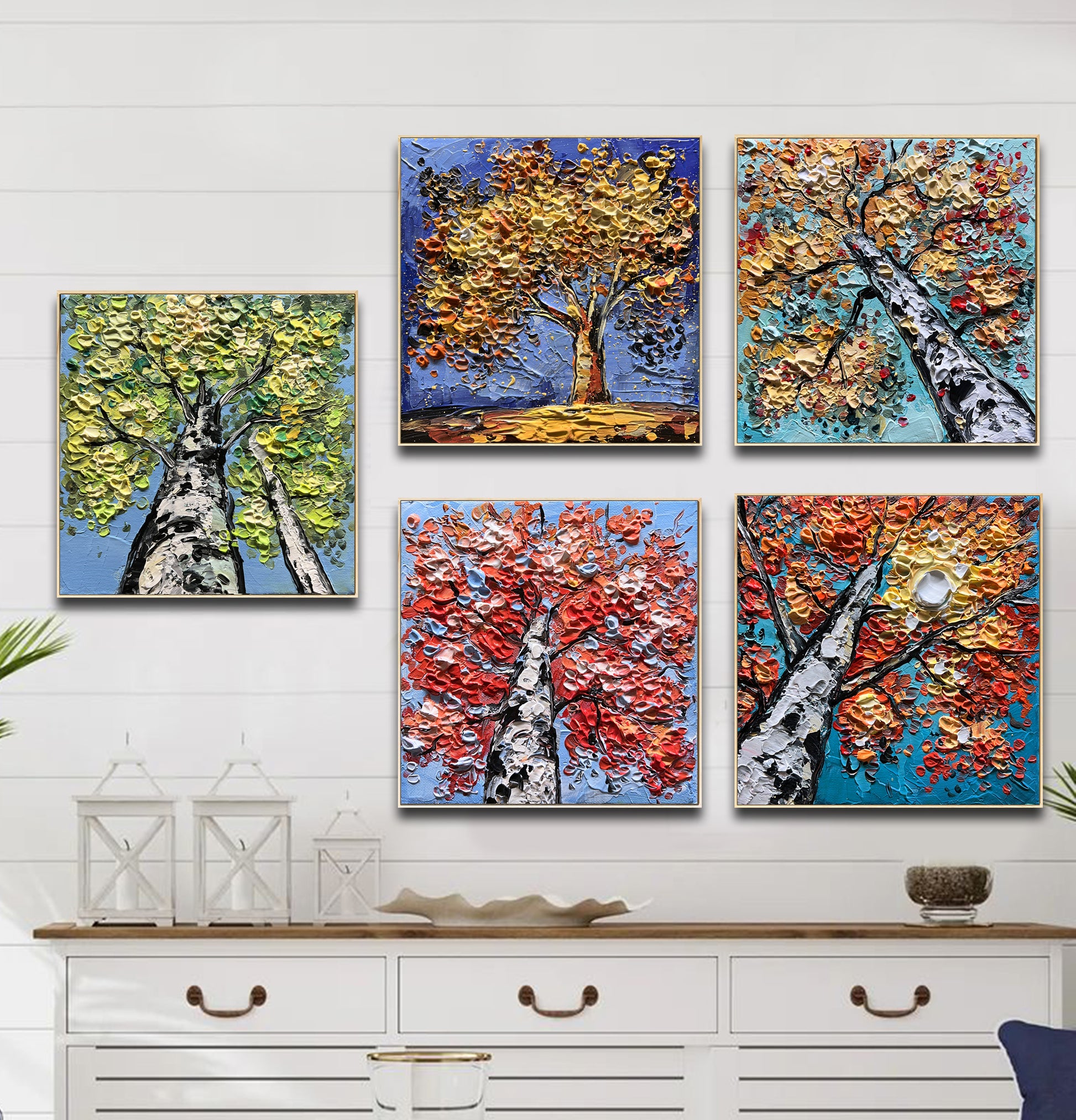 Together, the artworks come together as a harmonious and expressive celebration of color, movement, and the changing seasons, unified by the timeless elegance of the birch tree.