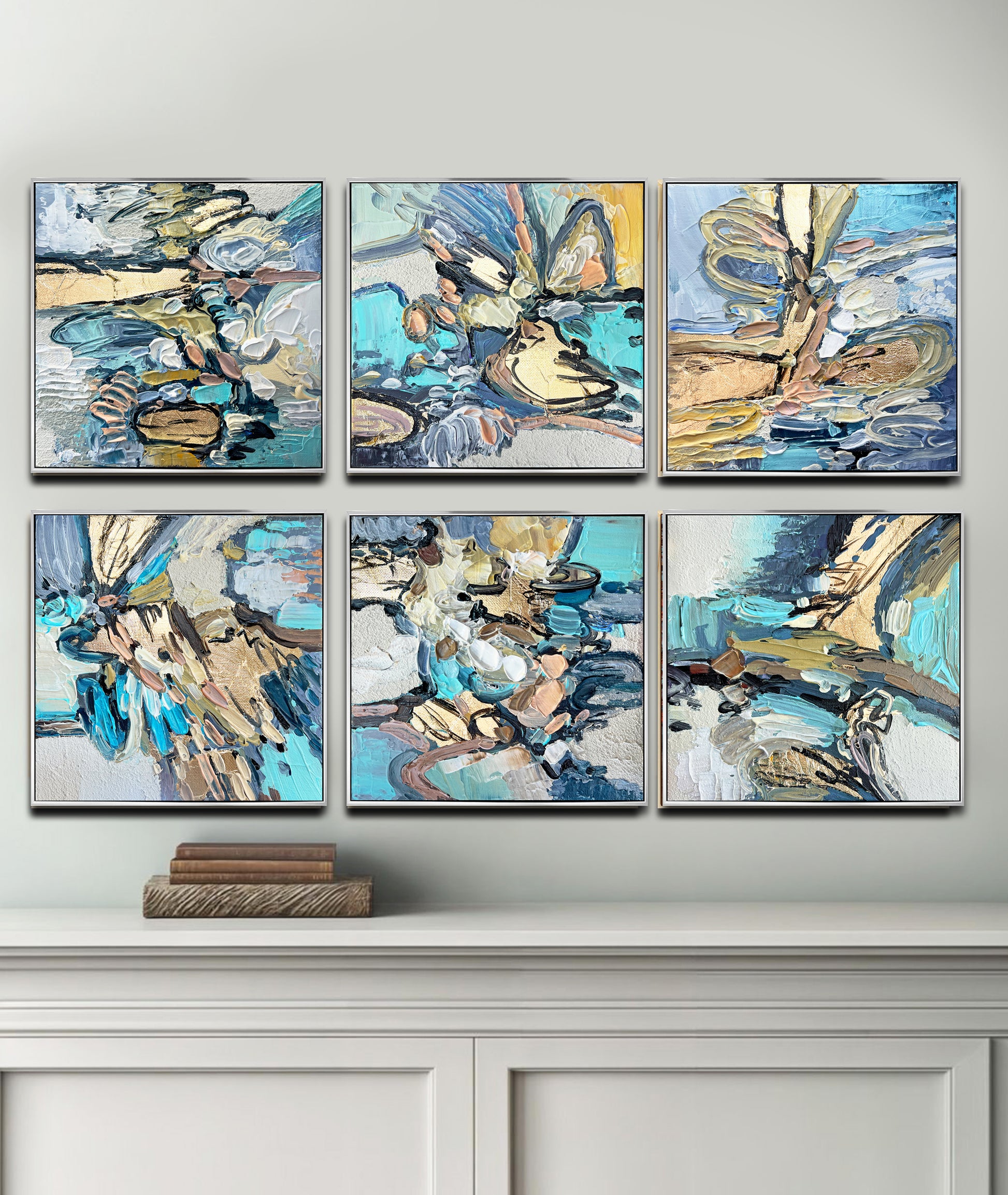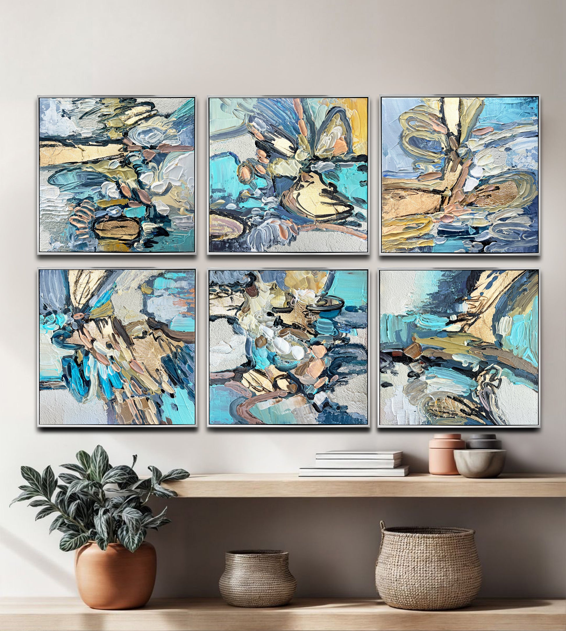 Displayed together, the 6 paintings form a cohesive arrangement with an overall size of 60 × 40 cm, functioning as a single, harmonious visual statement. Individually distinct yet deeply connected, Blue Alchemy invites the viewer to experience balance, movement, and quiet luminosity through abstraction.