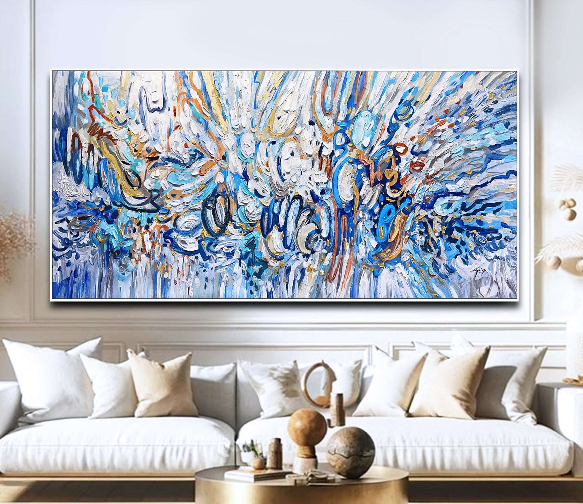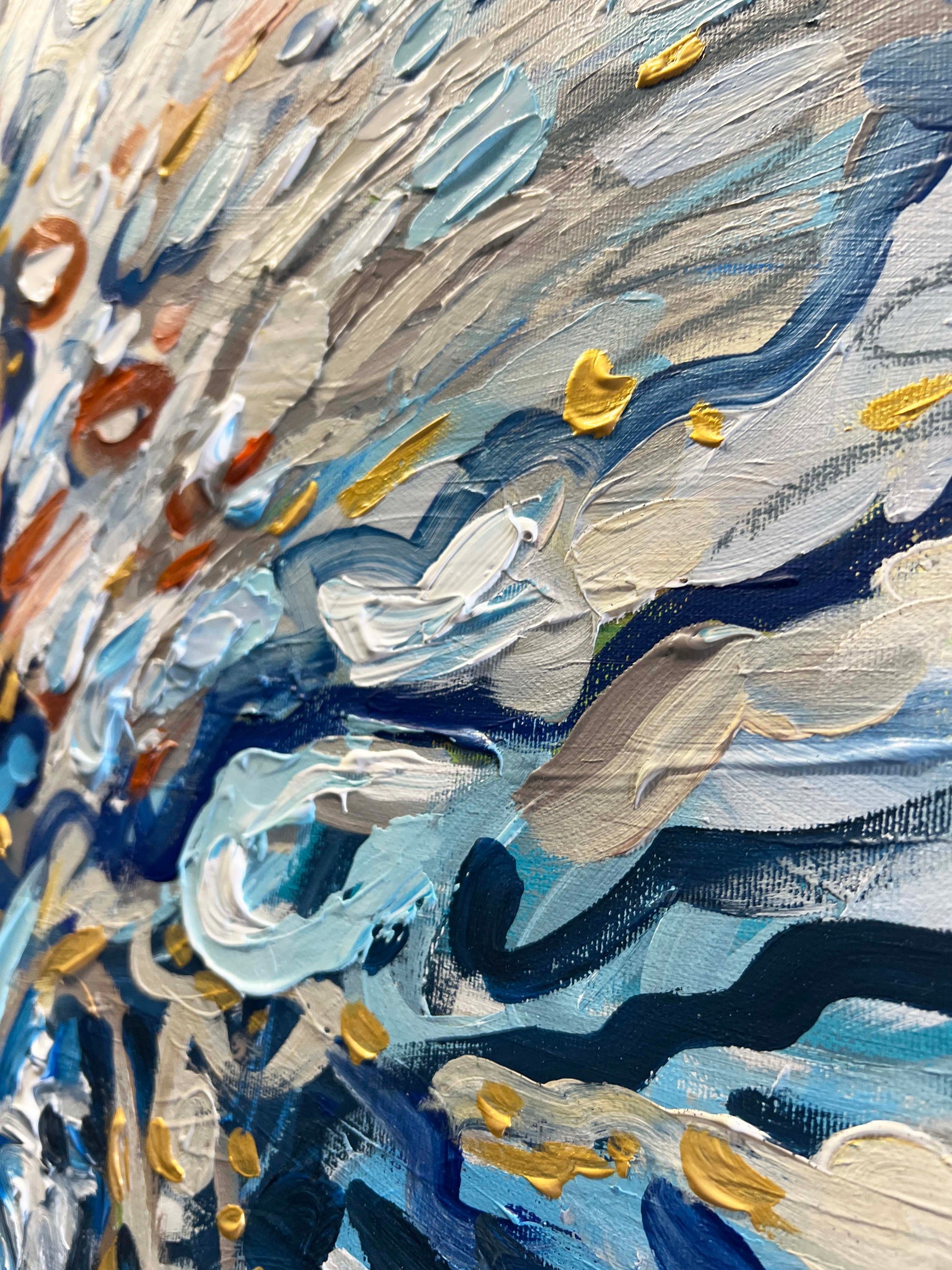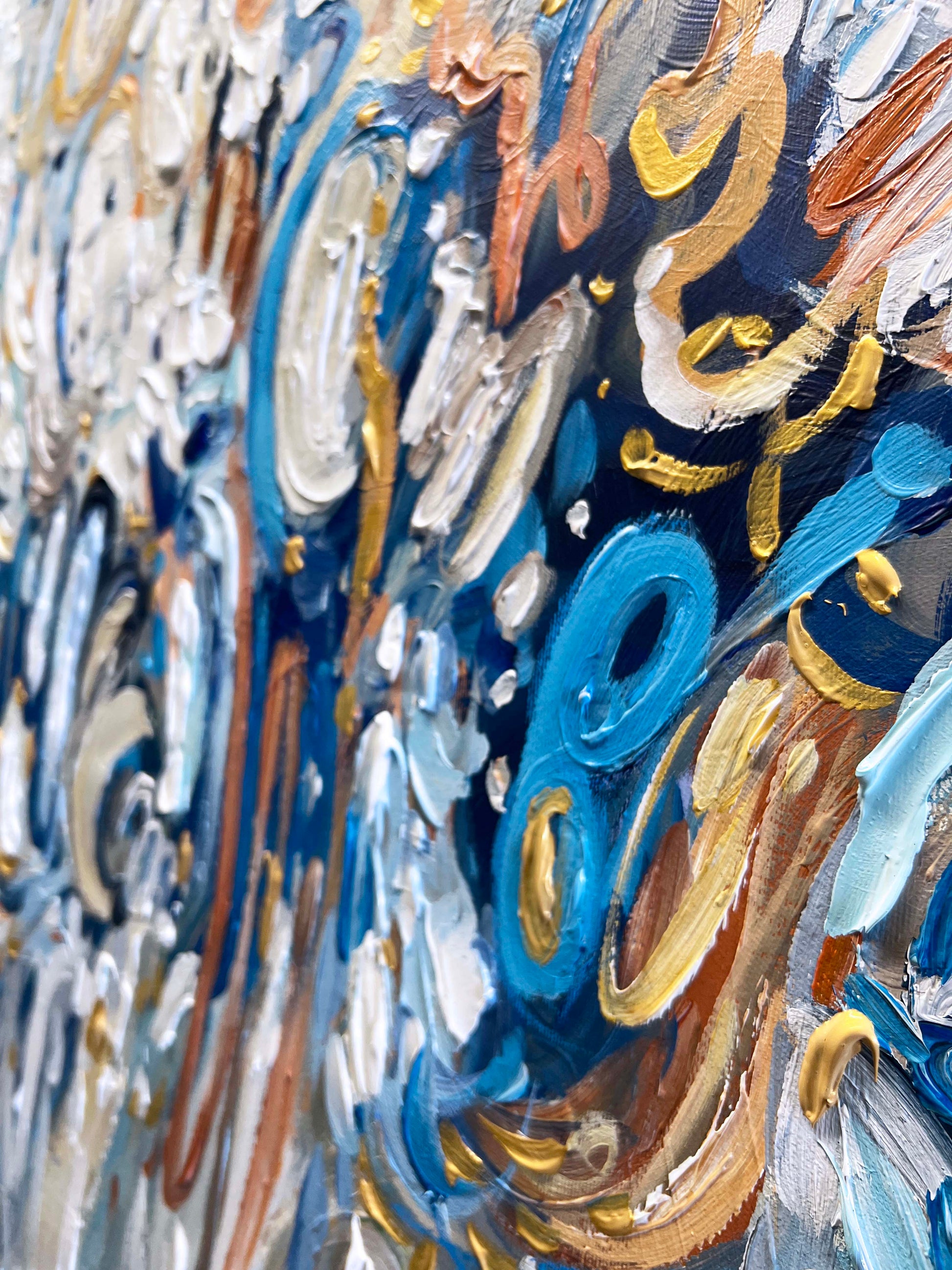 "Blue Symphony" is a captivating abstract artwork in harmonious blend of deep indigos, luminous blues, and shimmering golden accents.