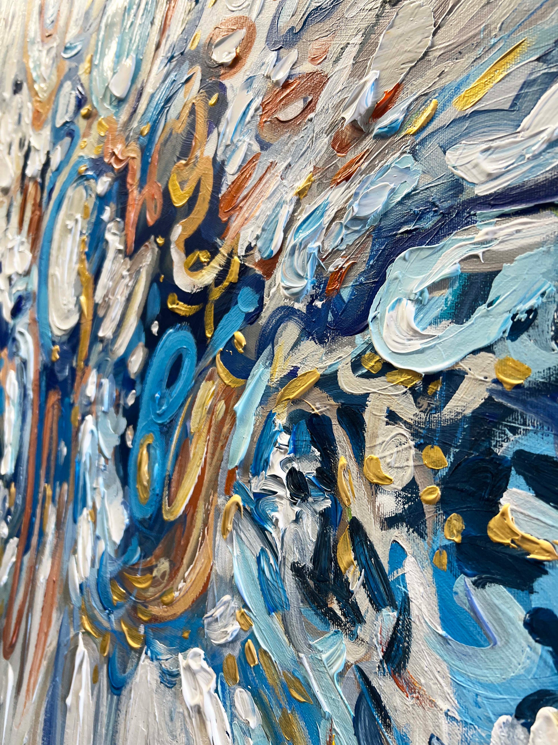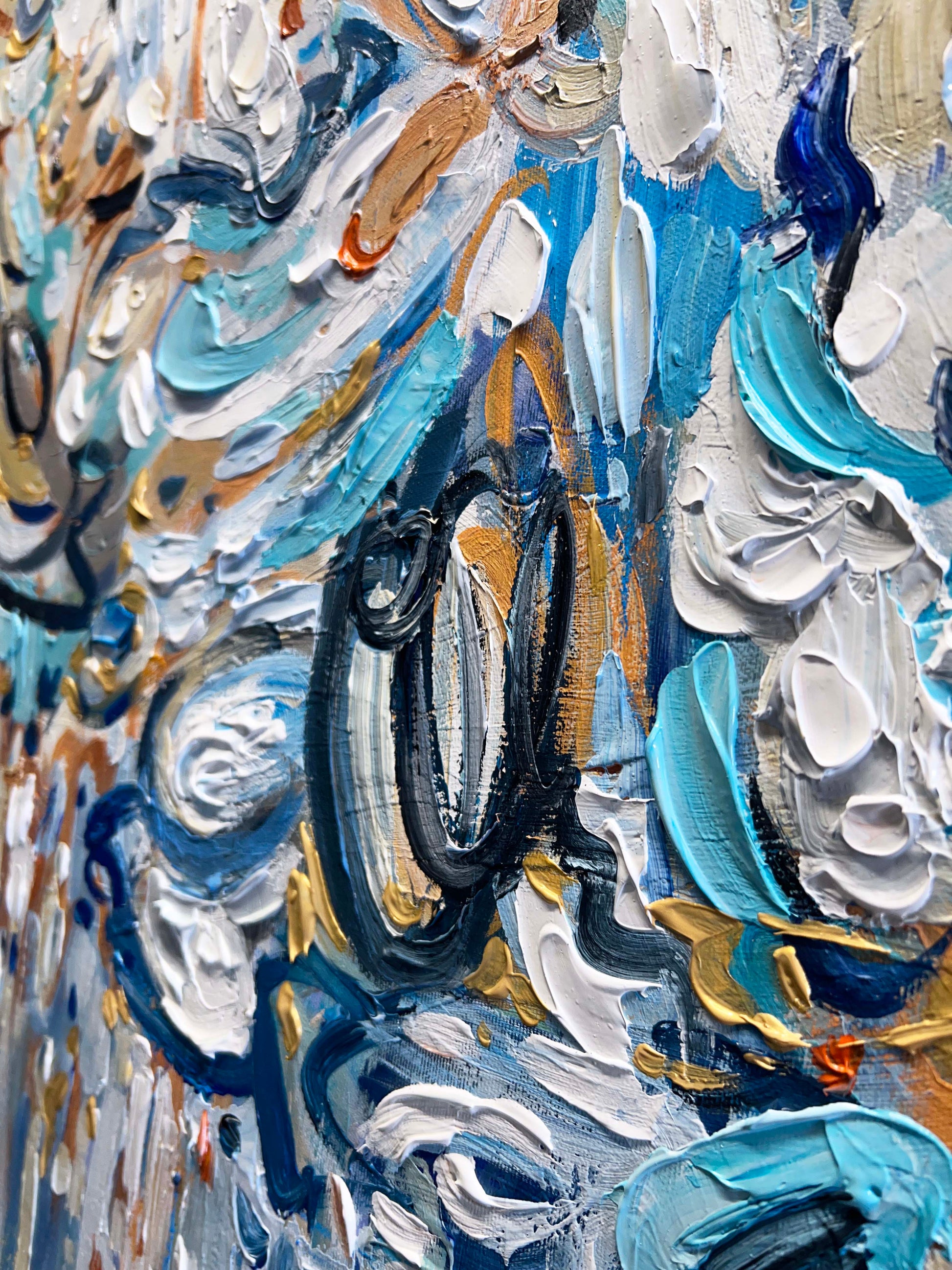 "Blue Symphony" is a captivating abstract artwork in harmonious blend of deep indigos, luminous blues, and shimmering golden accents.