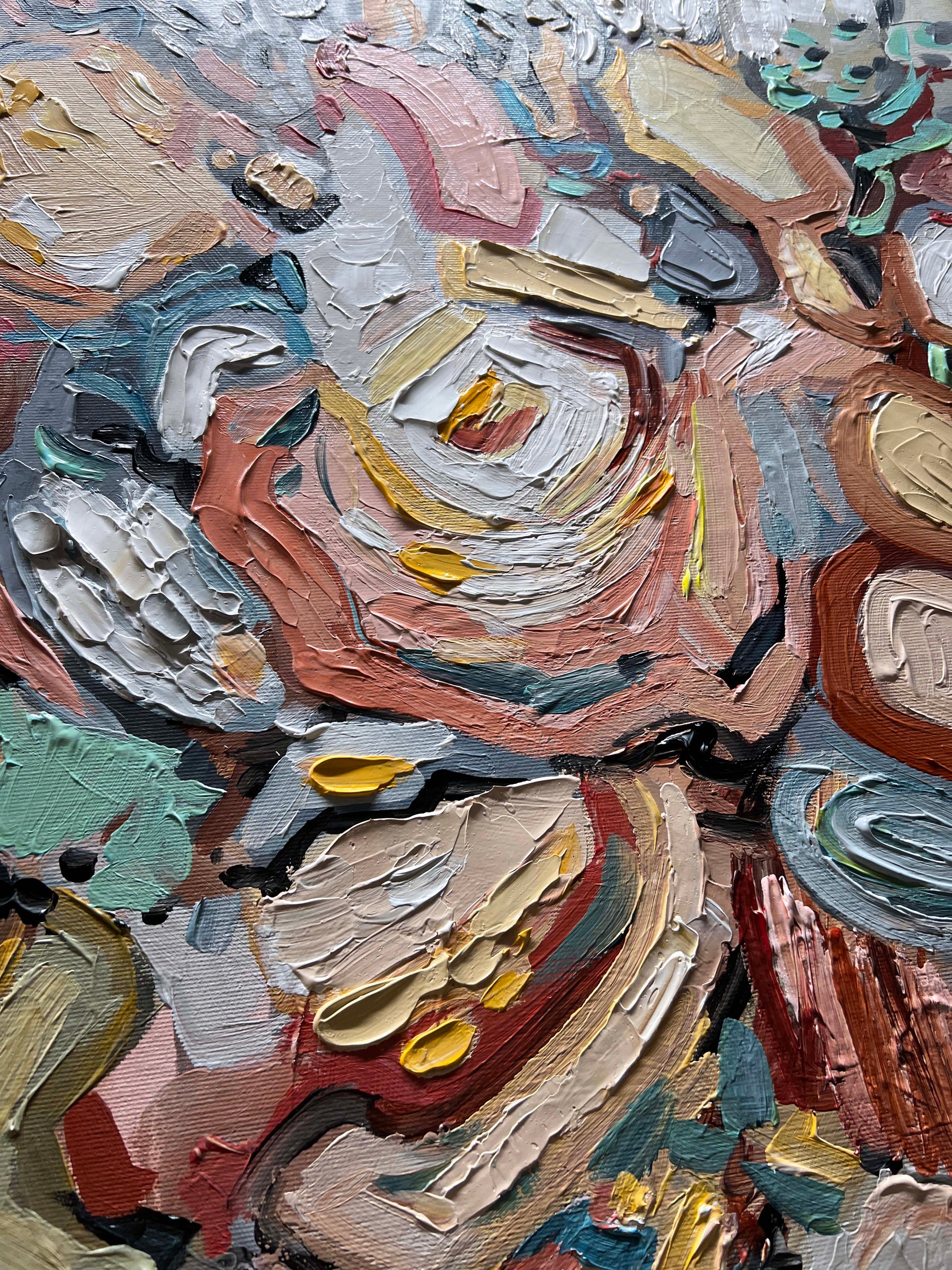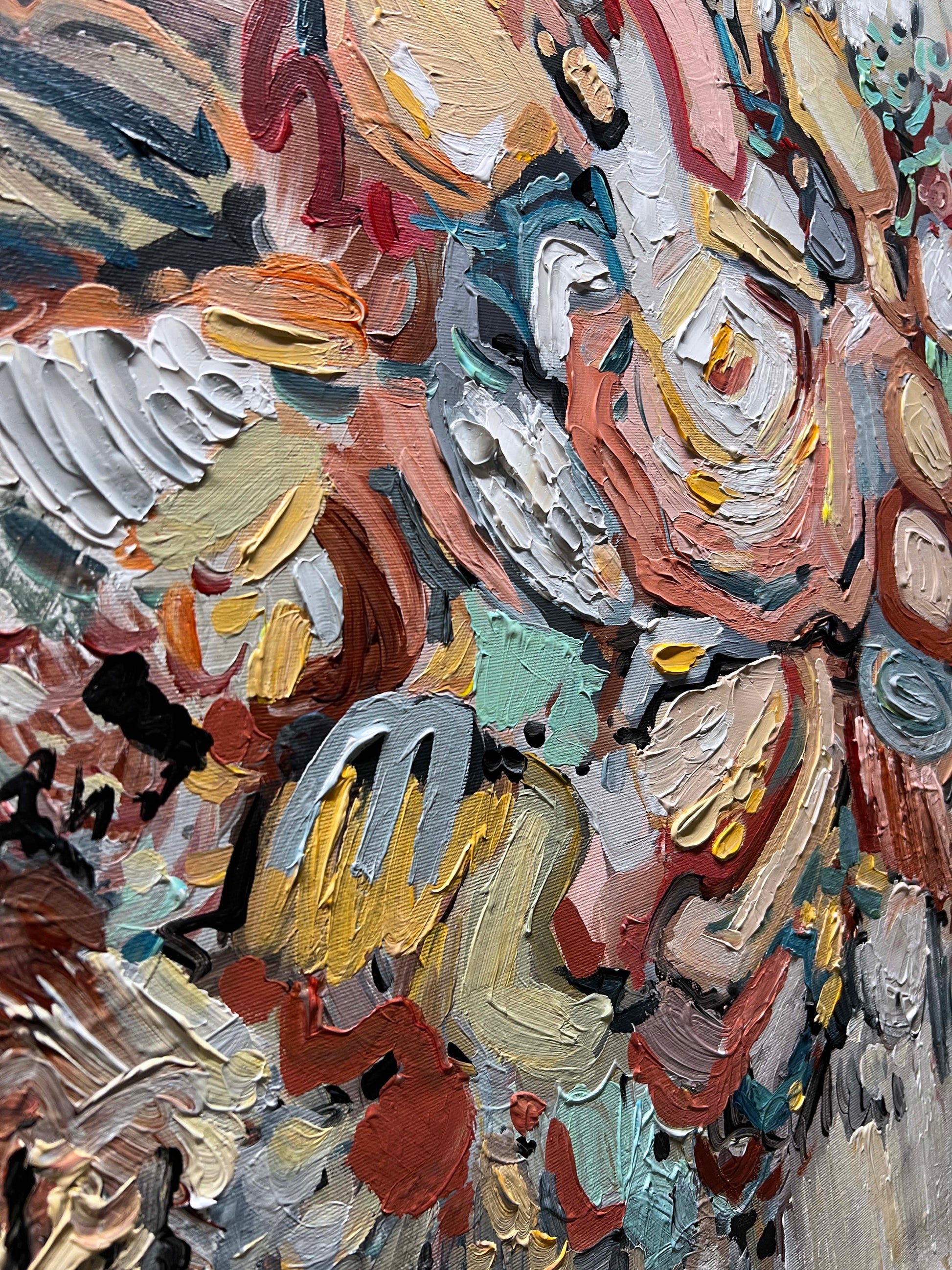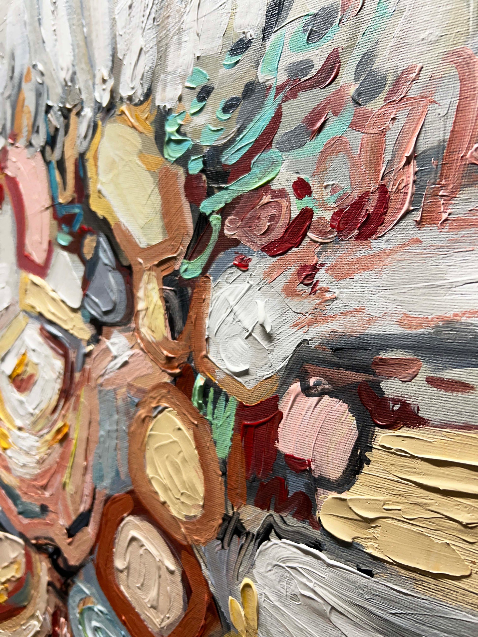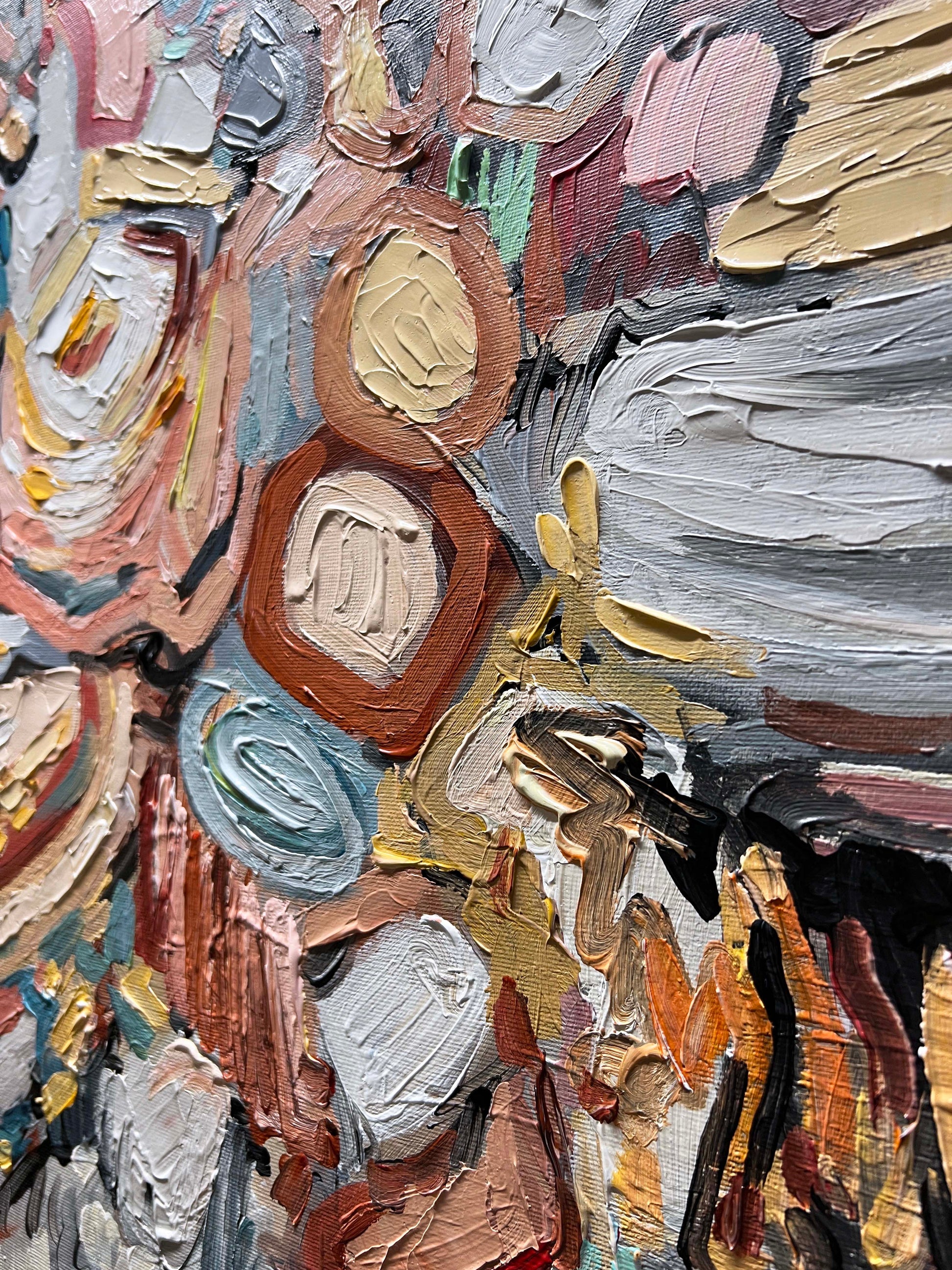 Expressive palette-knife strokes form a richly textured surface, with dense areas of color softened by subtle transitions and fluid movement.
