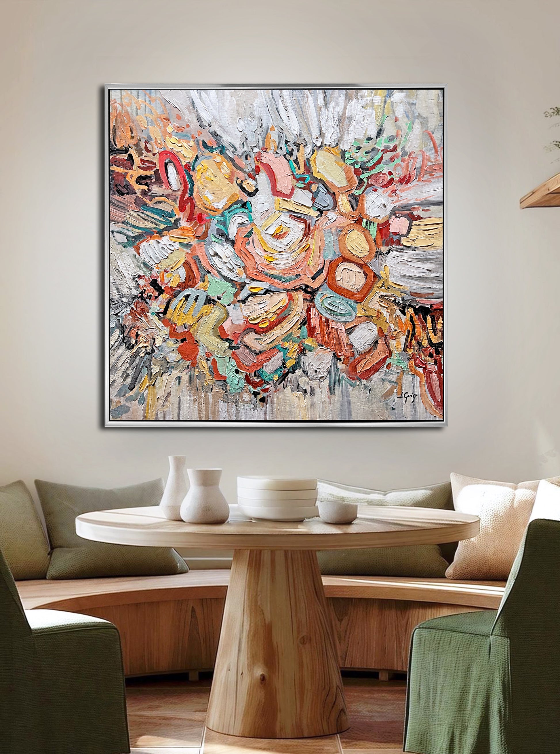 The reds bring depth and warmth, while the mint green accents introduce a sense of air and renewal, allowing the composition to remain balanced and composed.