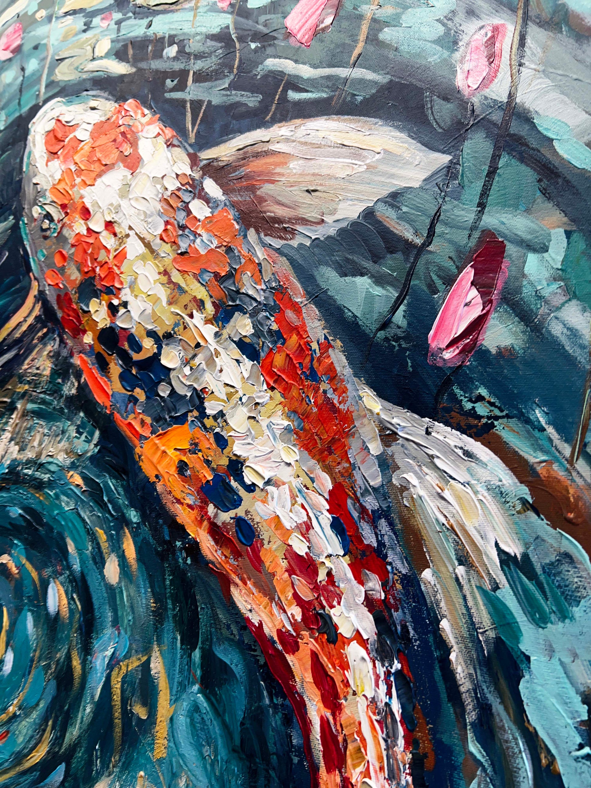 The circular movement of the koi suggests infinity, while the surrounding lotus leaves and blossoms add a sense of serenity and connection to nature.