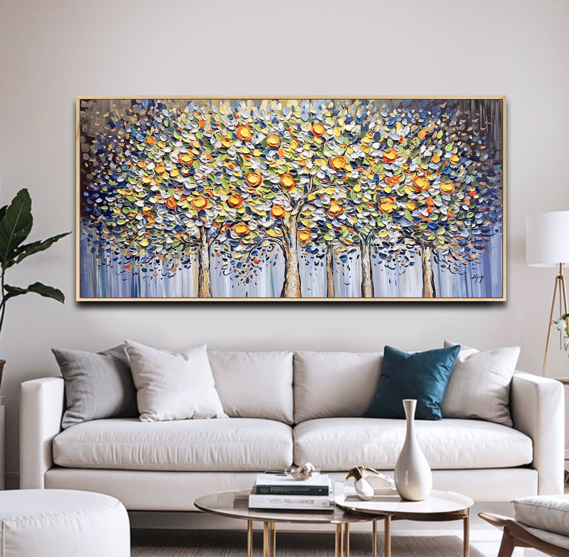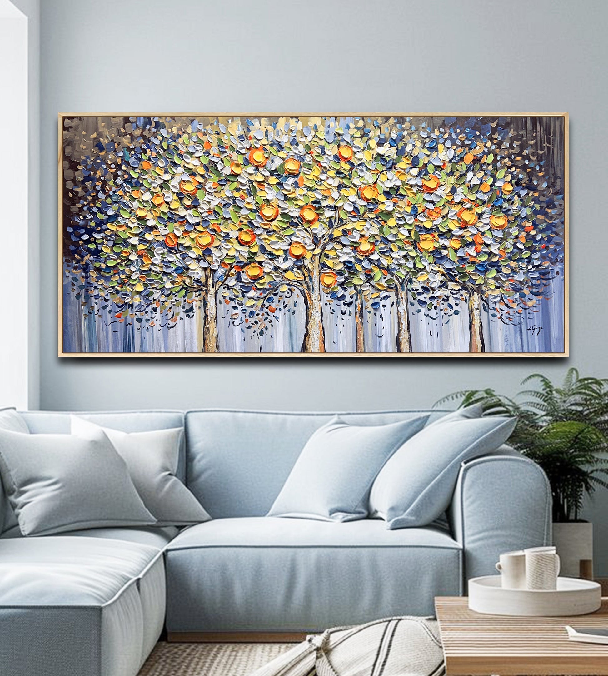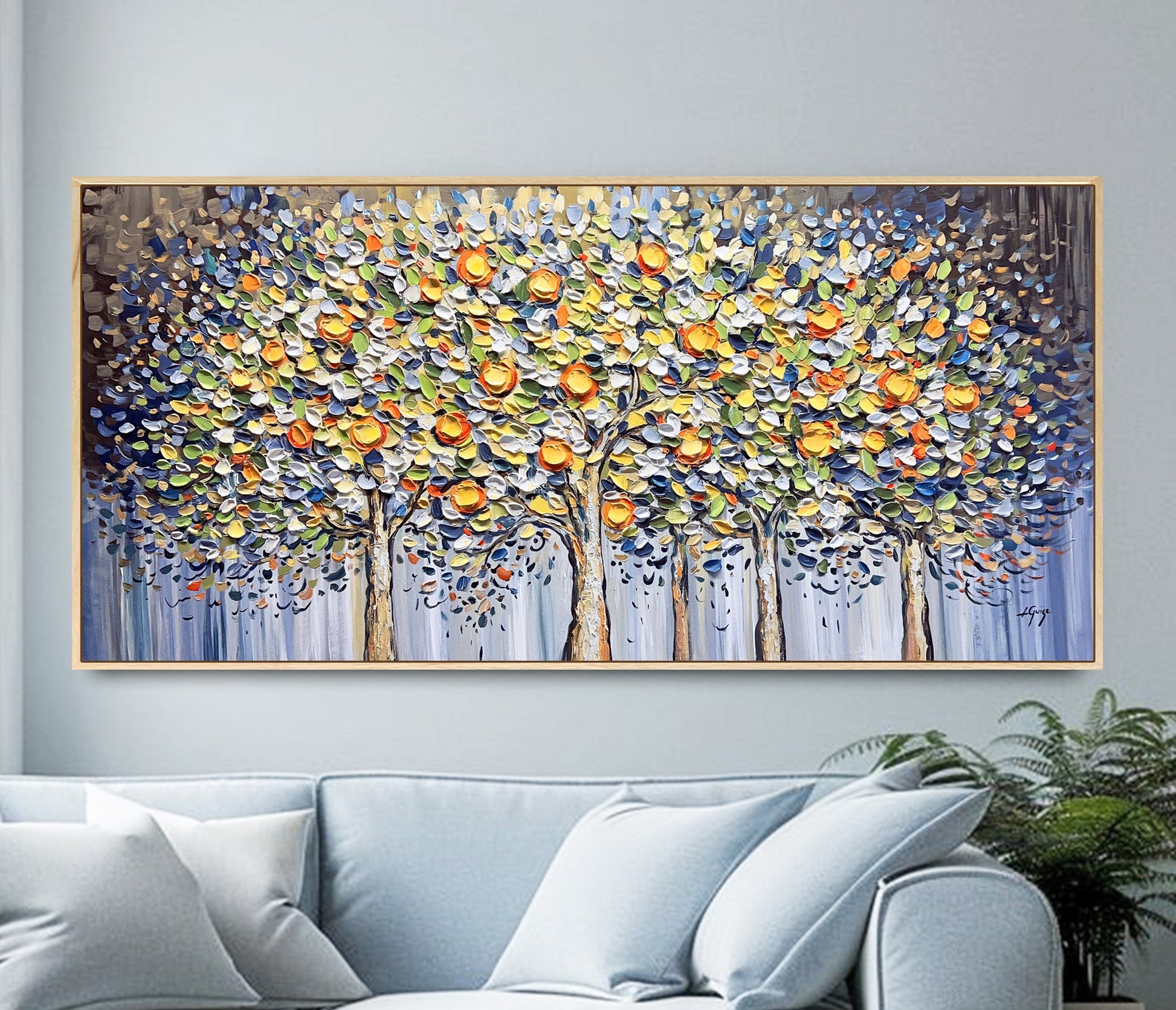To beautifully complement the painting’s organic textures and vibrant, nature-inspired palette, consider a natural wooden frame — it adds warmth and emphasizes the earthy charm of the citrus grove.