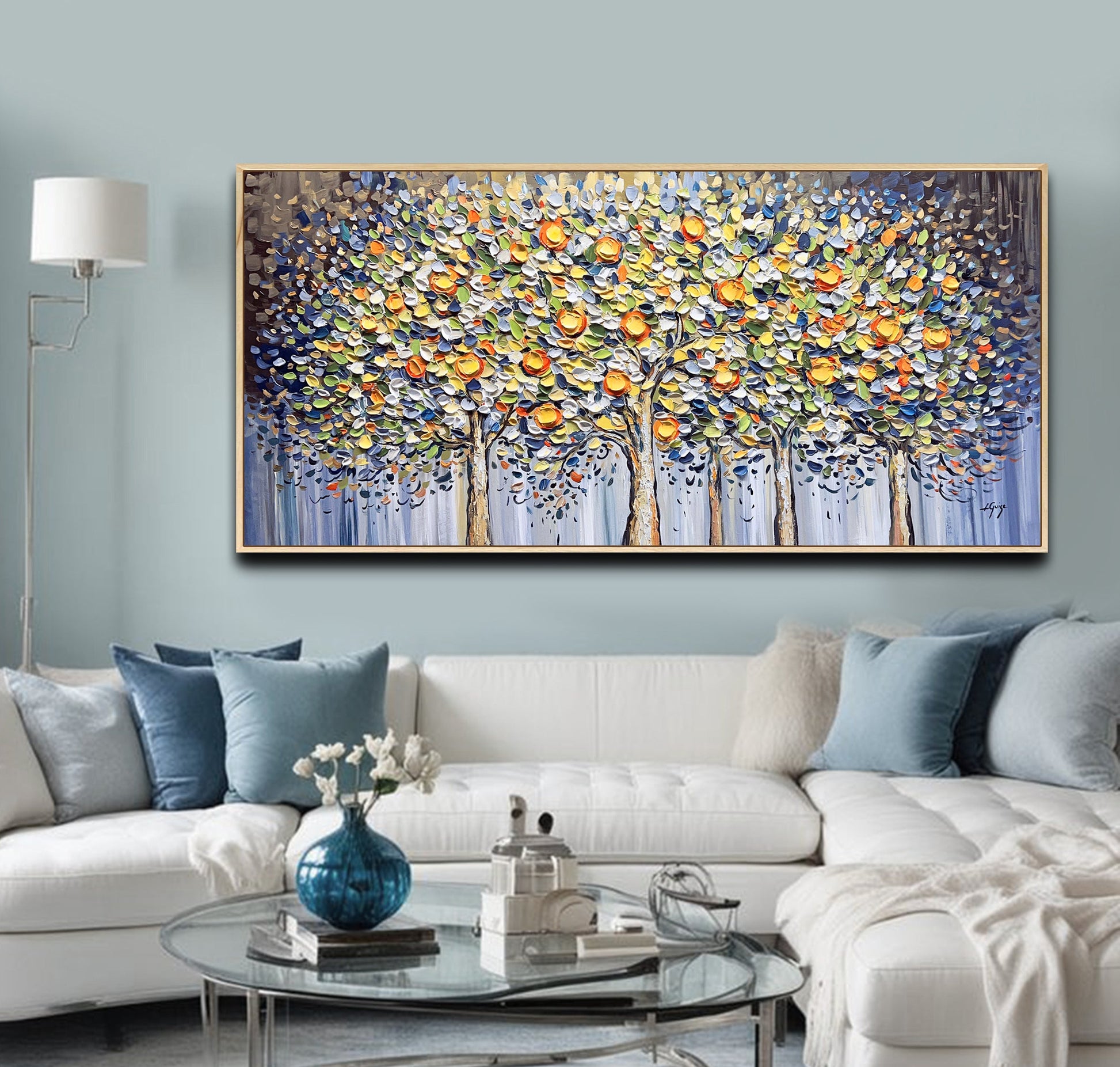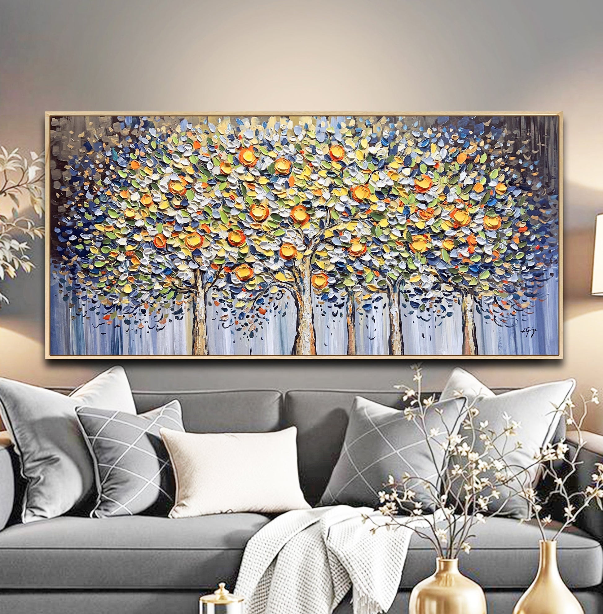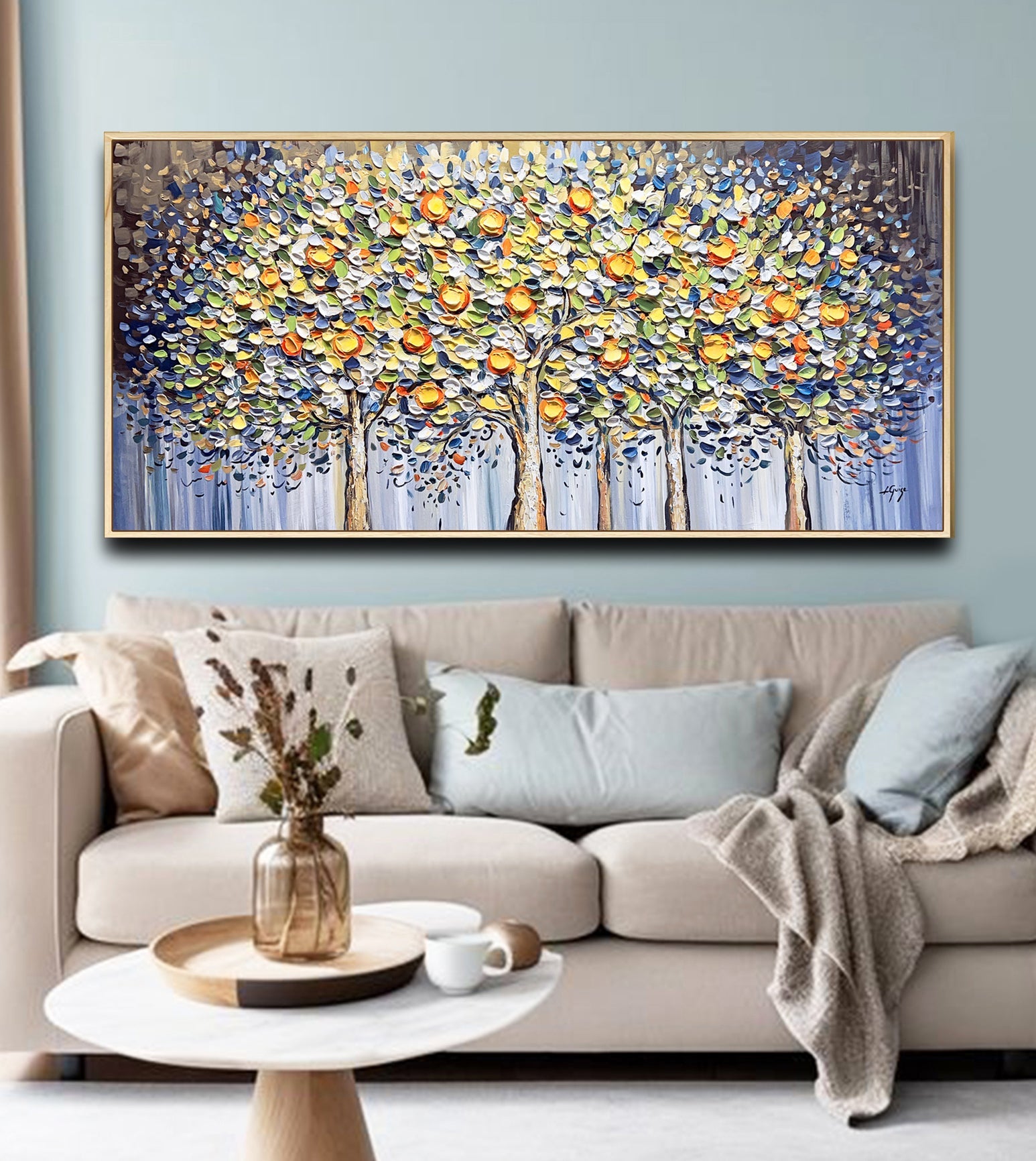 To beautifully complement the painting’s organic textures and vibrant, nature-inspired palette, consider a natural wooden frame — it adds warmth and emphasizes the earthy charm of the citrus grove.