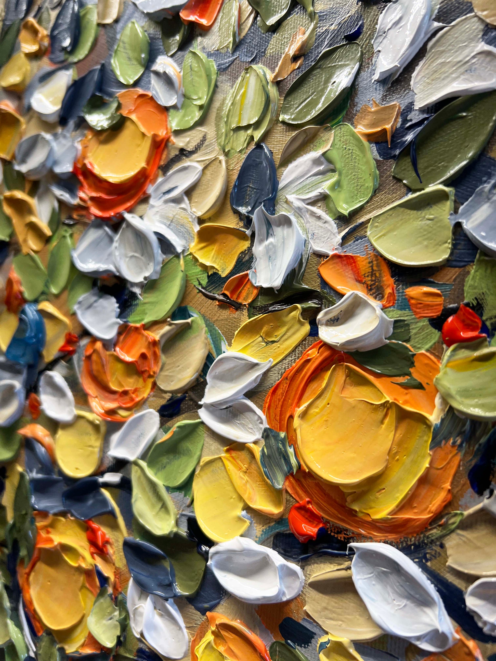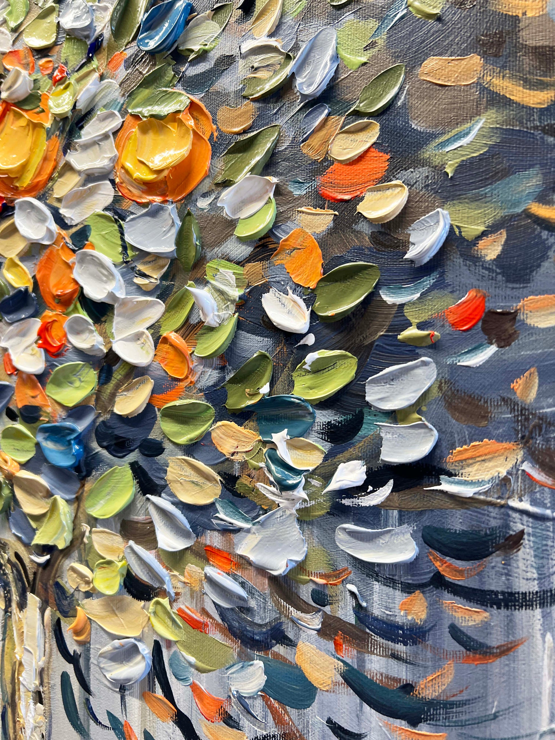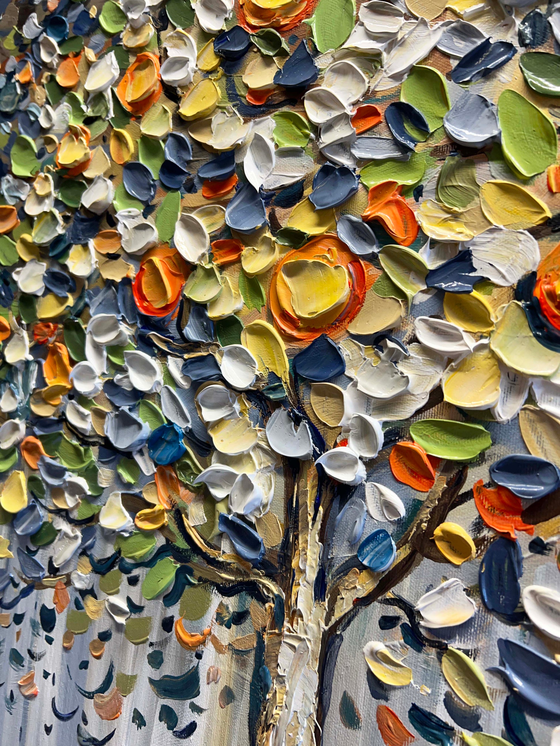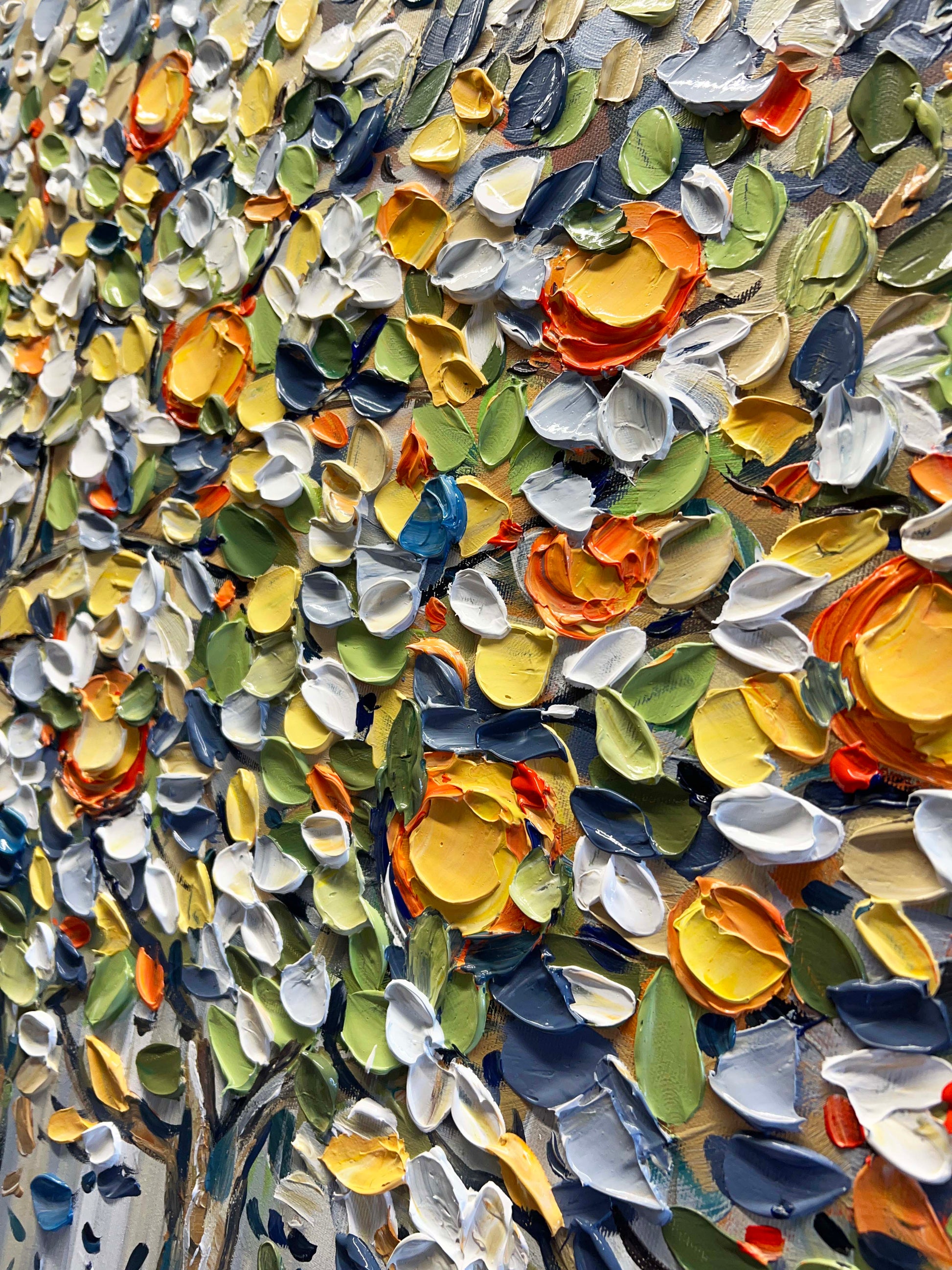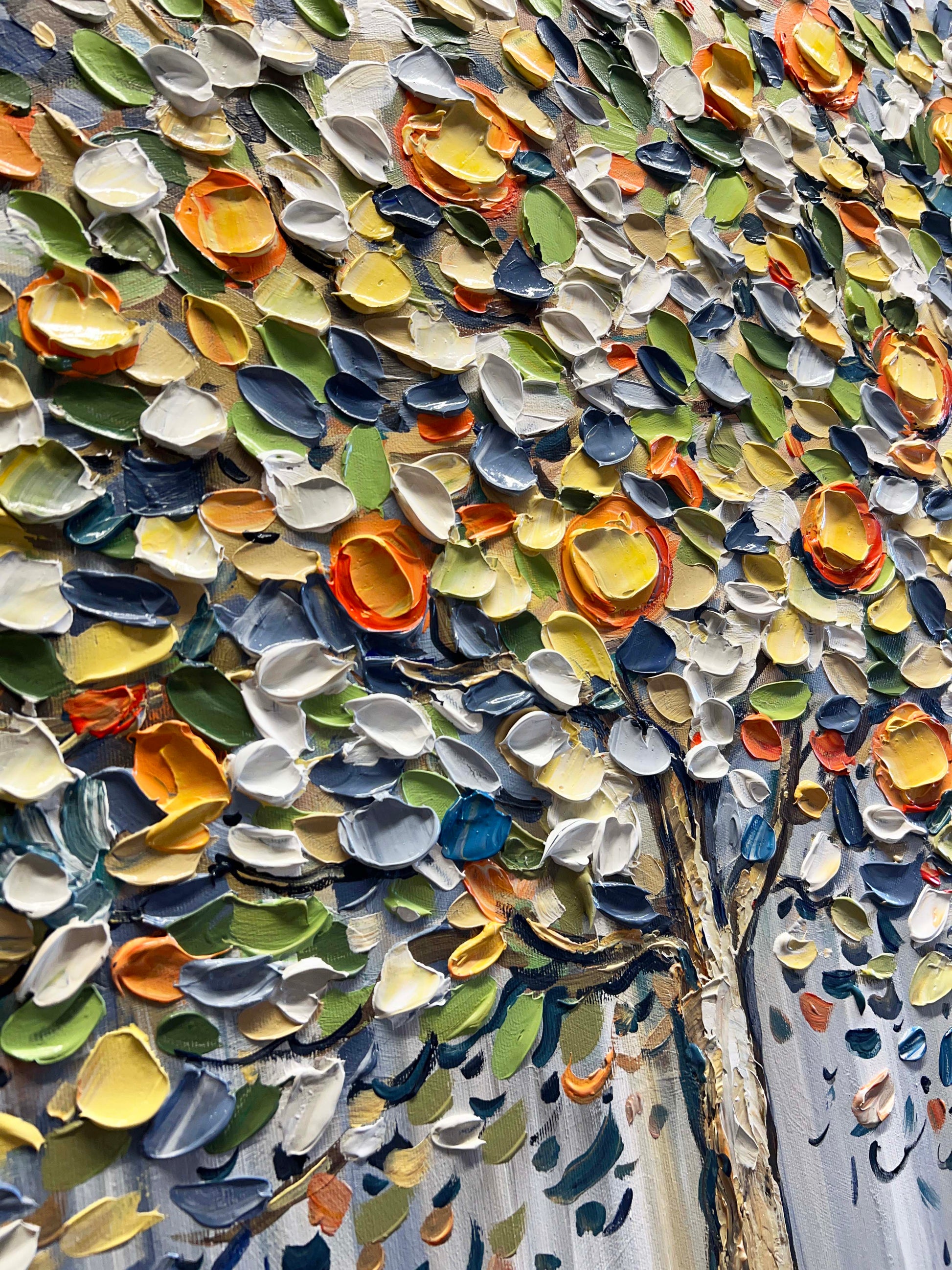 Thick, expressive brushstrokes bring the foliage to life with layered tones of green, blue, white, yellow, and orange.