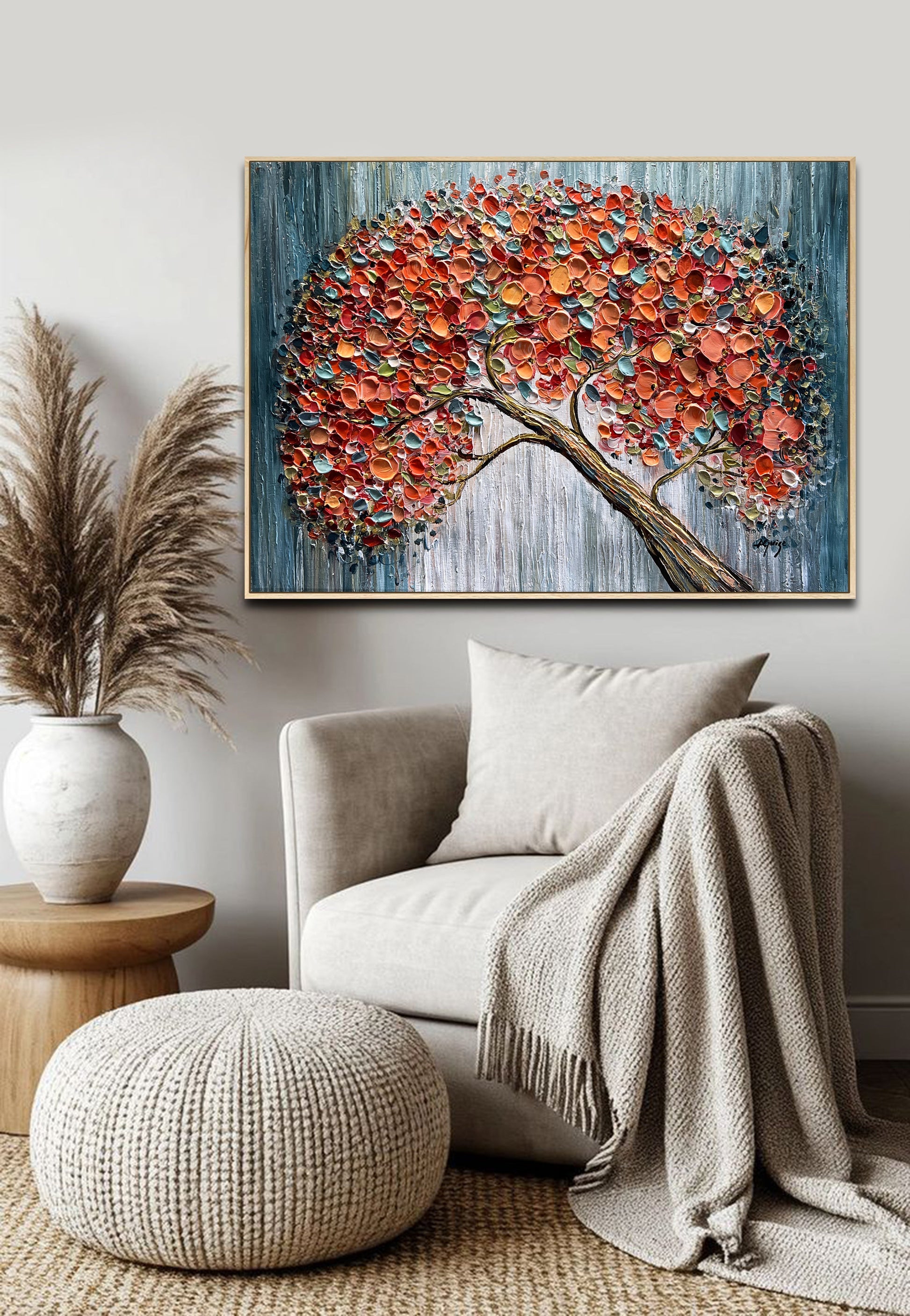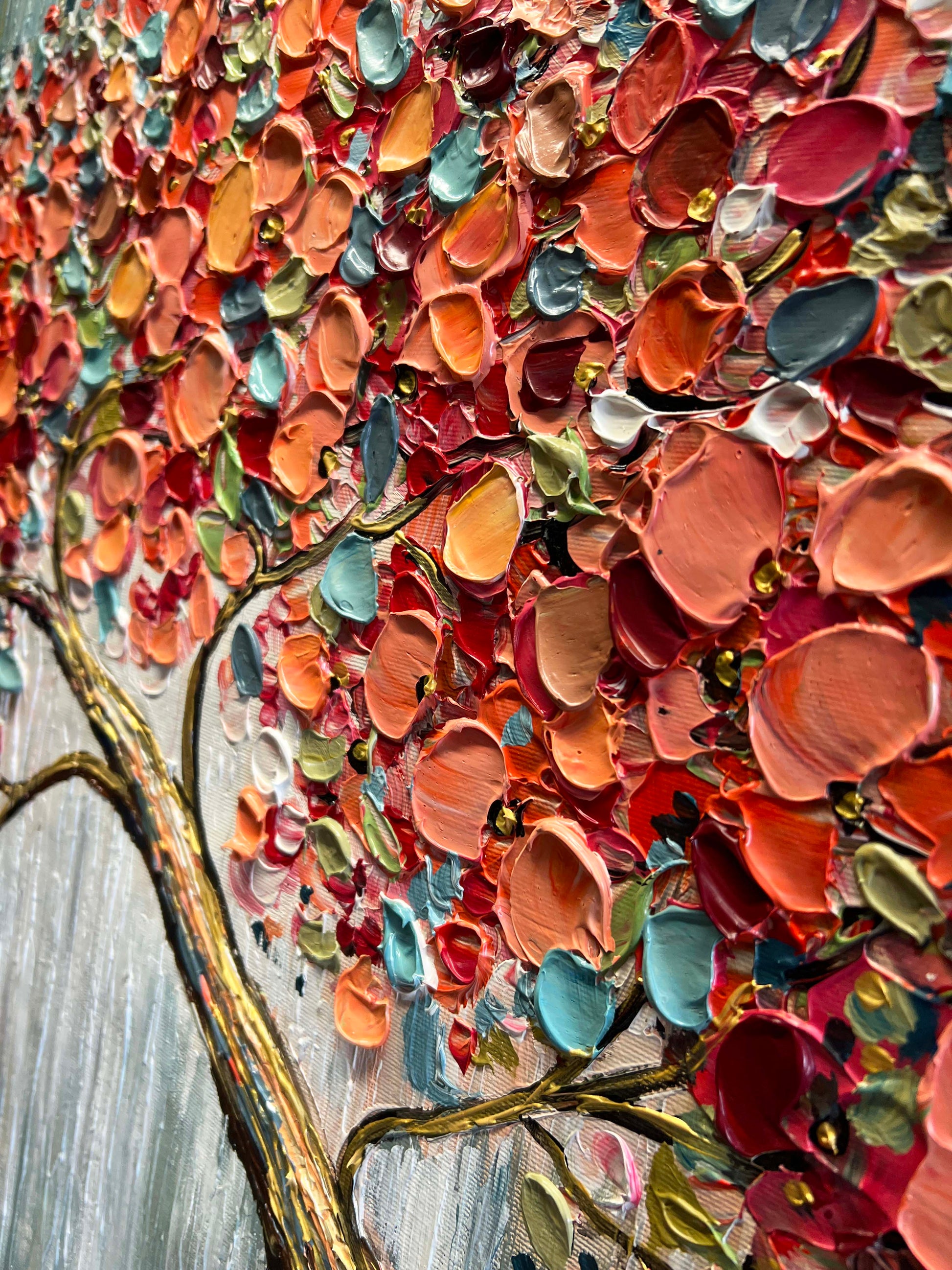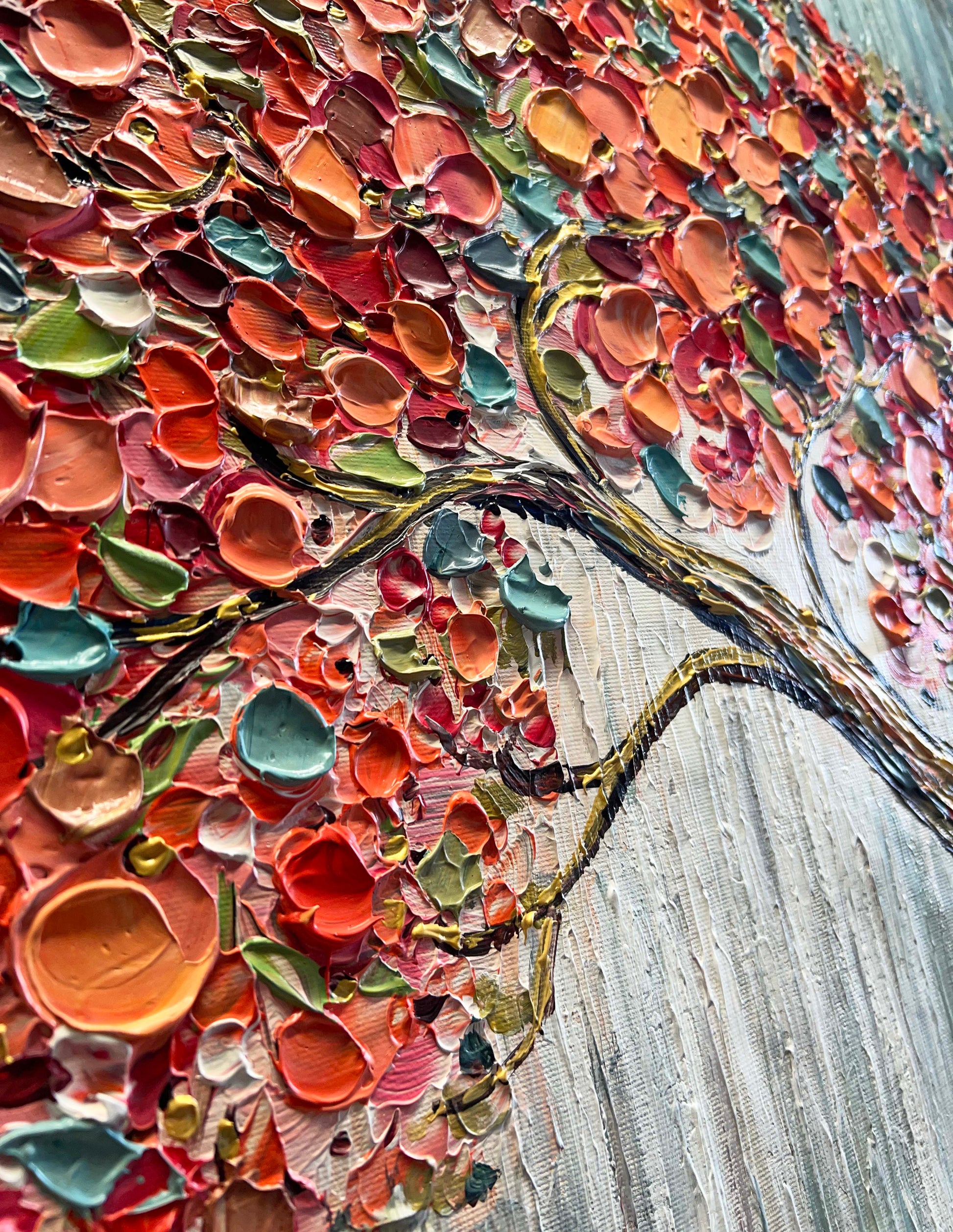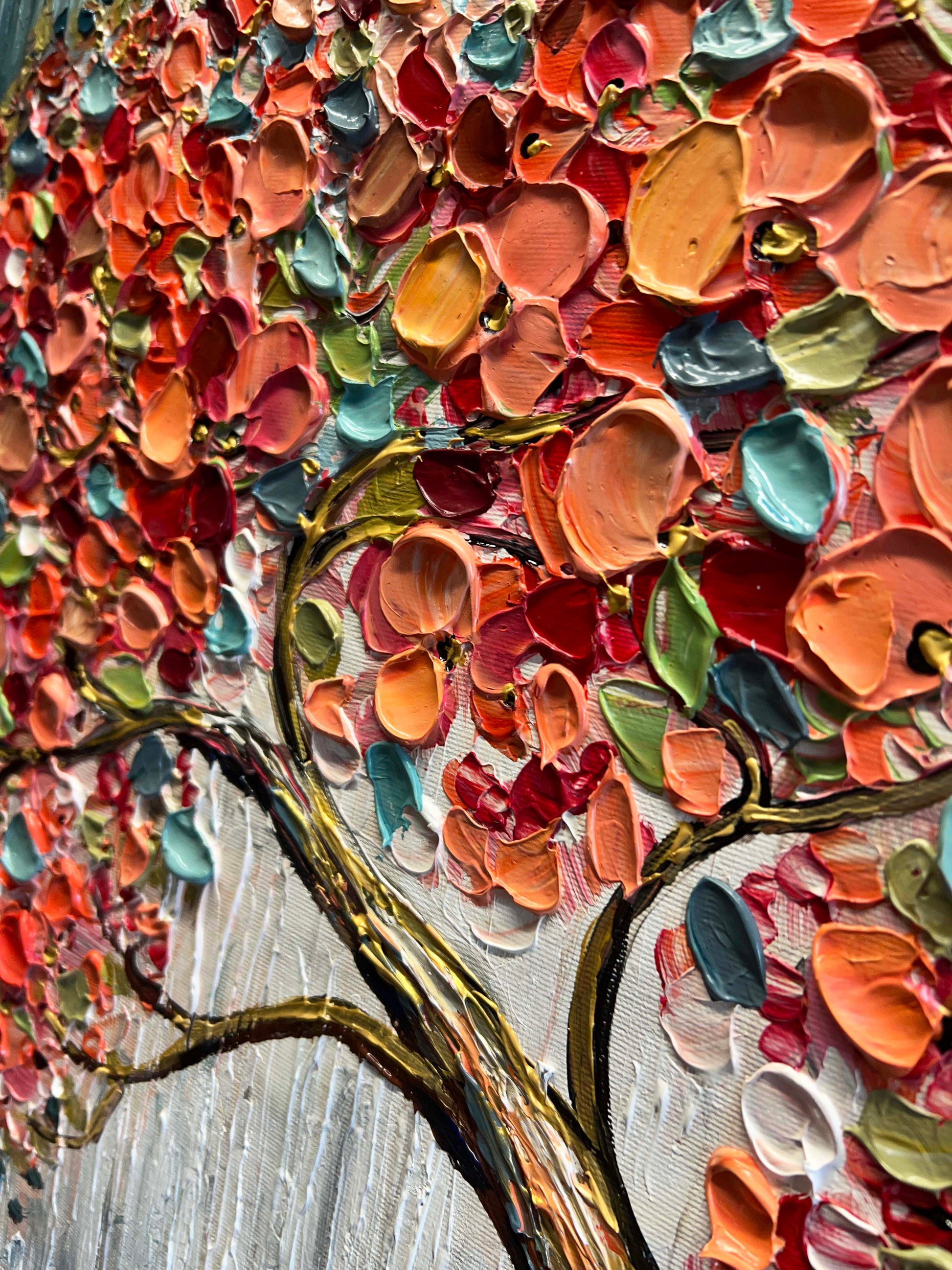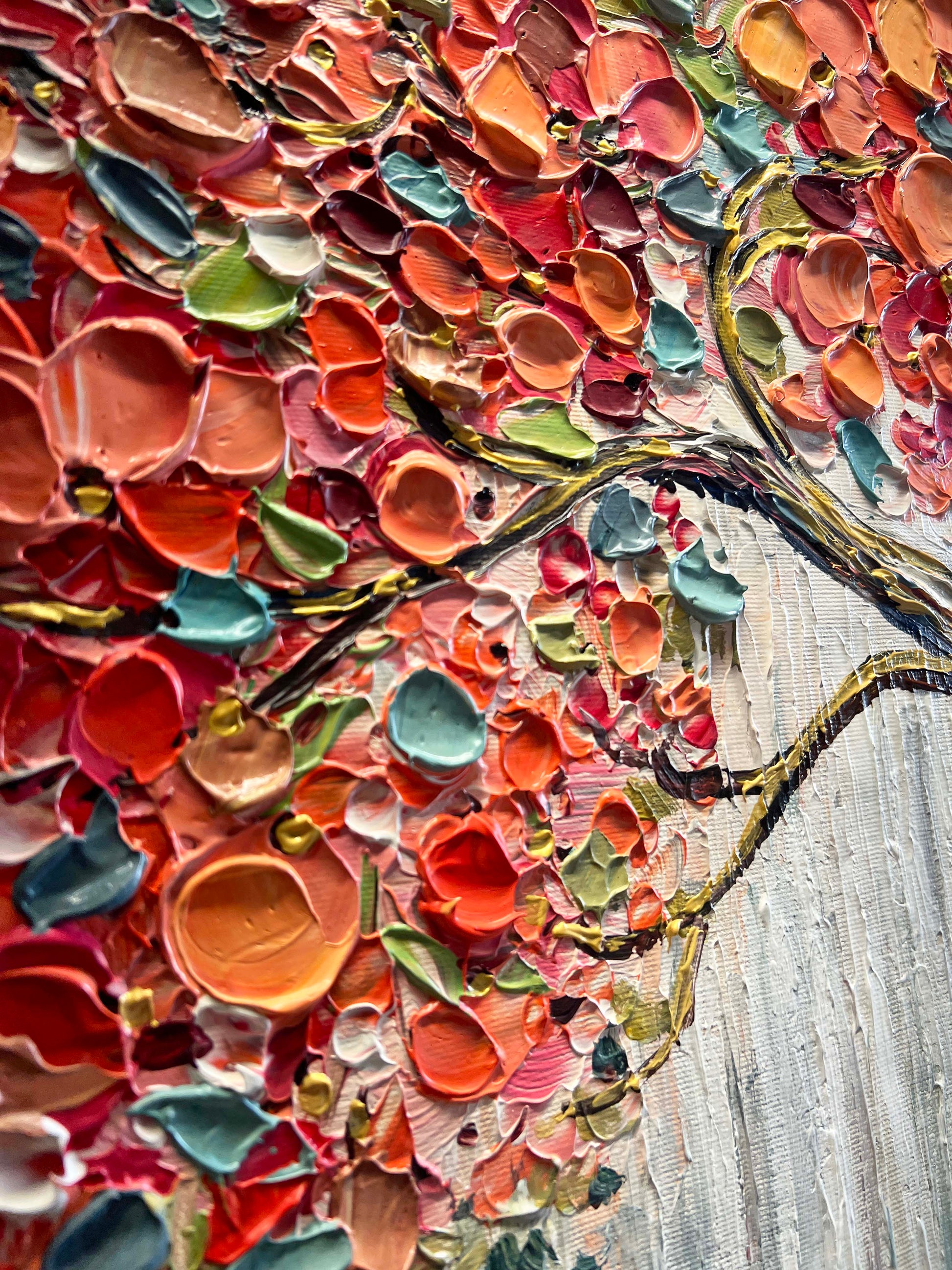 Painted in a dynamic palette of coral, terracotta, burnt orange, crimson, and soft peach tones, the painting is beautifully balanced with accents of sage green, muted teal, cool gray, and creamy white. These contrasting hues create depth while allowing the warm colors to glow with energy.