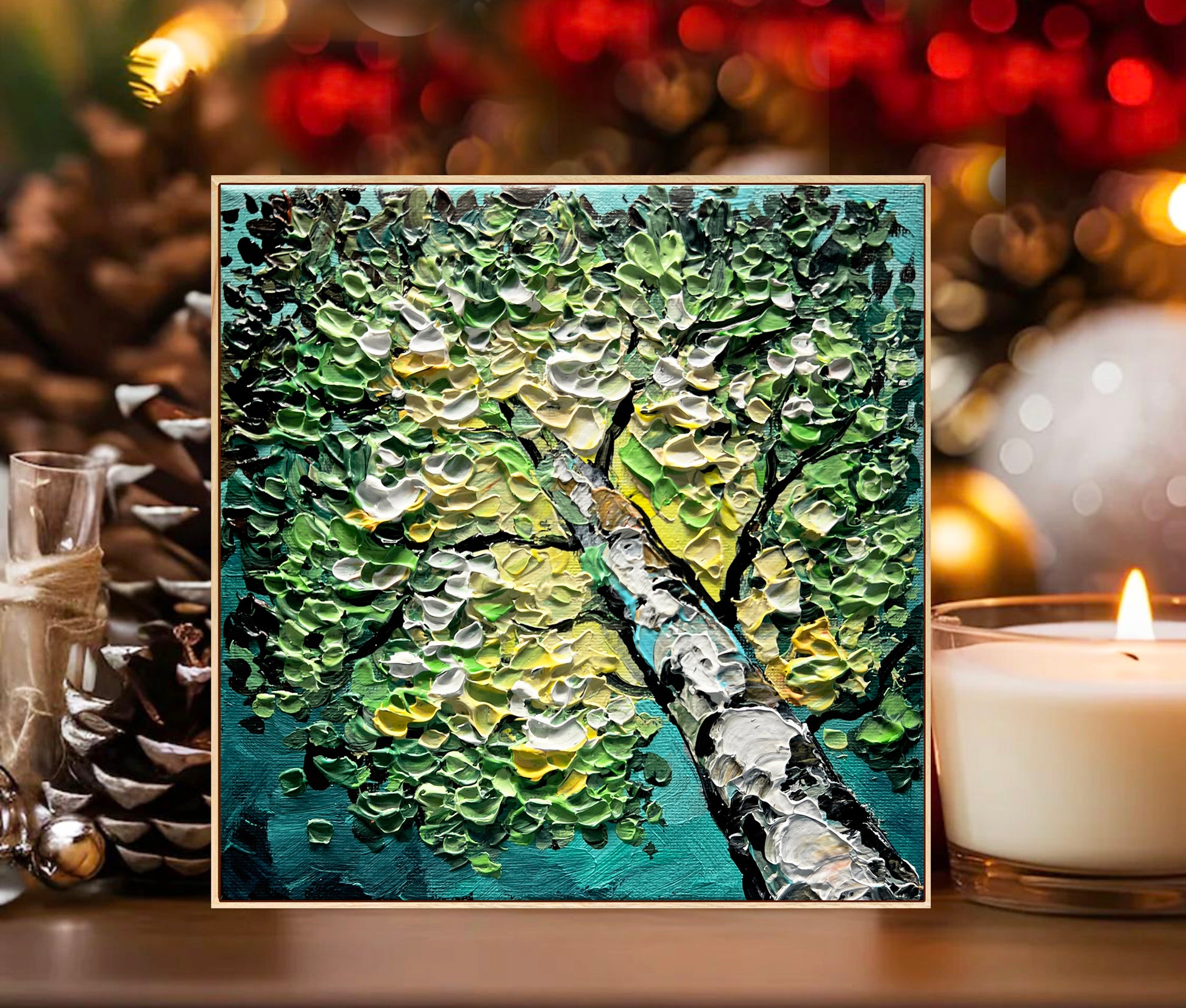 Created with a palette knife, the thick, expressive strokes add depth and movement, giving the impression of leaves gently rustling in a cool, soothing breeze.