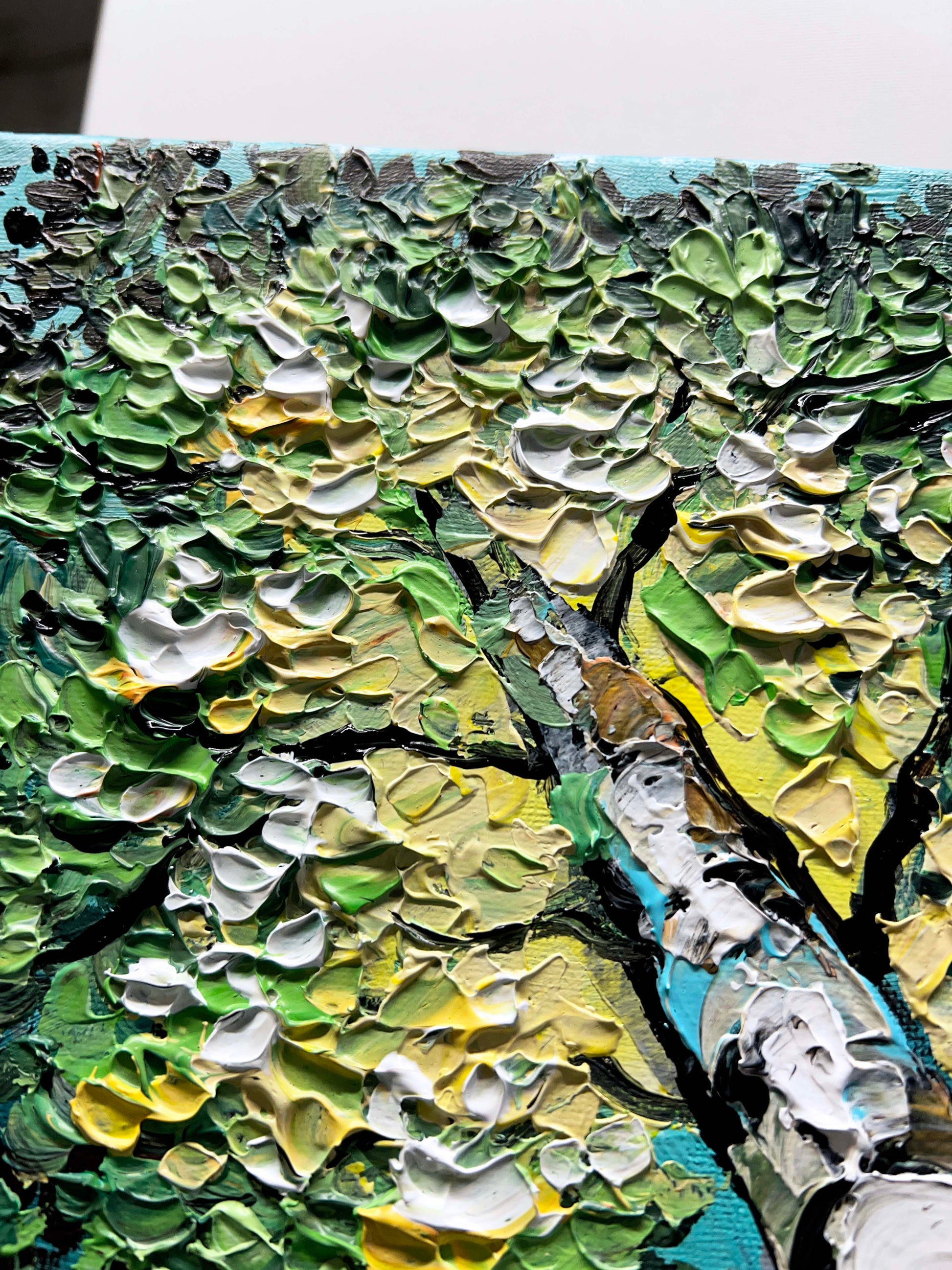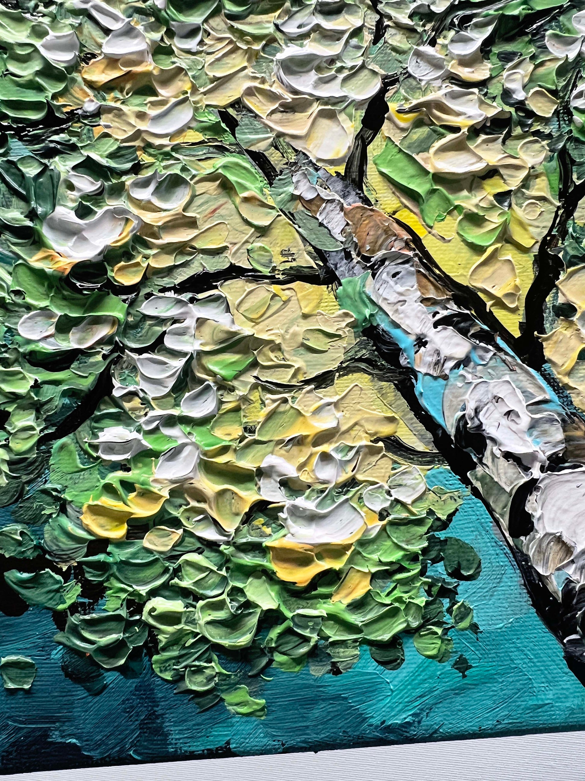 This textured painting captures the refreshing beauty of nature through the uplifting presence of a single birch tree.