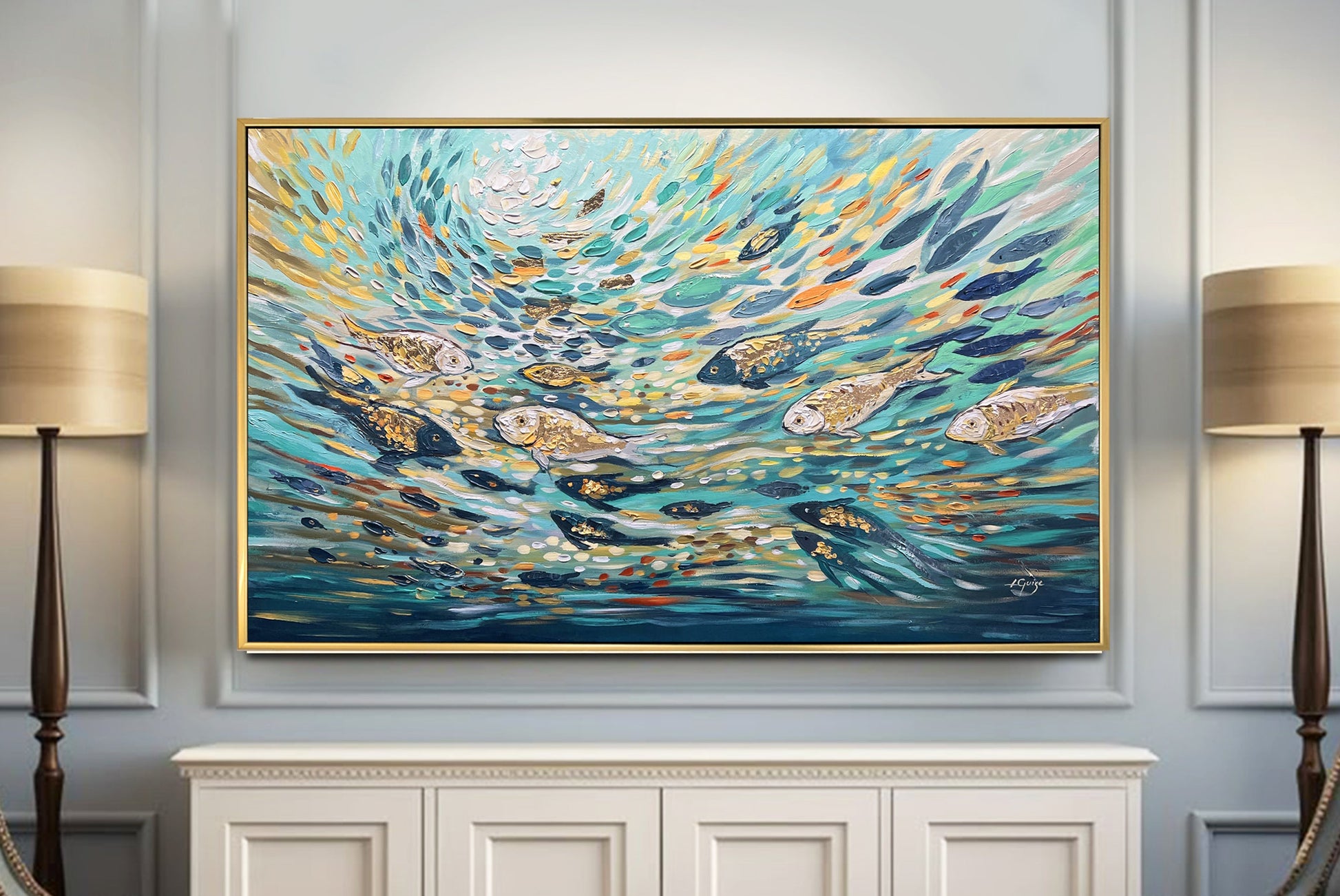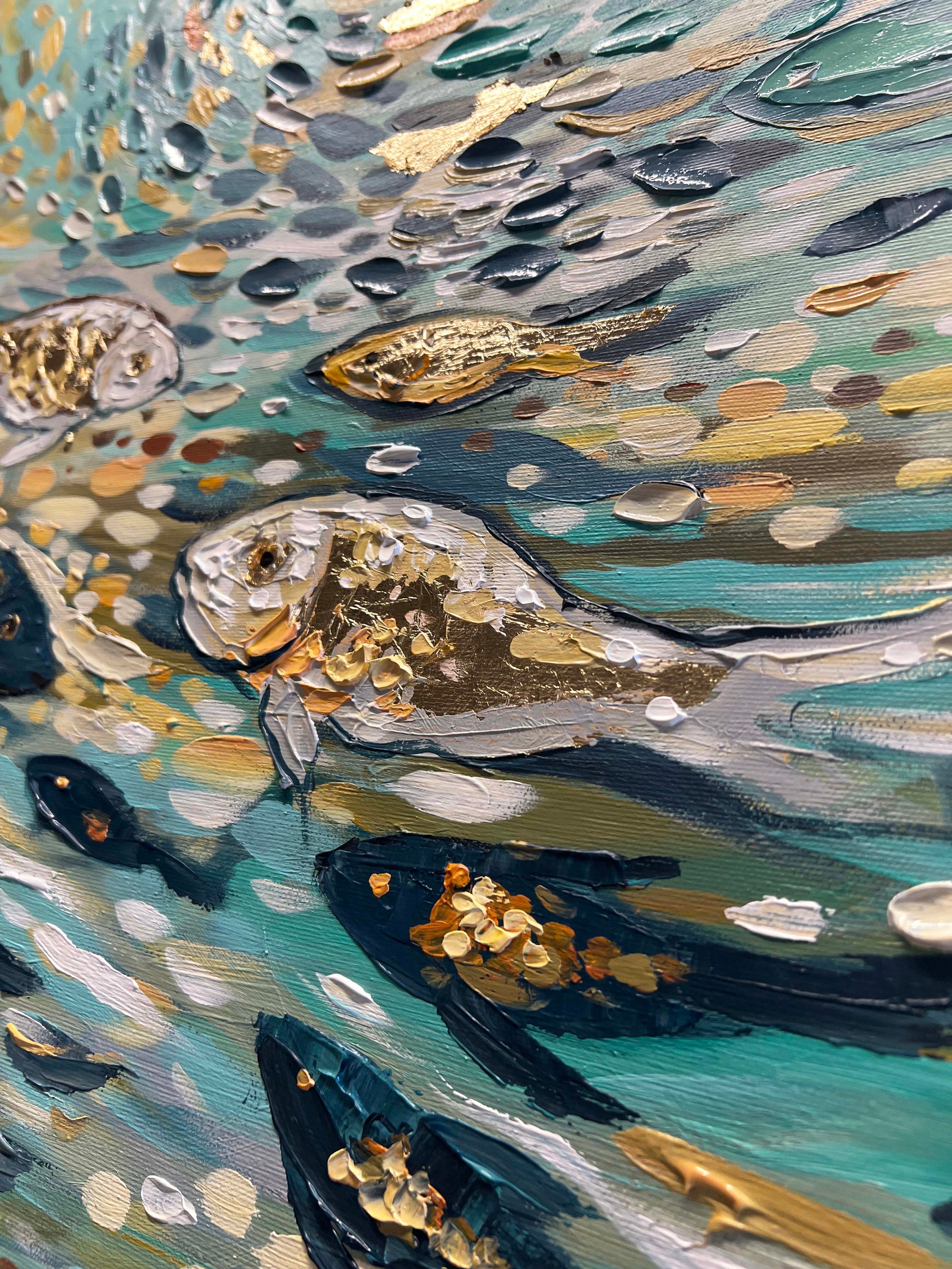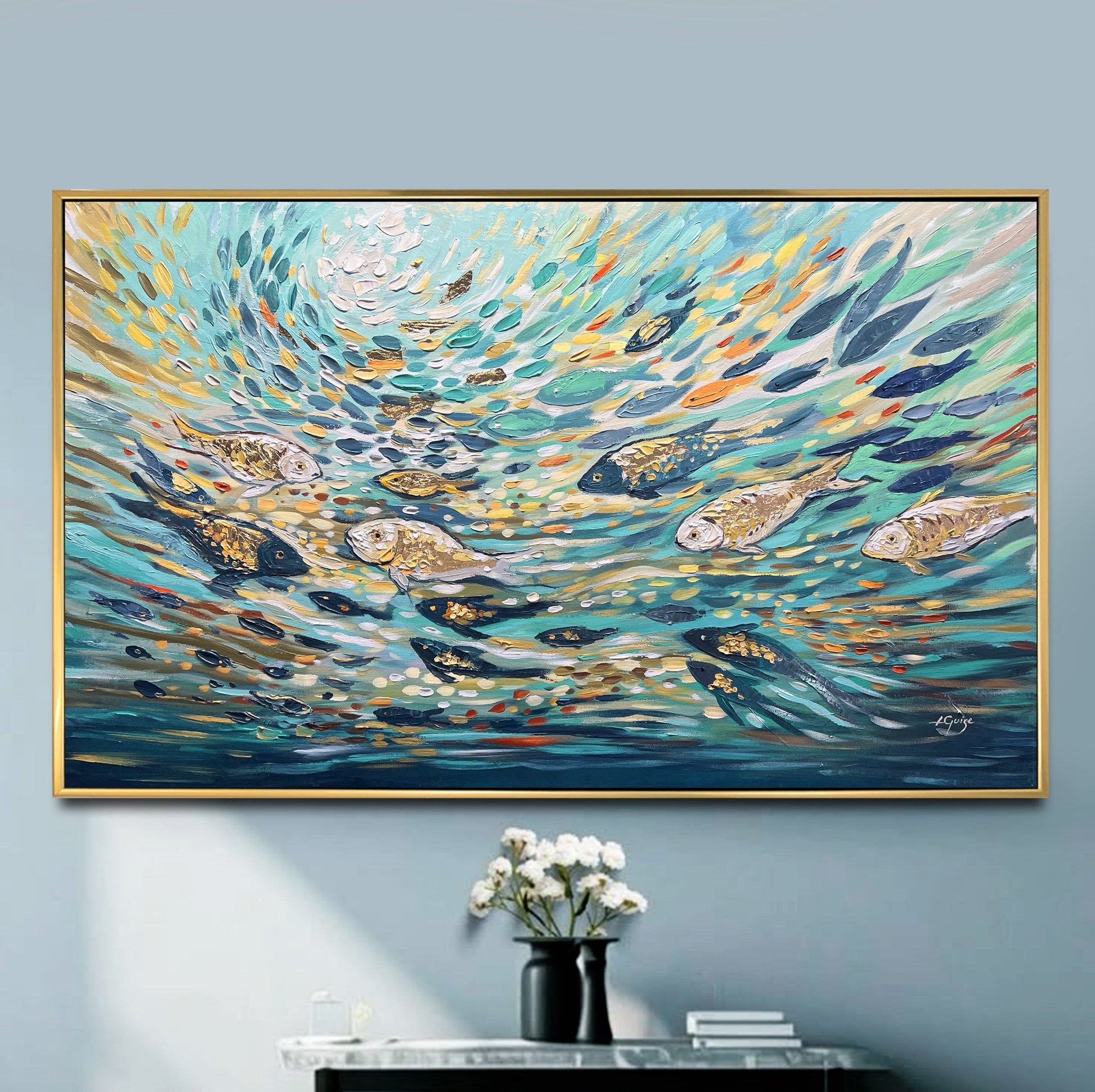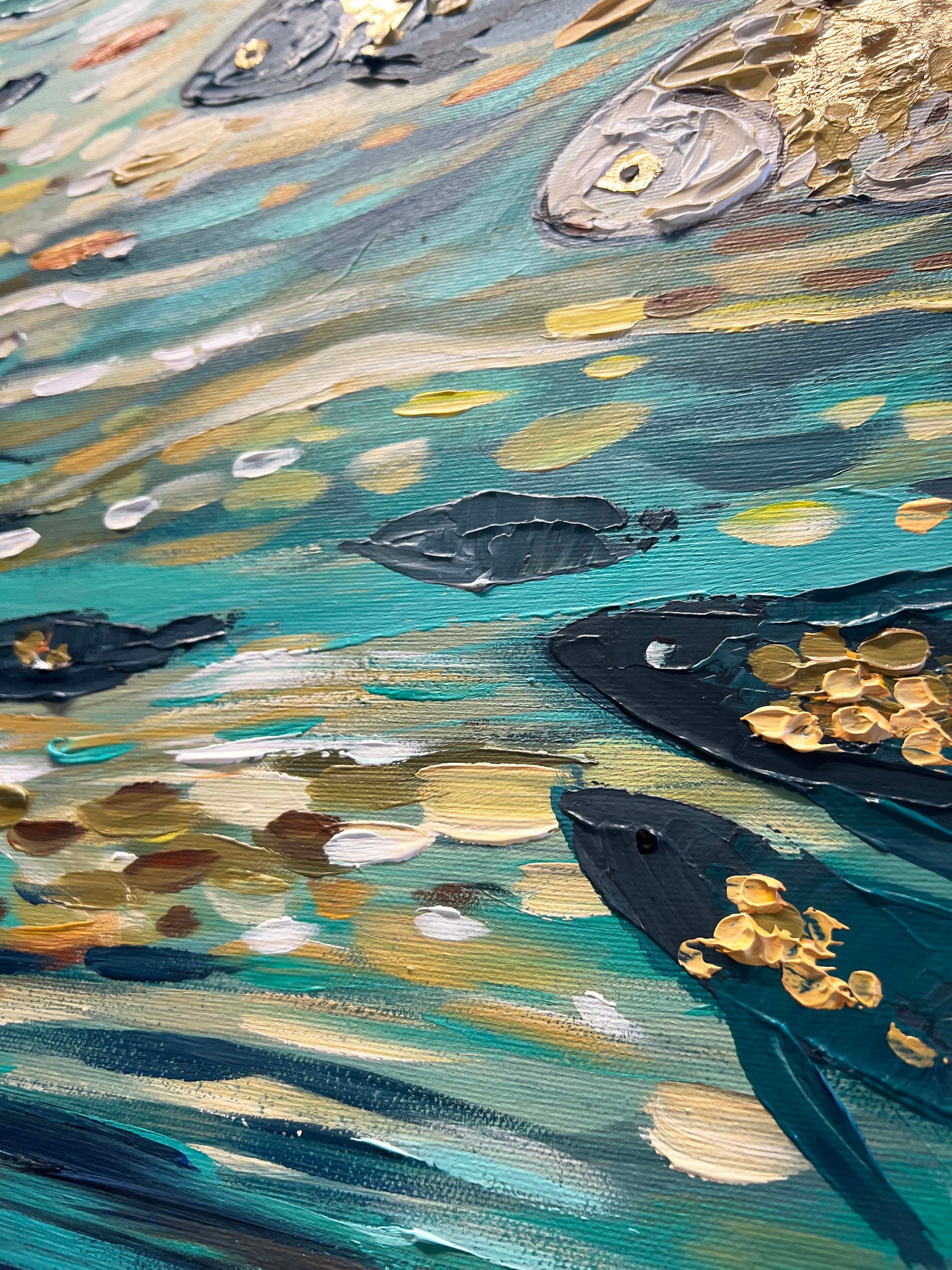 Emerald Drift is a captivating, textured underwater scene that radiates motion, light, and elegance. At the heart of the painting, a graceful group of golden hued fish glides through luminous teal and turquoise waters.