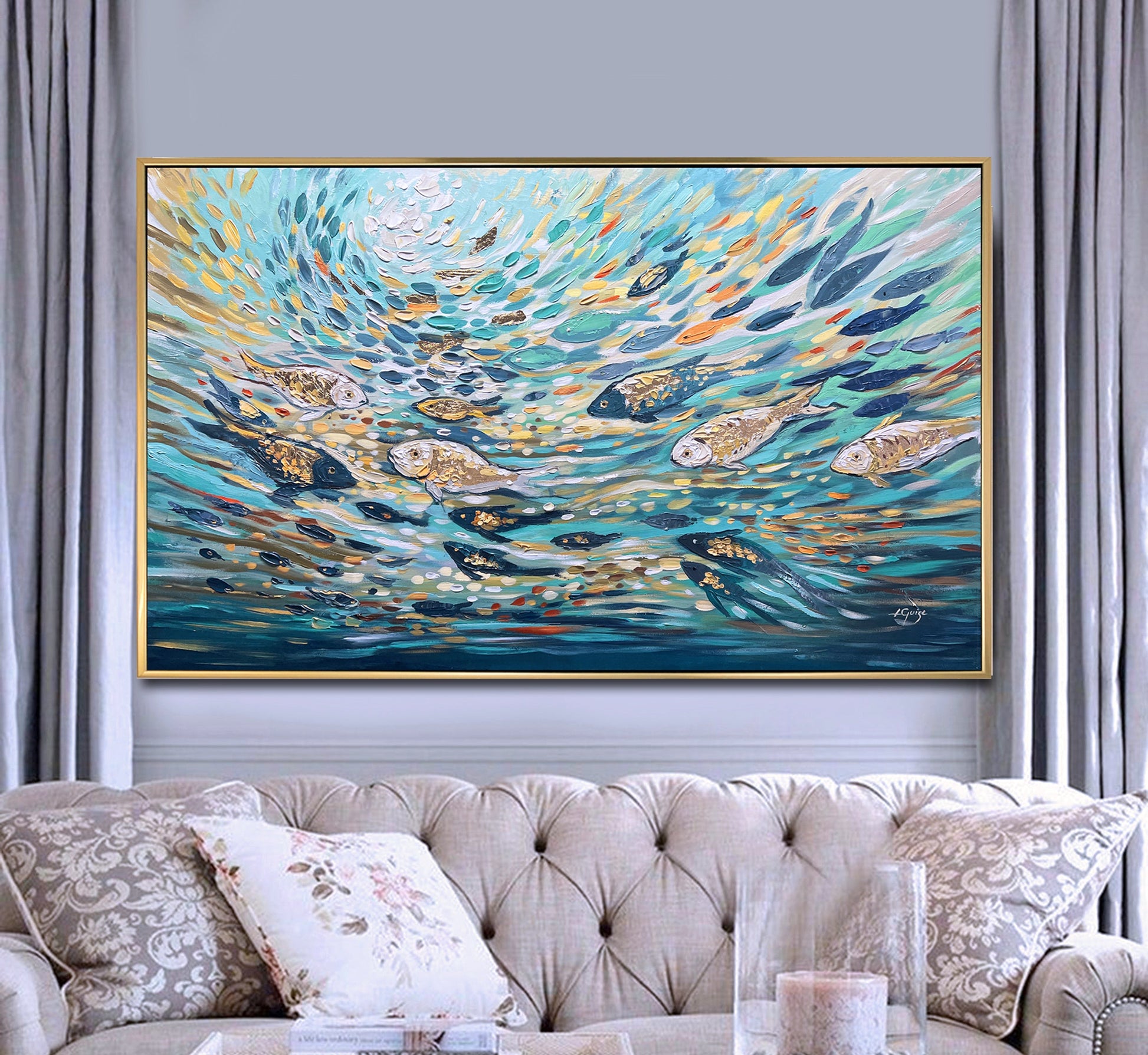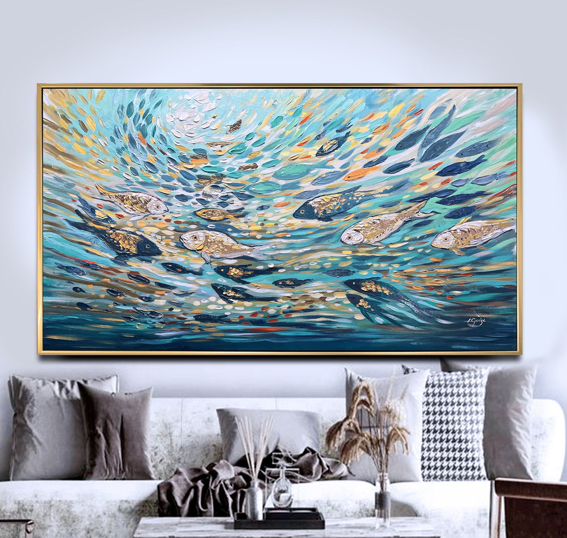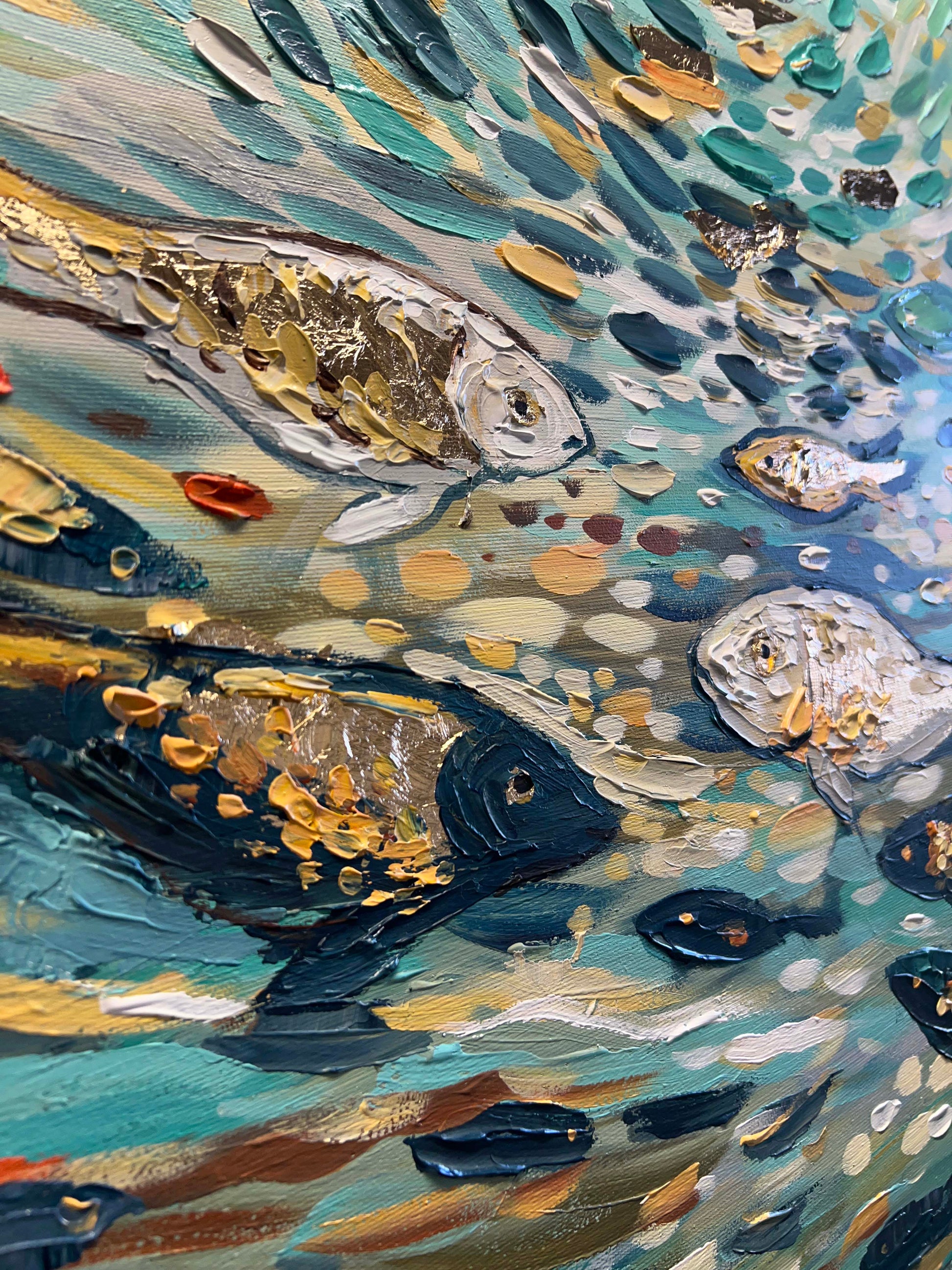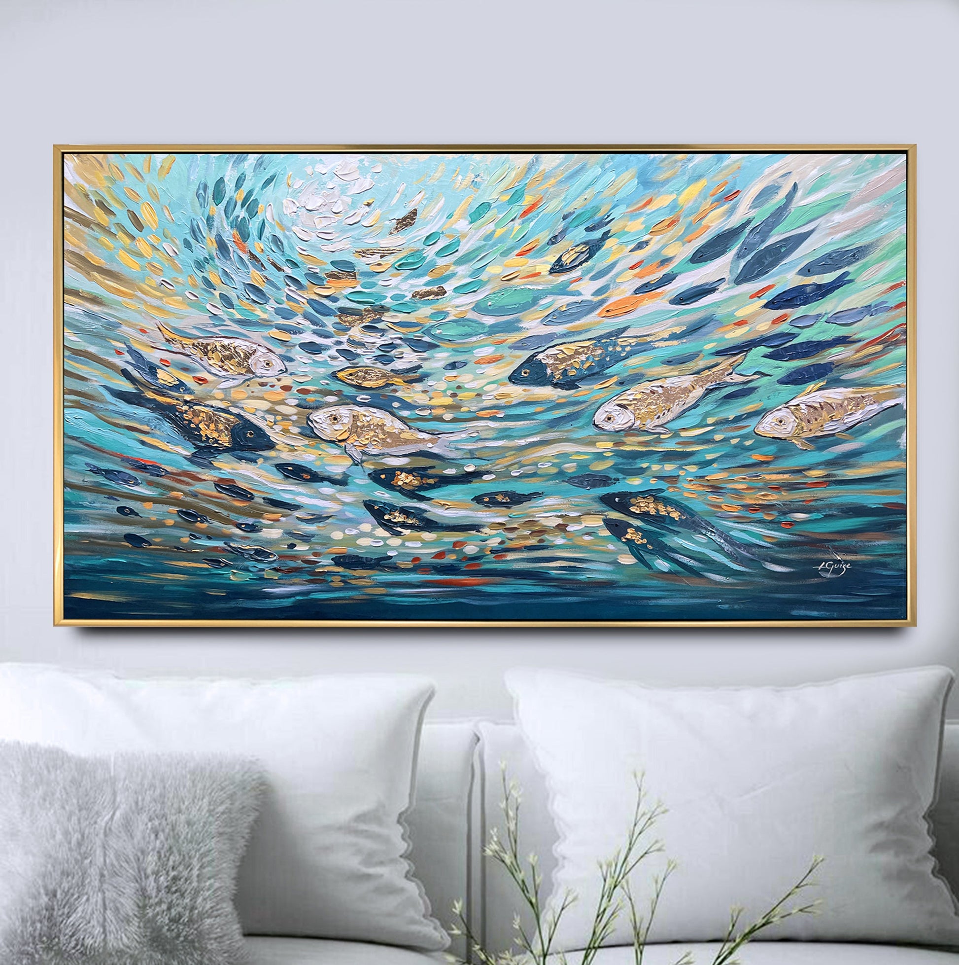 Emerald Drift is a captivating, textured underwater scene that radiates motion, light, and elegance. At the heart of the painting, a graceful group of golden hued fish glides through luminous teal and turquoise waters.