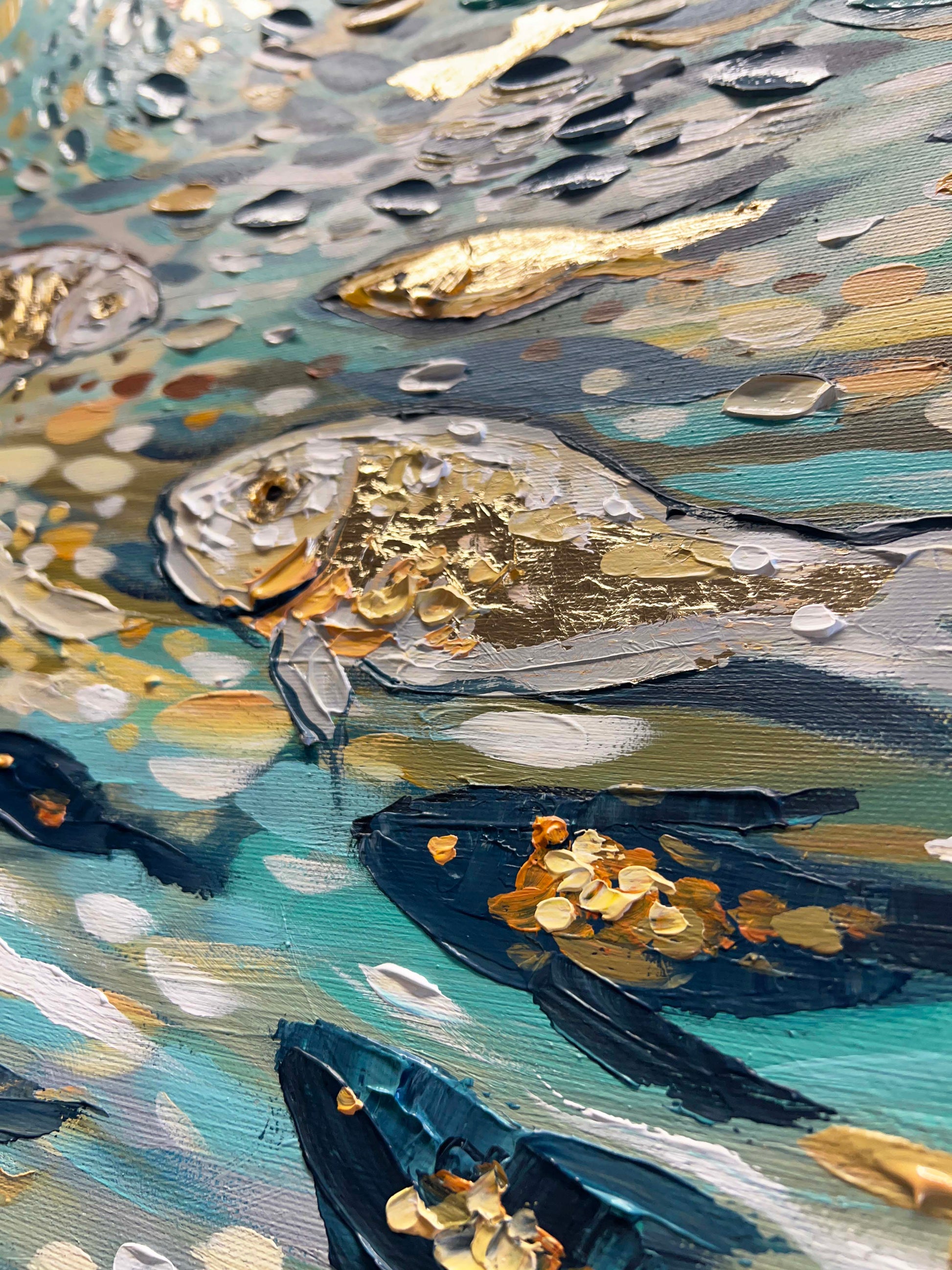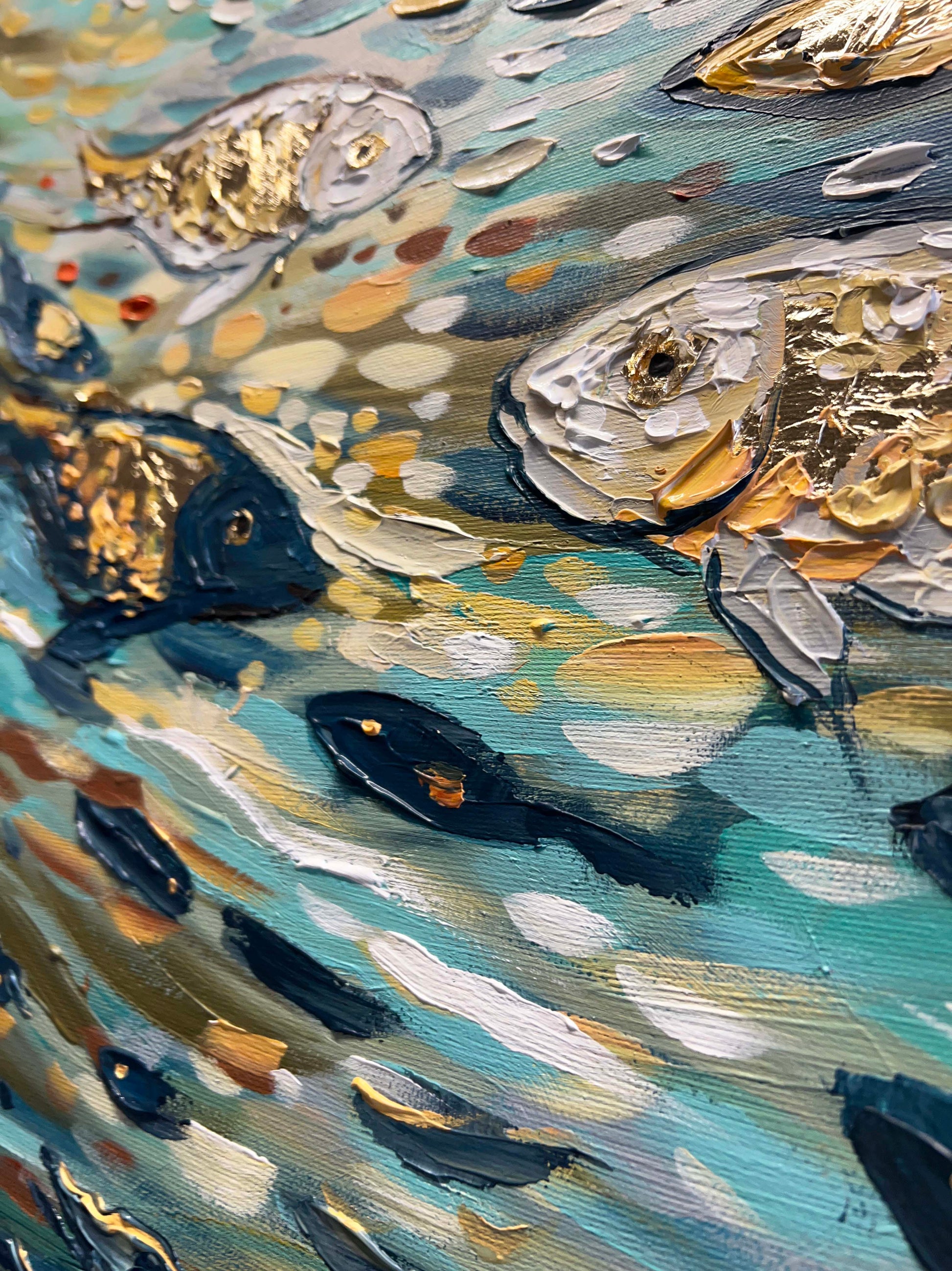 Each fish is delicately highlighted with gold leaf accents, adding shimmer and depth to their graceful forms.
