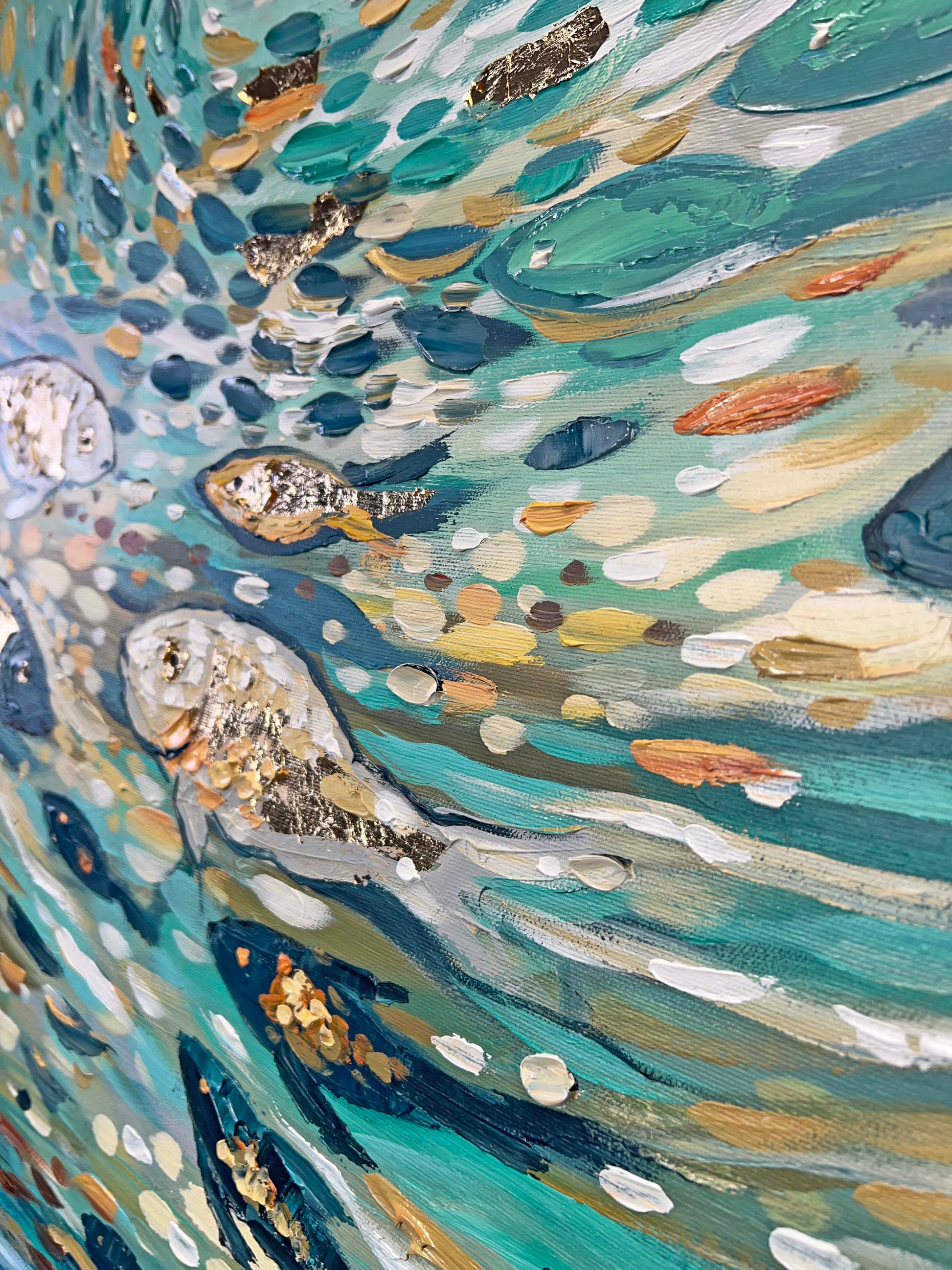 The flowing brushstrokes show the gentle movement of water, creating a calm and lively feel. Touches of gold, navy, and coral add light and color, like sunlight shining through the water.