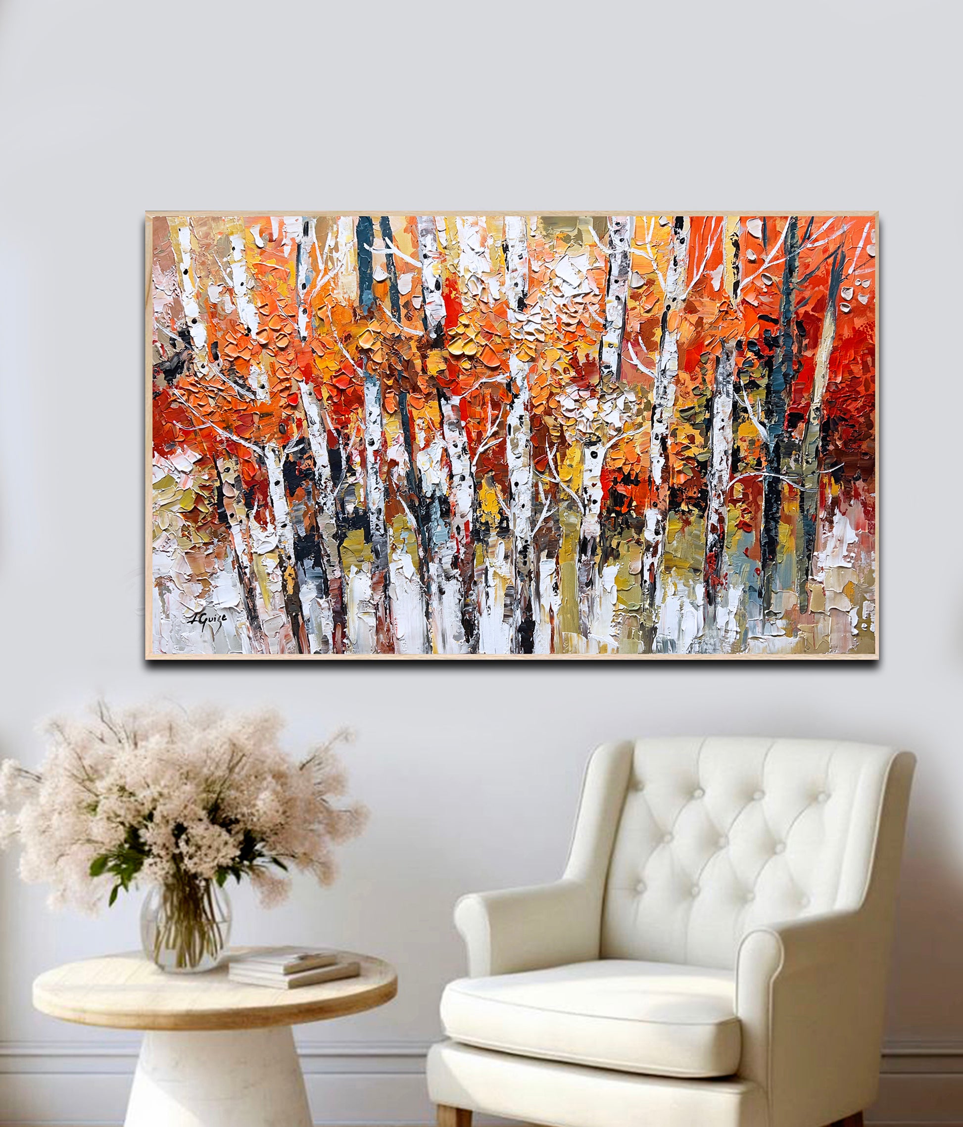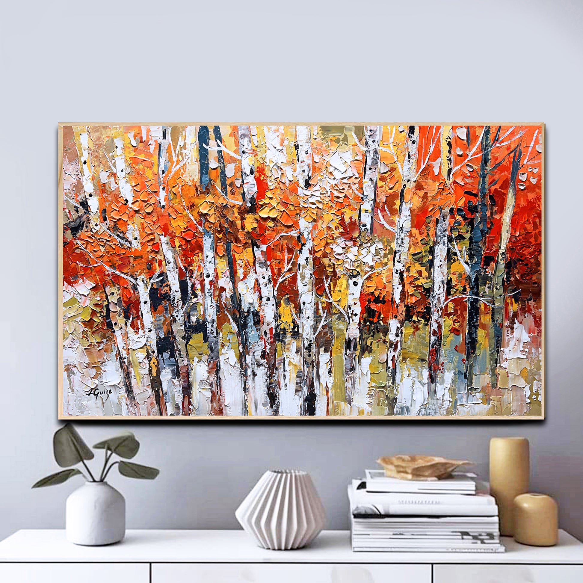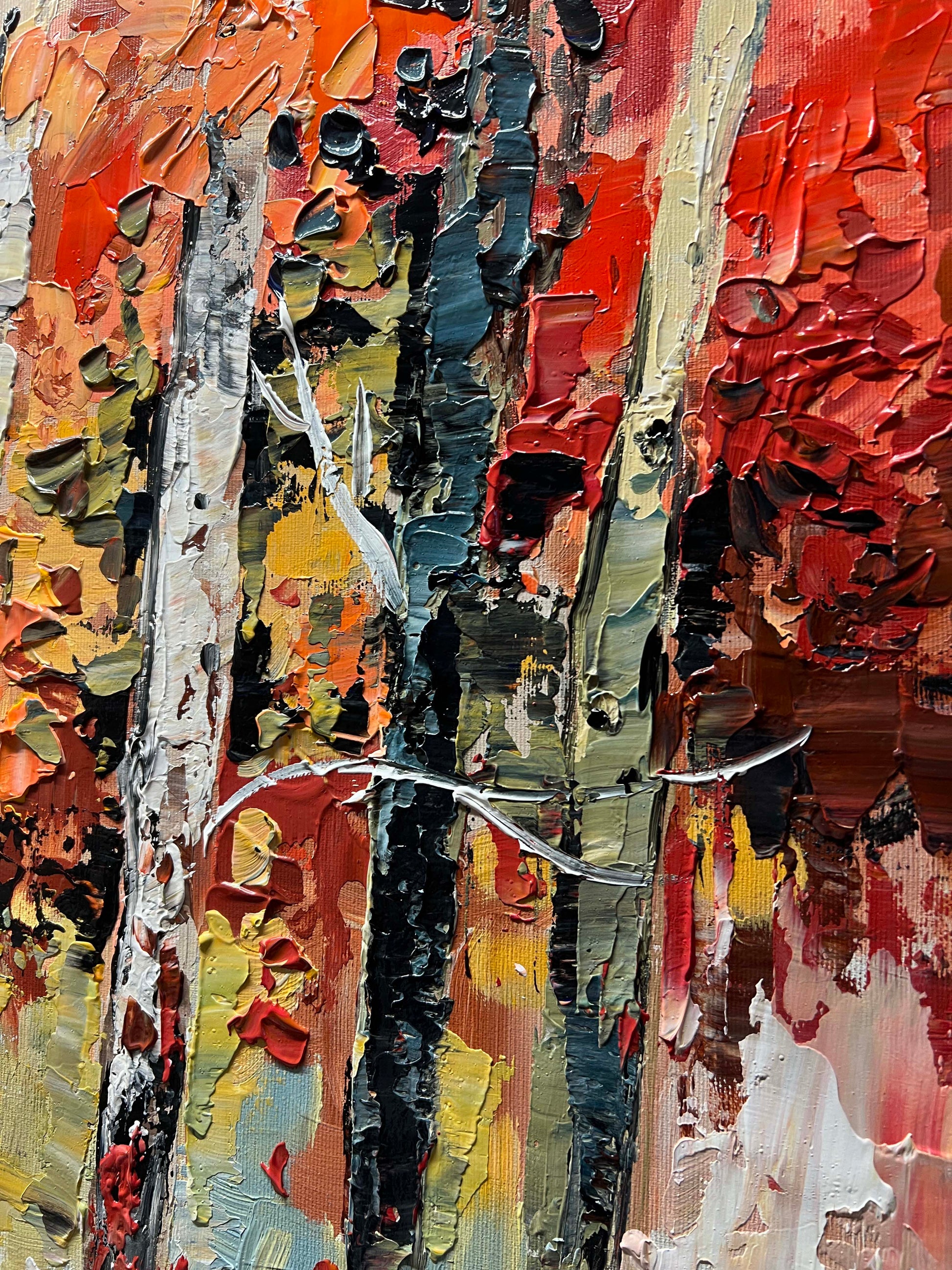 Thick, textured palette knife strokes create dynamic birch trunks rising through a vibrant canopy of fiery reds, oranges, yellows, and touches of earthy neutrals.