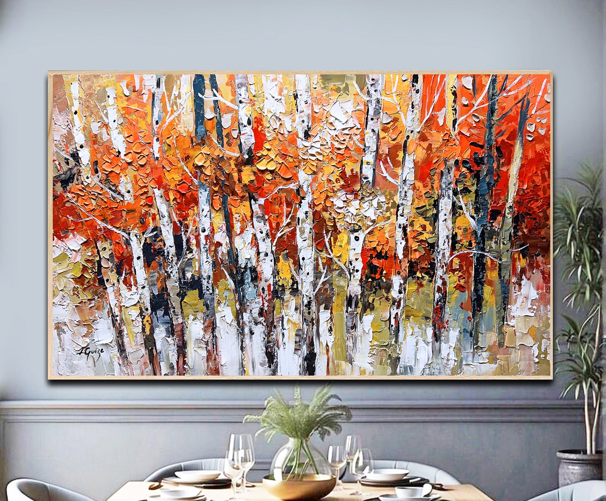 Thick, textured palette knife strokes create dynamic birch trunks rising through a vibrant canopy of fiery reds, oranges, yellows, and touches of earthy neutrals.