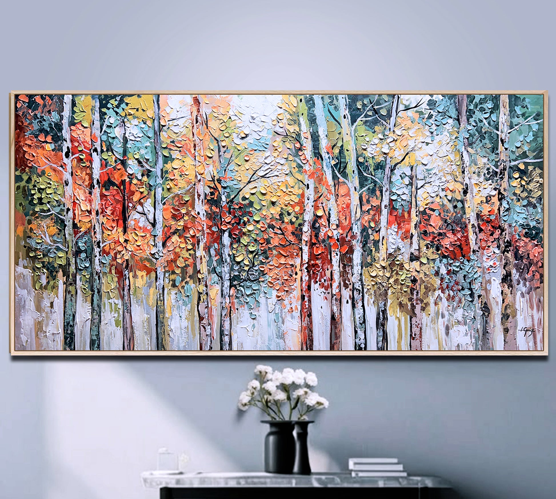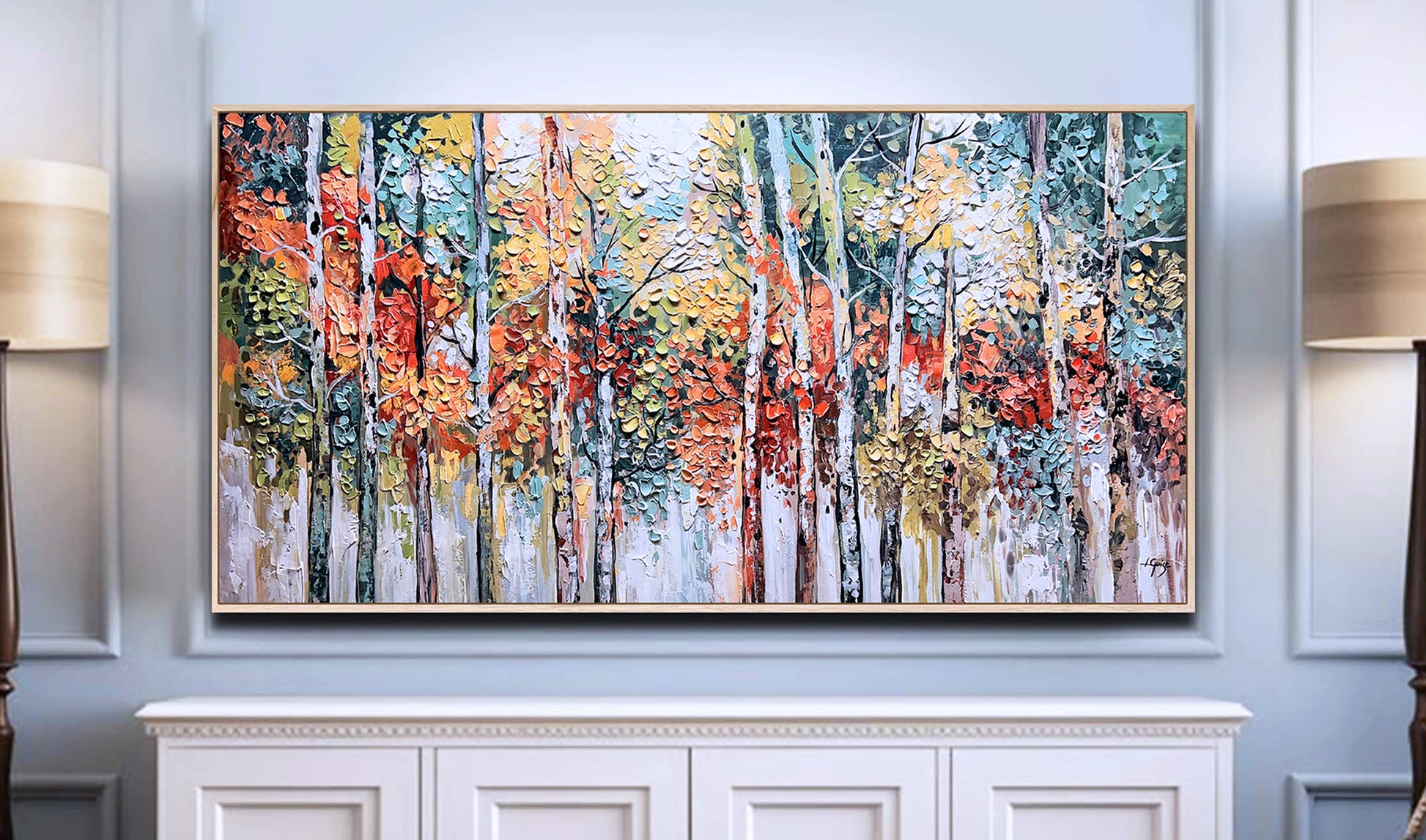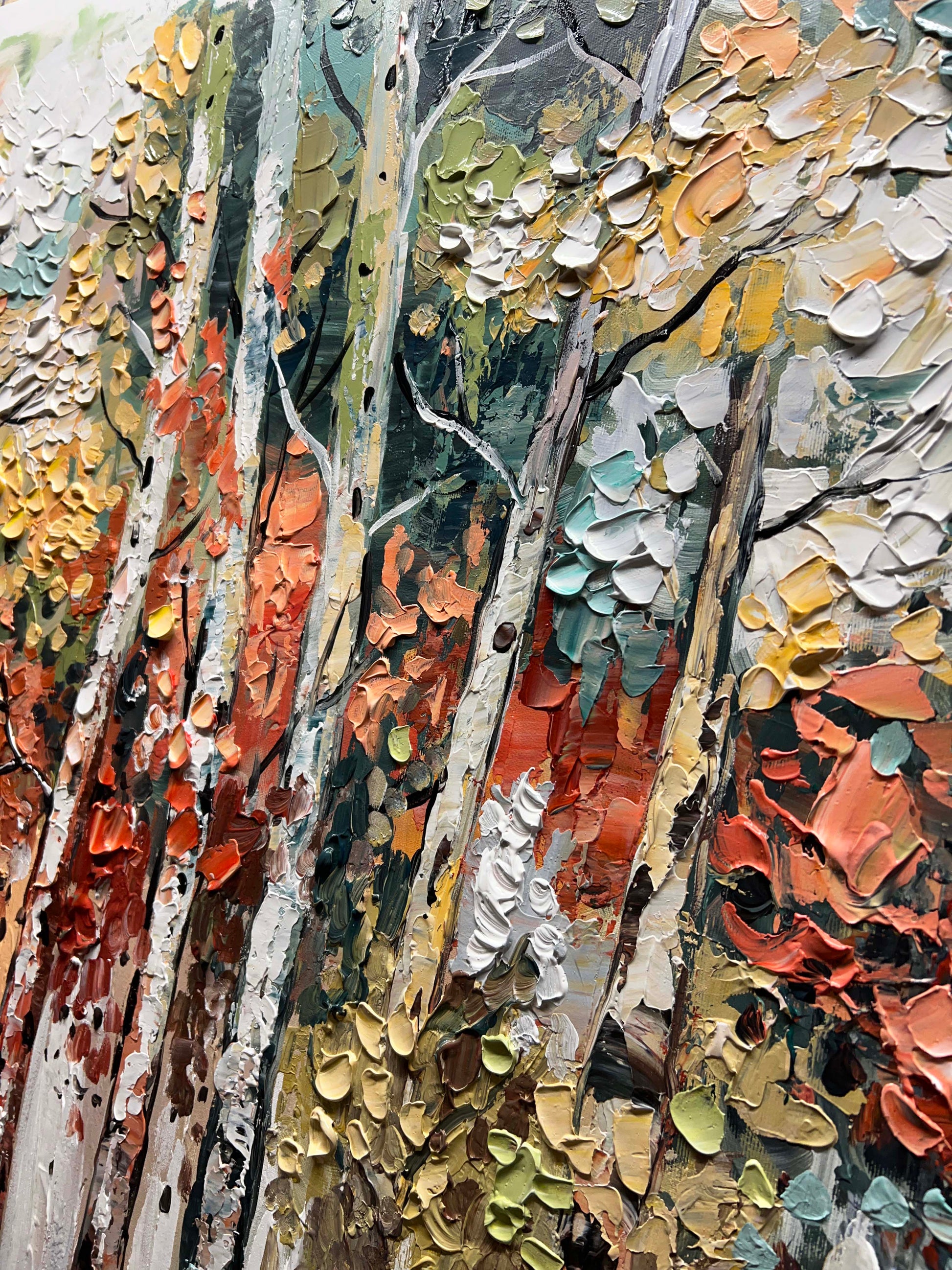 “Glow Birches” is a vibrant and expressive abstract forest painting that captures the radiant energy of a birch grove in full autumn color.