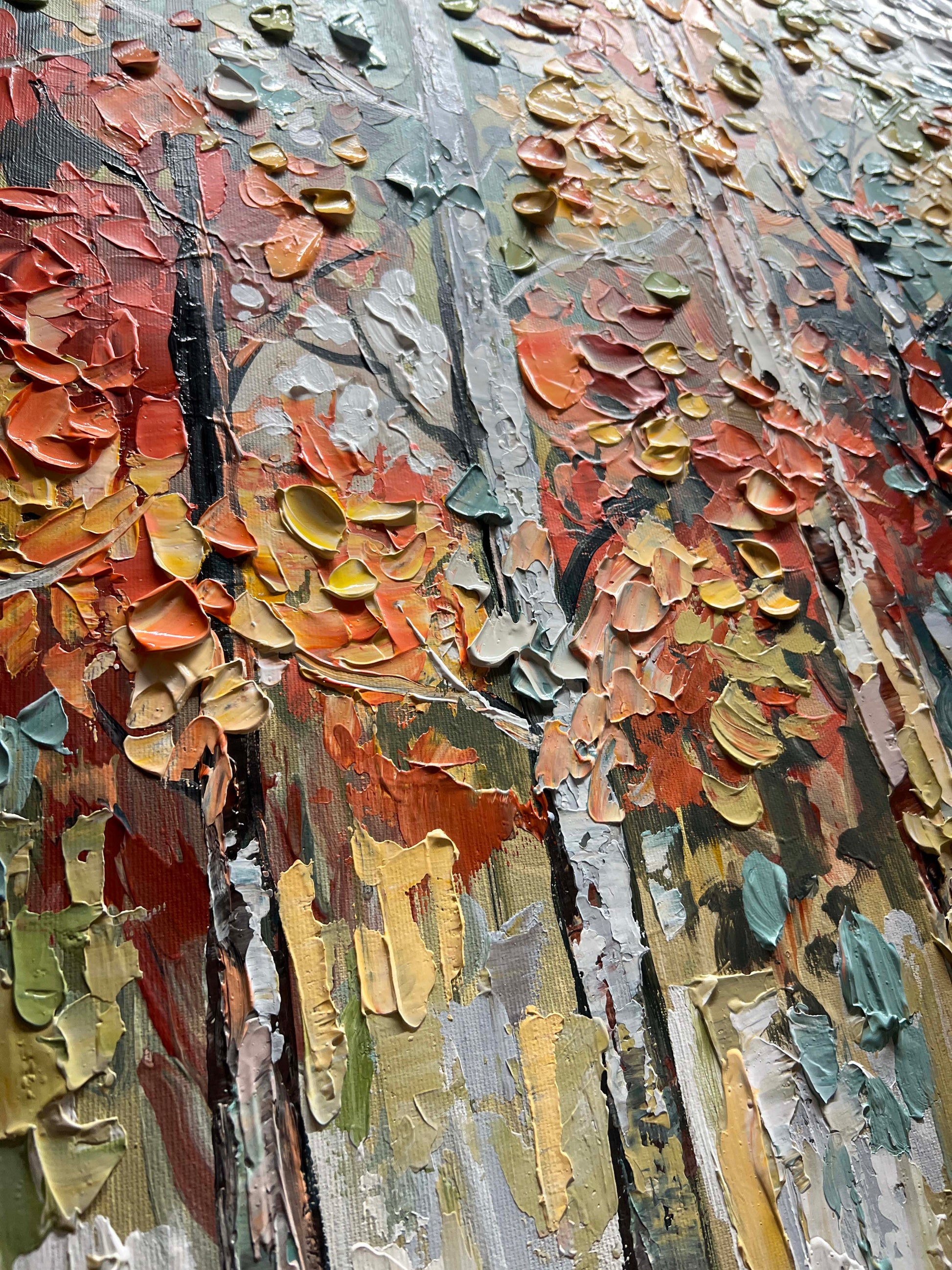 Thick, textured palette knife strokes create a lively mosaic of leaves in warm oranges, reds, yellows, and fresh touches of mint green and soft blue.