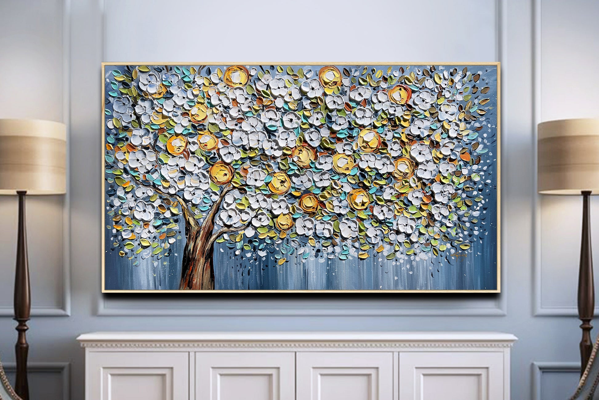 It represents a lemon tree in full bloom, with bright yellow lemons standing out beautifully against soft blue-gray tones and lively yellow-green foliage. The contrast of colors captures a sense of freshness and energy, bringing life and light into any interior.