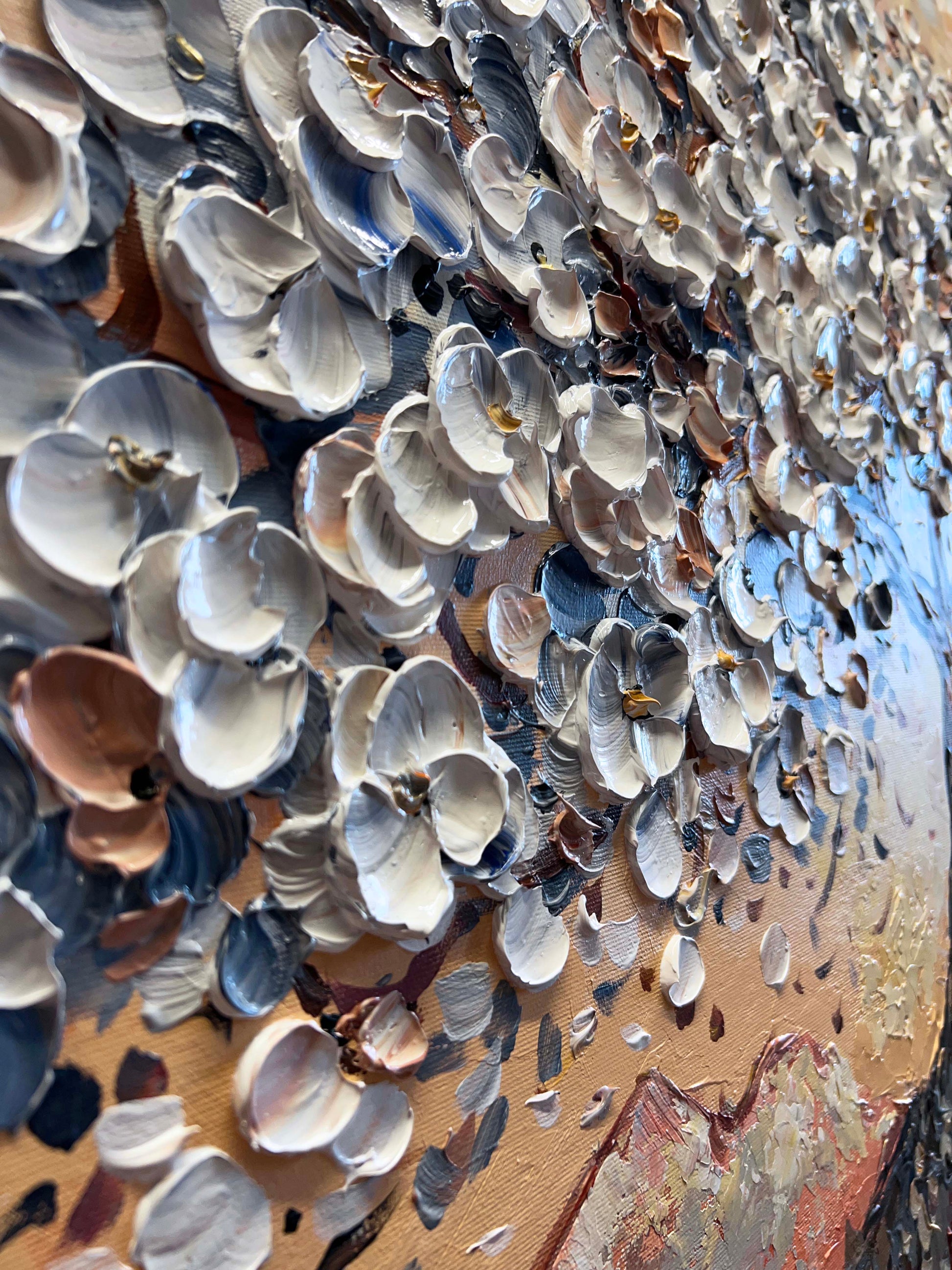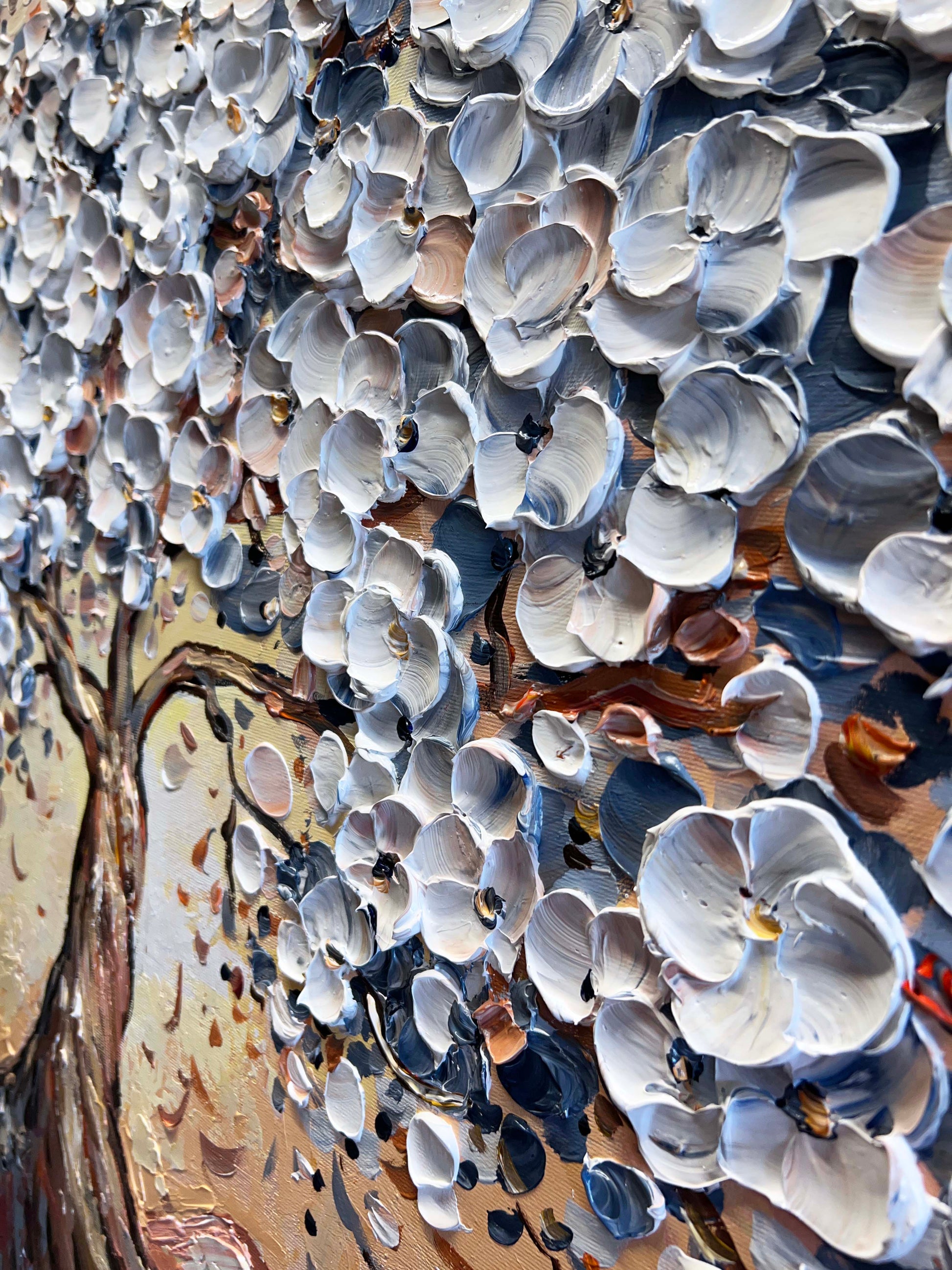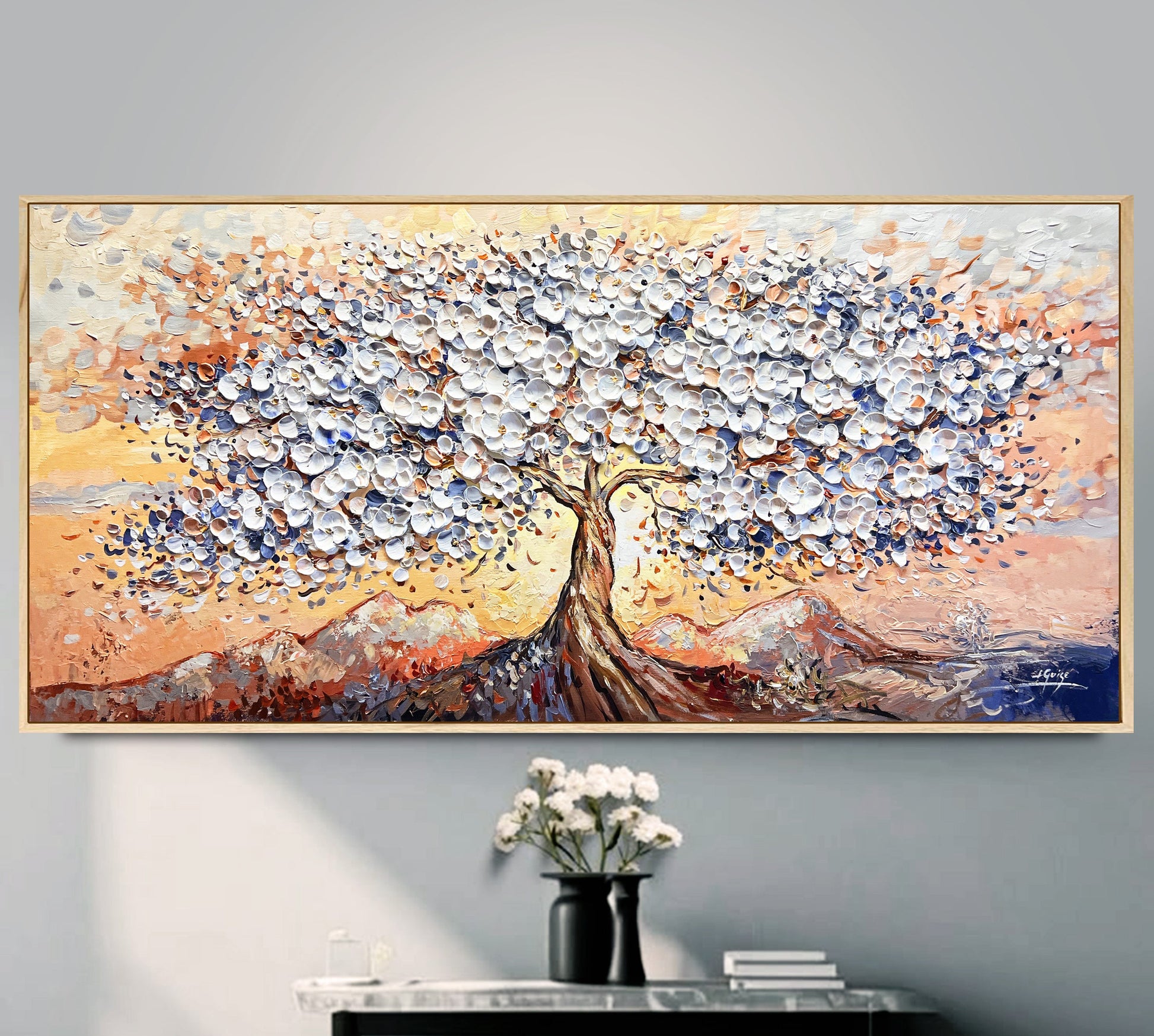 "Golden Hour Tree" is a captivating textured painting that captures the ethereal beauty of a blossoming tree bathed in the soft, golden light of sunset.
