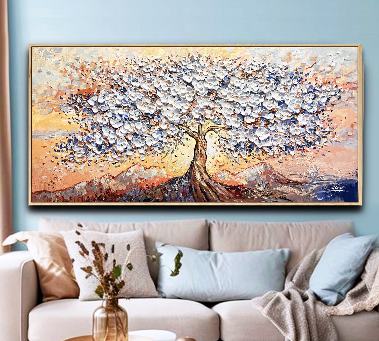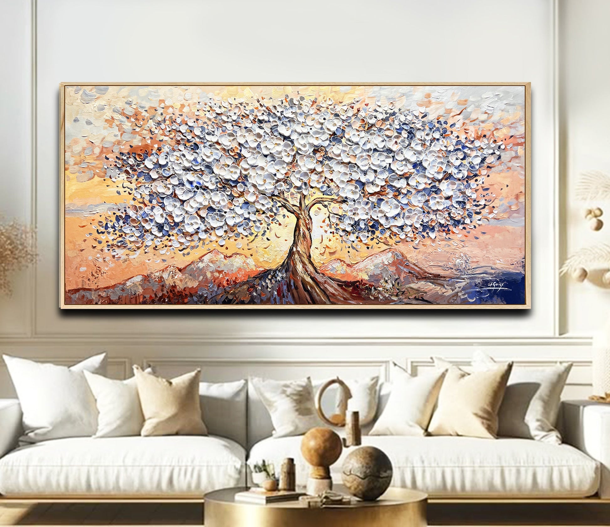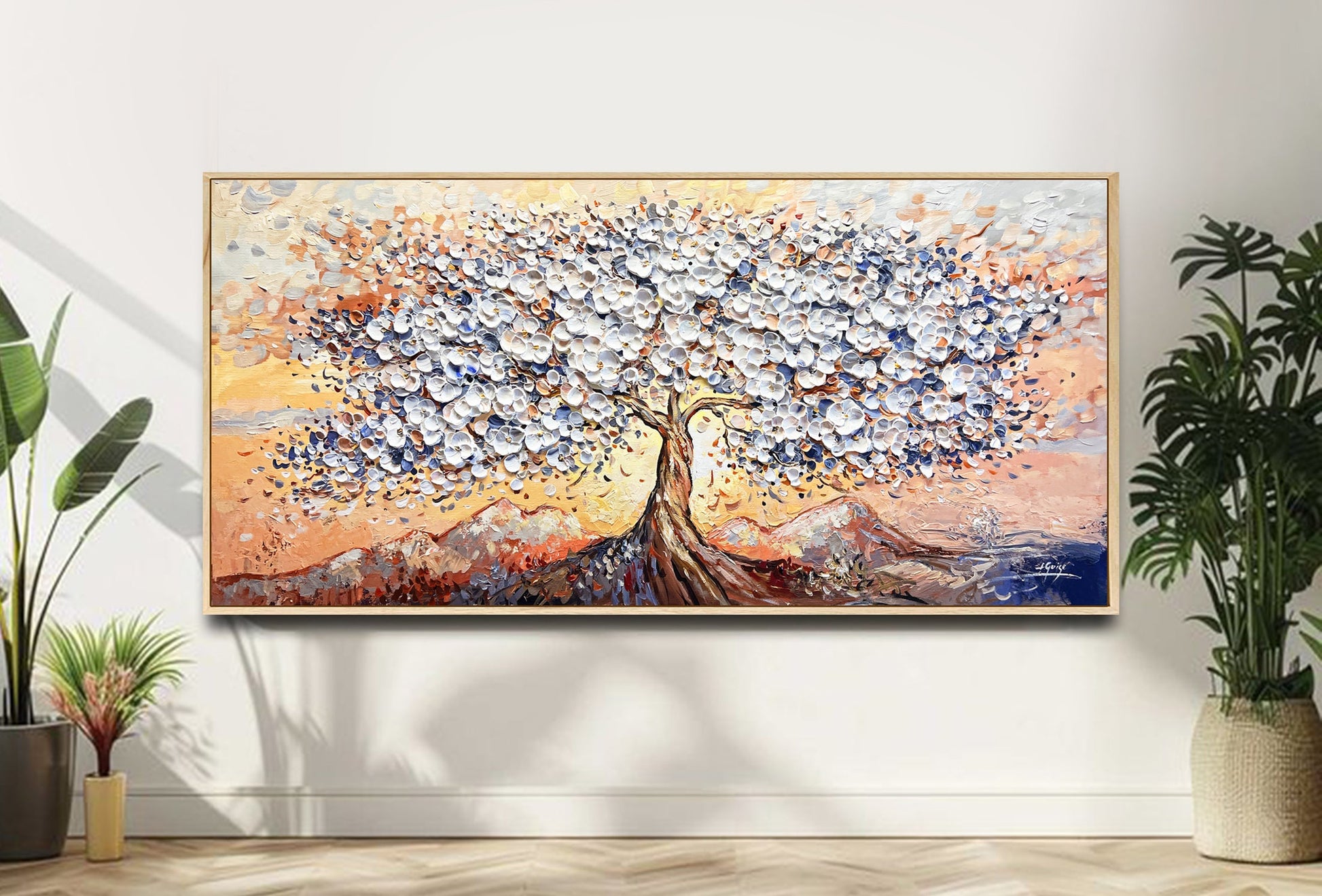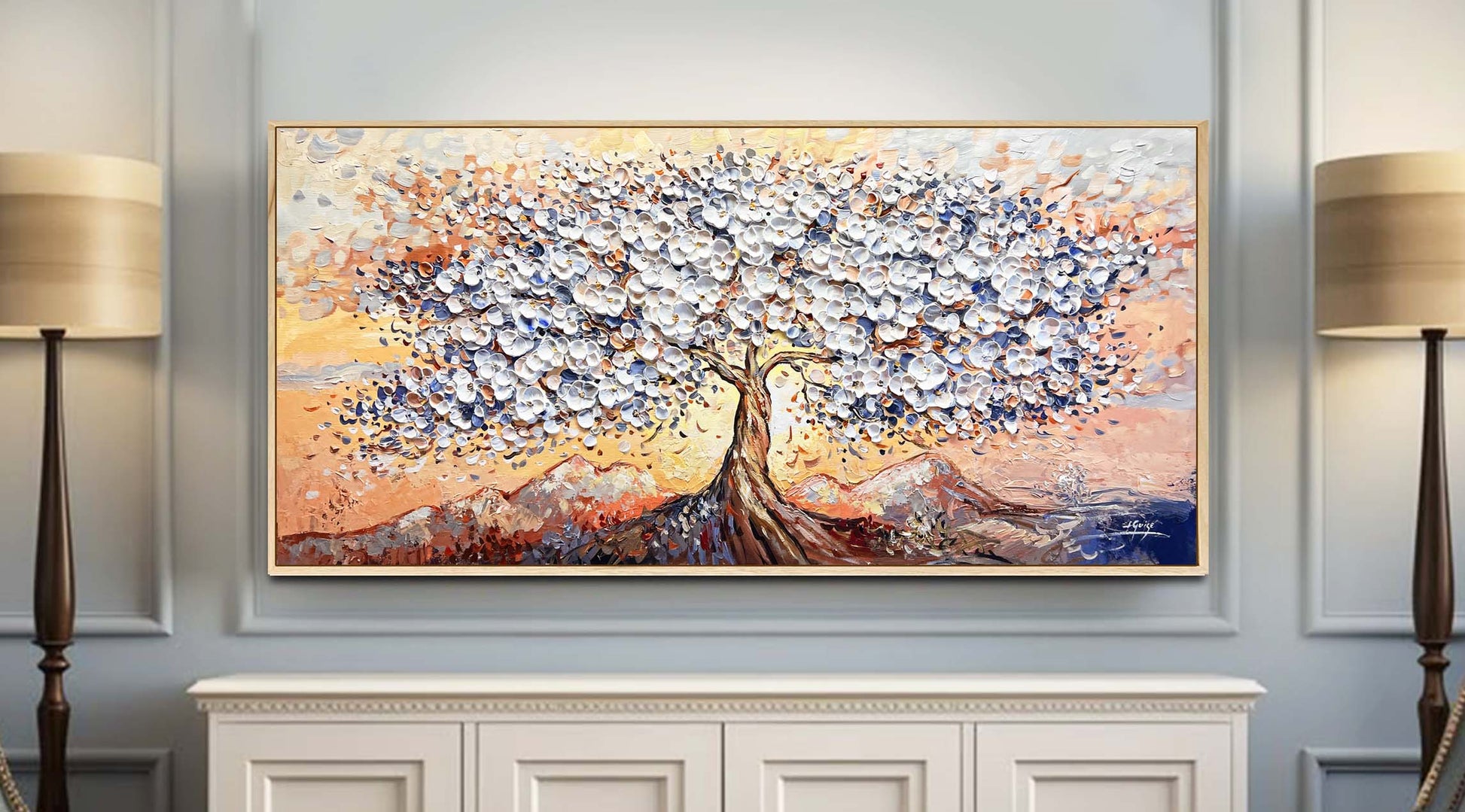 "Golden Hour Tree" is a captivating textured painting that captures the ethereal beauty of a blossoming tree bathed in the soft, golden light of sunset.
