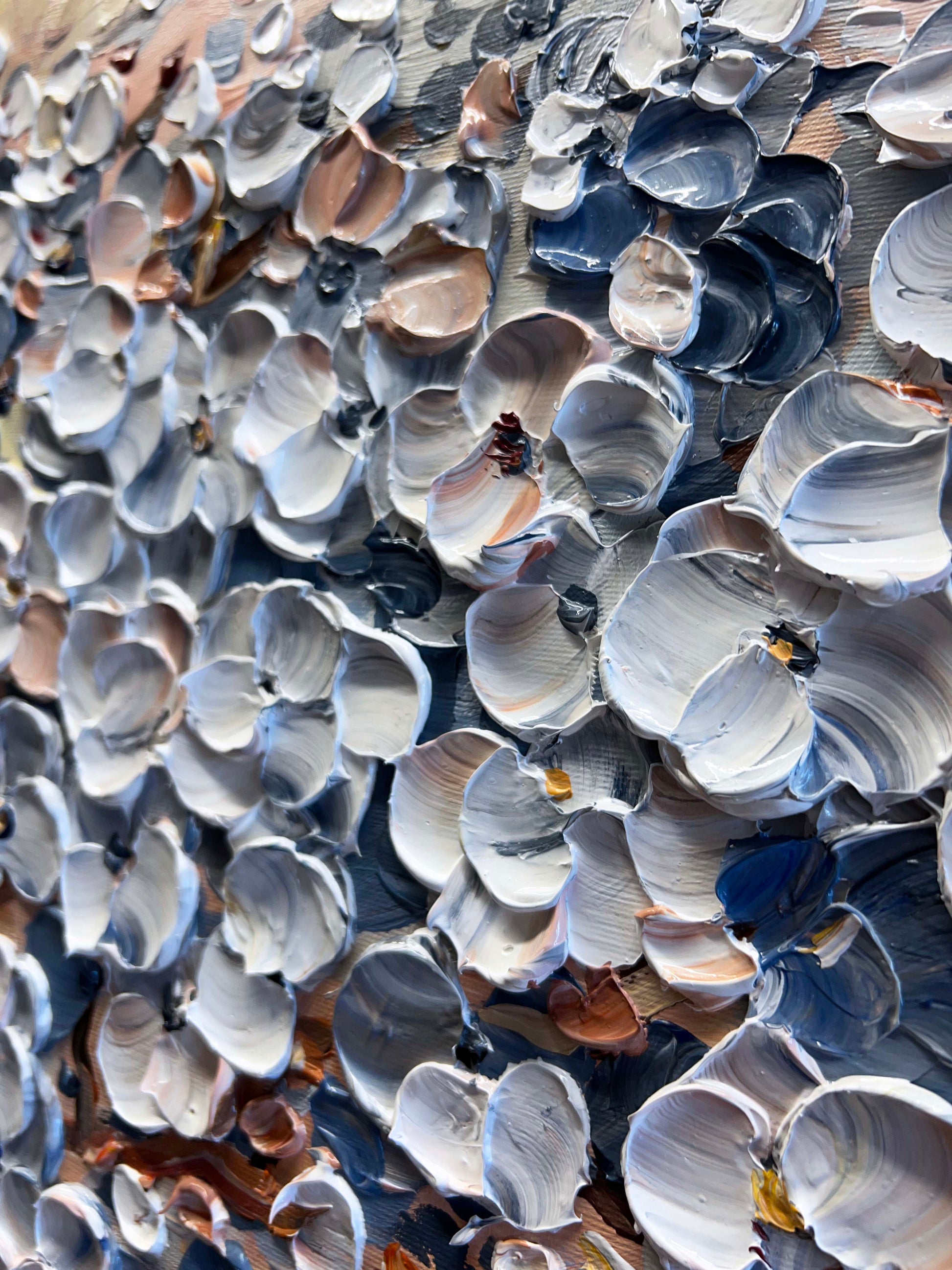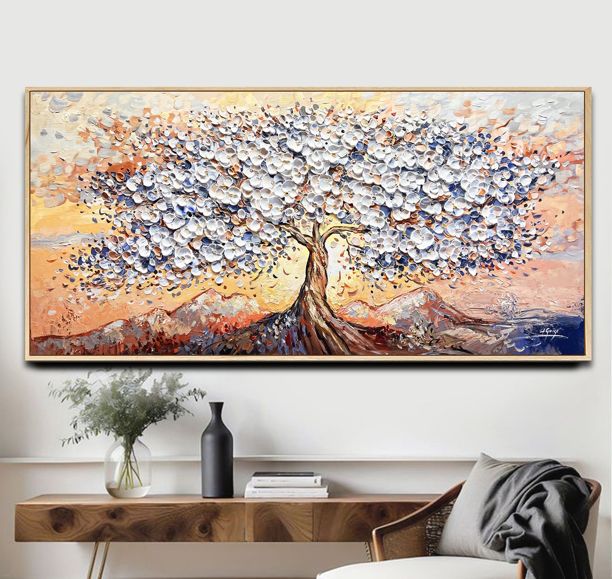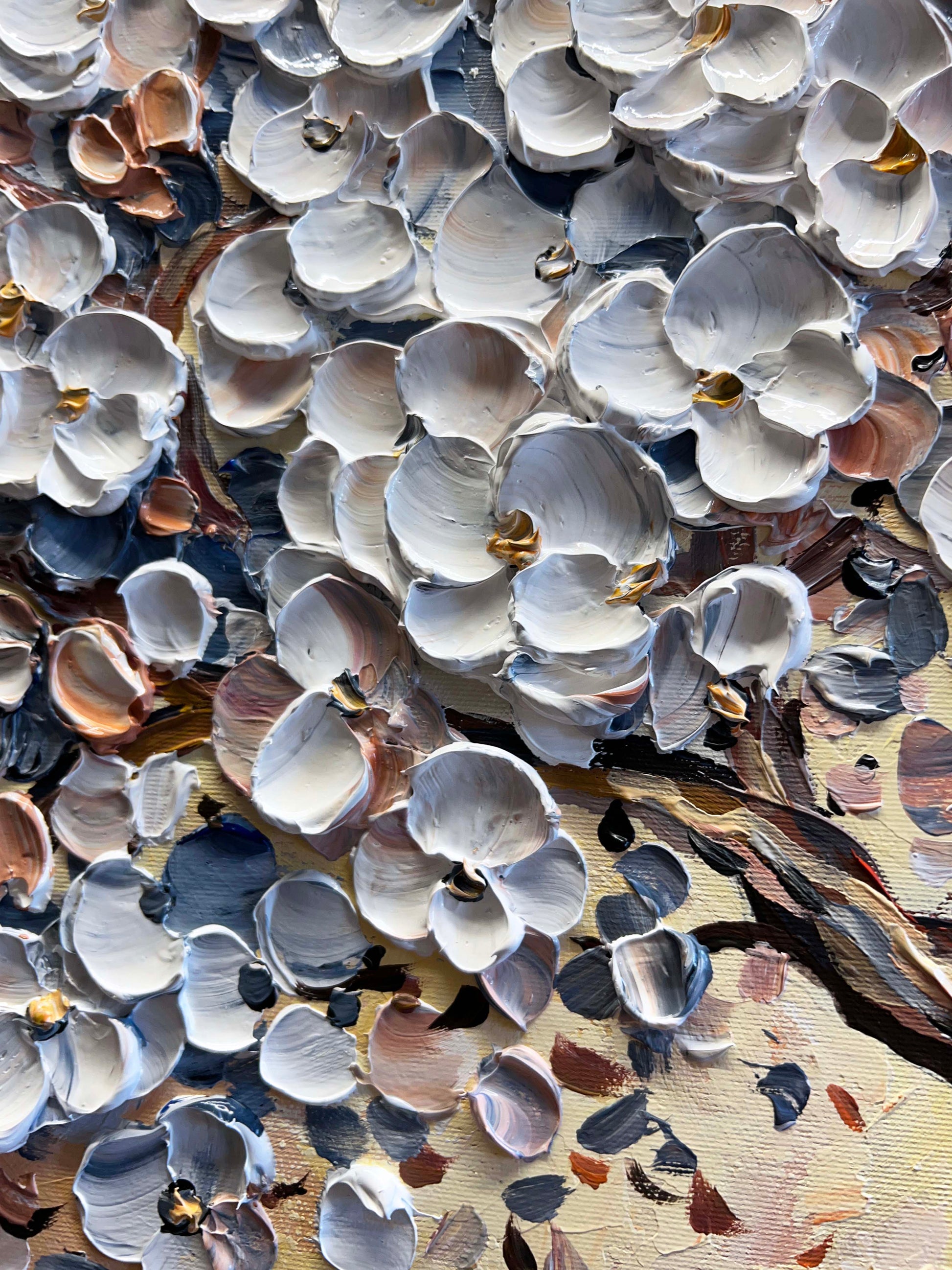 The richly textured white blossoms, applied with bold palette knife strokes, burst forward with dimension and vitality. Shades of warm peach, blush pink, and muted lavender swirl across the sky, suggesting the gentle hush of twilight descending over distant mountains.