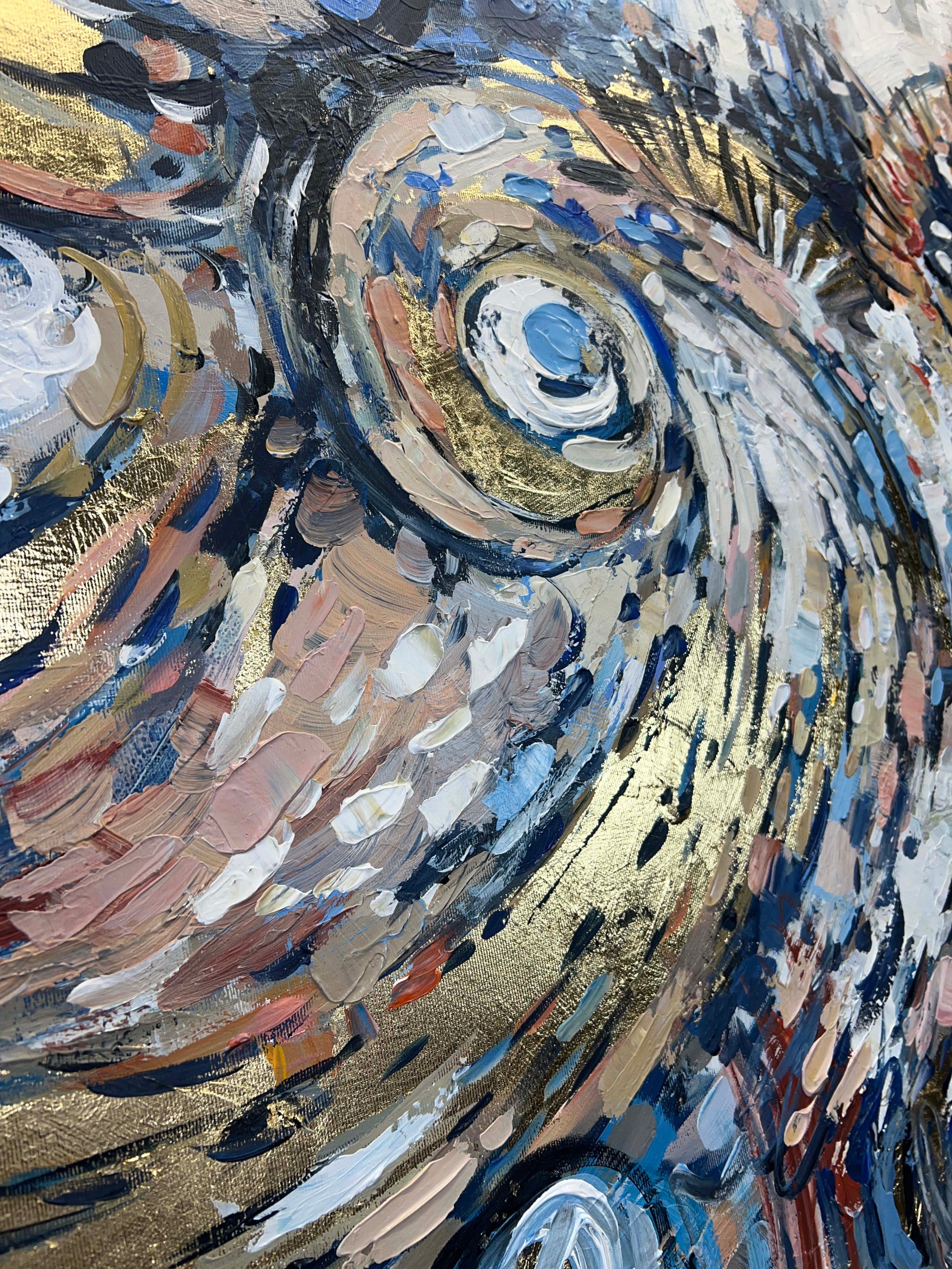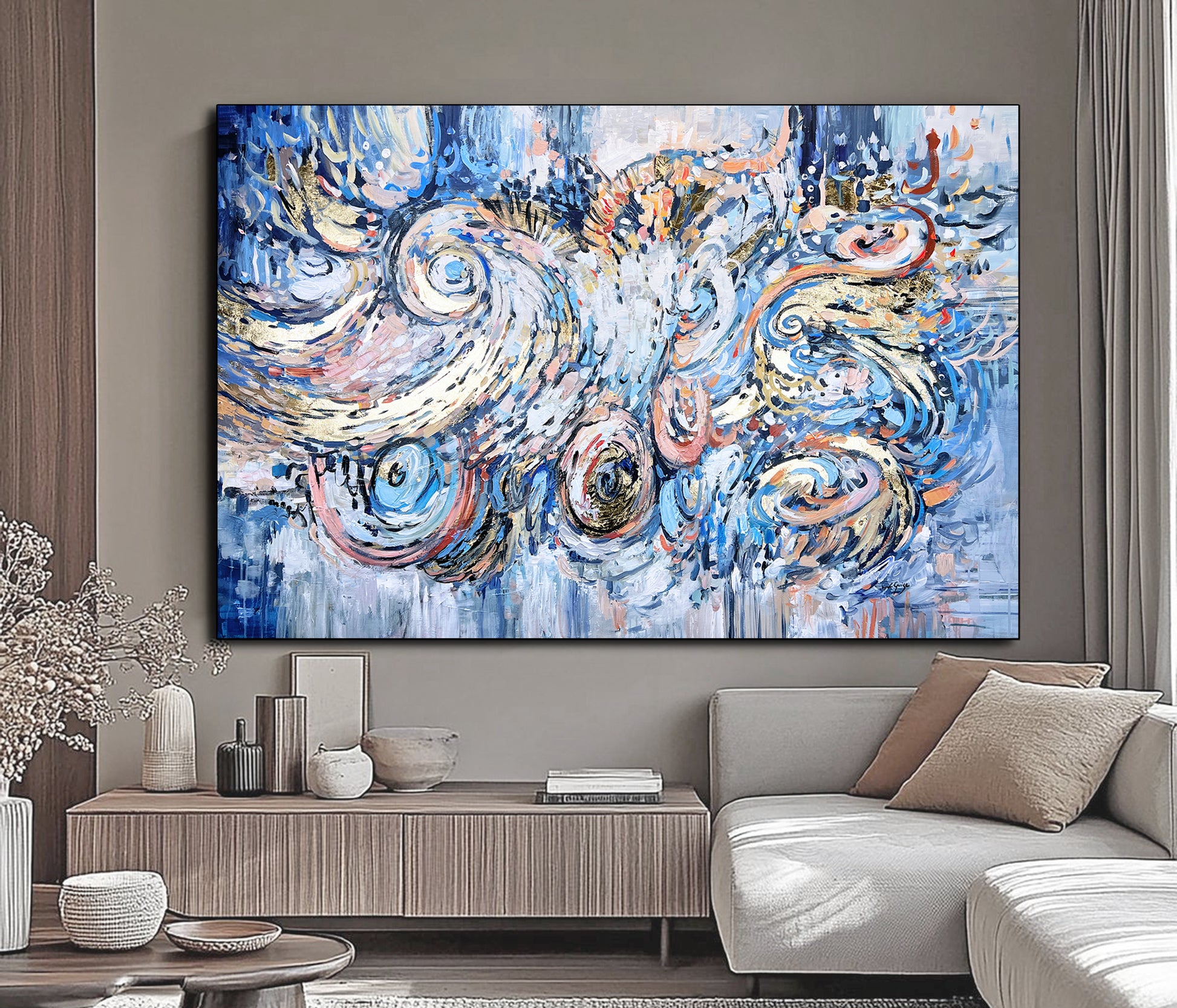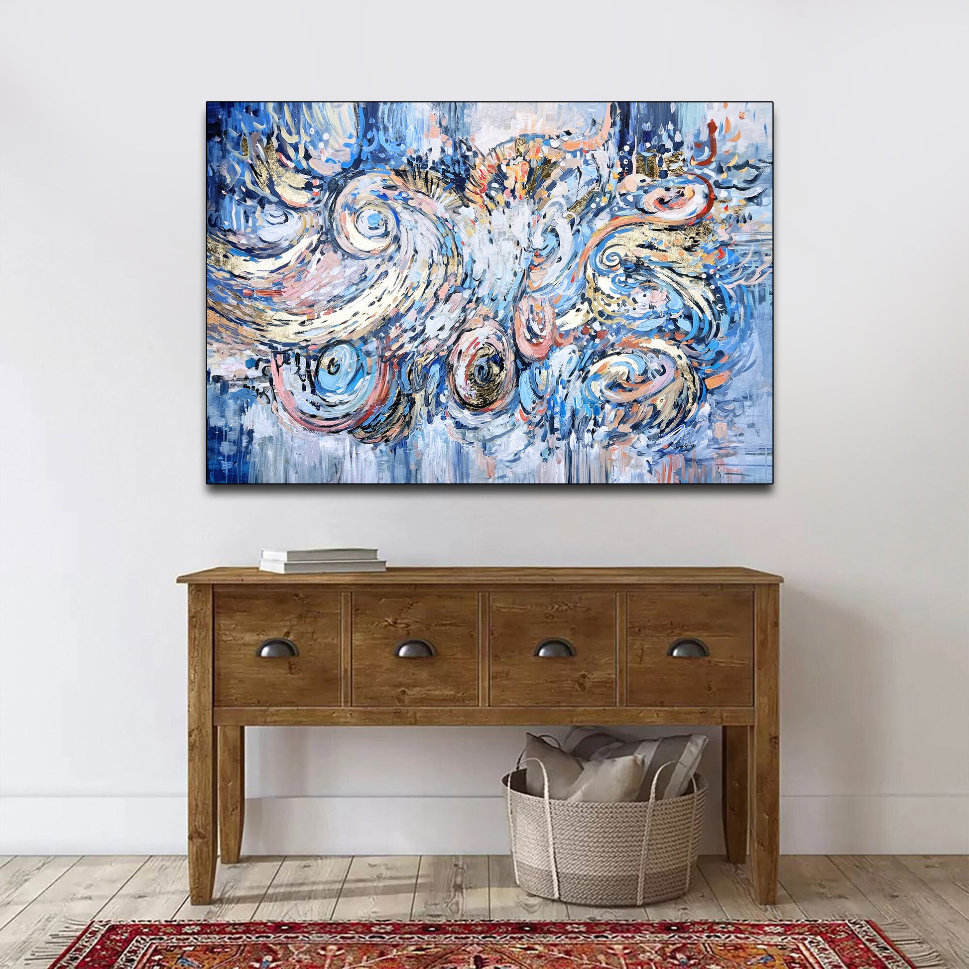 Painted with a palette of deep blues, soft neutrals, and luminous gold accents, this piece evokes movement, harmony, and warmth, translating sound into color and flow.