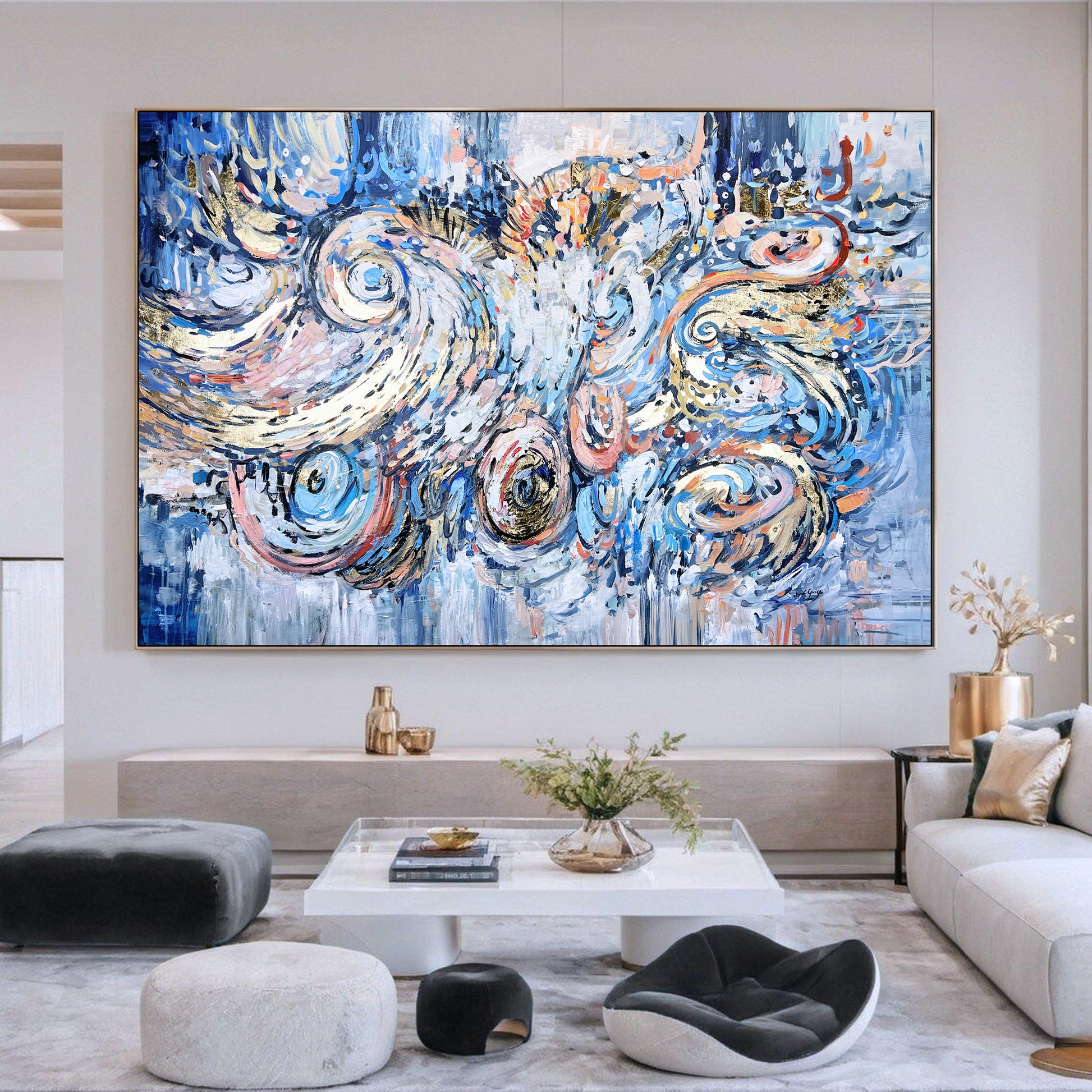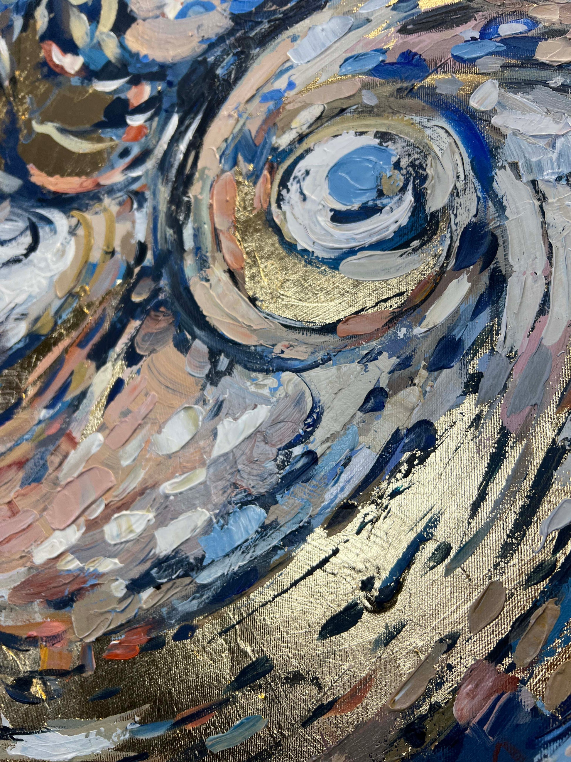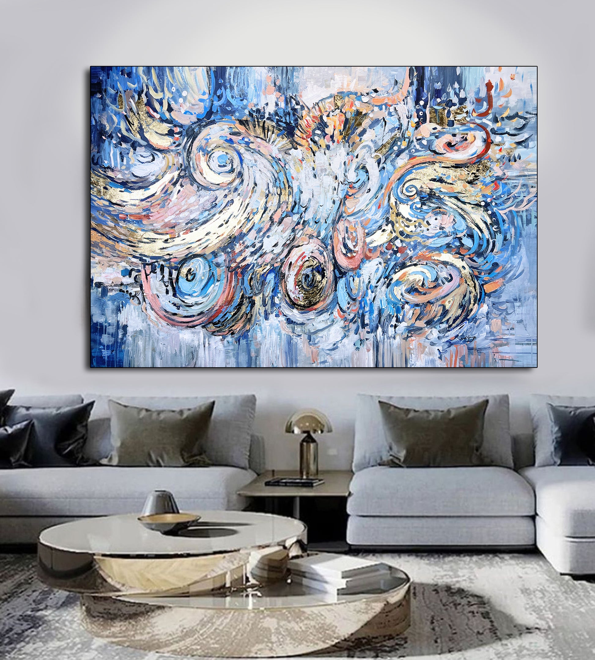 Painted with a palette of deep blues, soft neutrals, and luminous gold accents, this piece evokes movement, harmony, and warmth, translating sound into color and flow.
