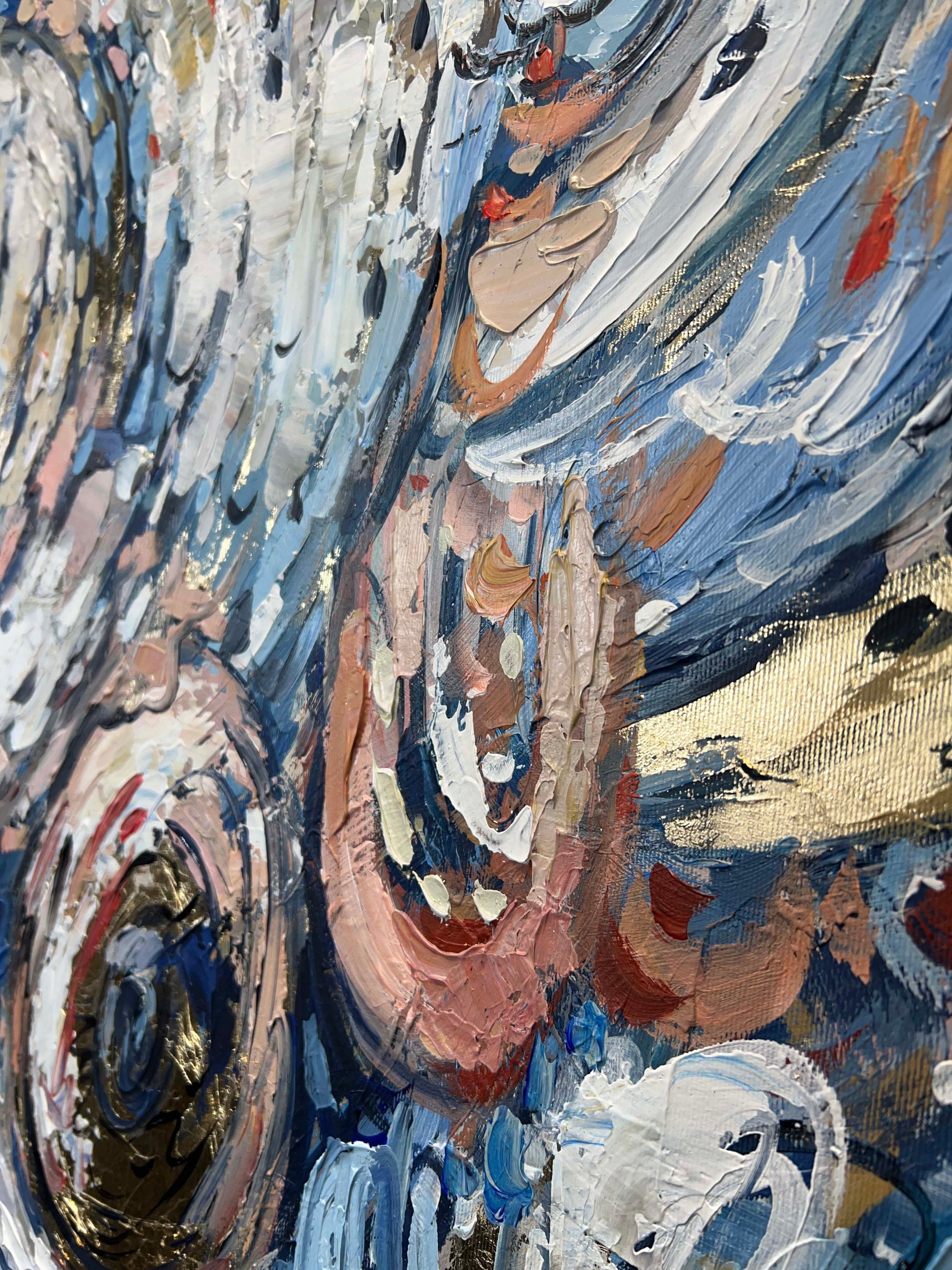 Textured brushstrokes and layered forms create a dynamic sense of motion, reminiscent of a jazz melody unfolding freely across the canvas. Gold elements catch the light and add depth and brilliance, enhancing the painting’s energetic yet balanced composition.