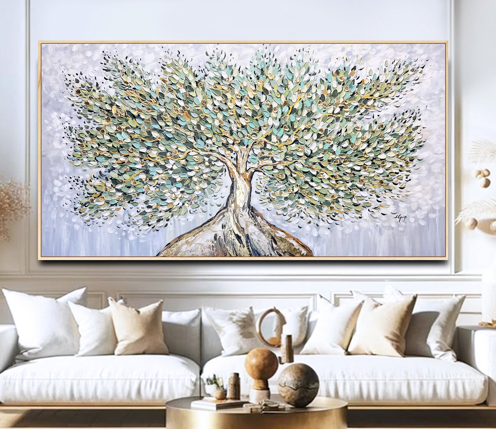 To me, a simple wooden frame is the perfect finish, grounding the earthy palette while allowing the green and gold to glow. Hung on the wall, it instantly brings a sense of serenity, warmth, and timeless elegance.