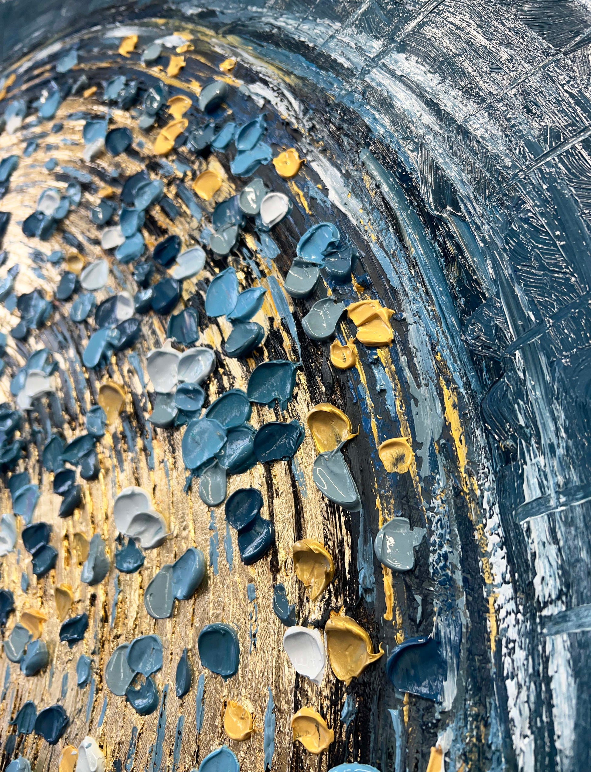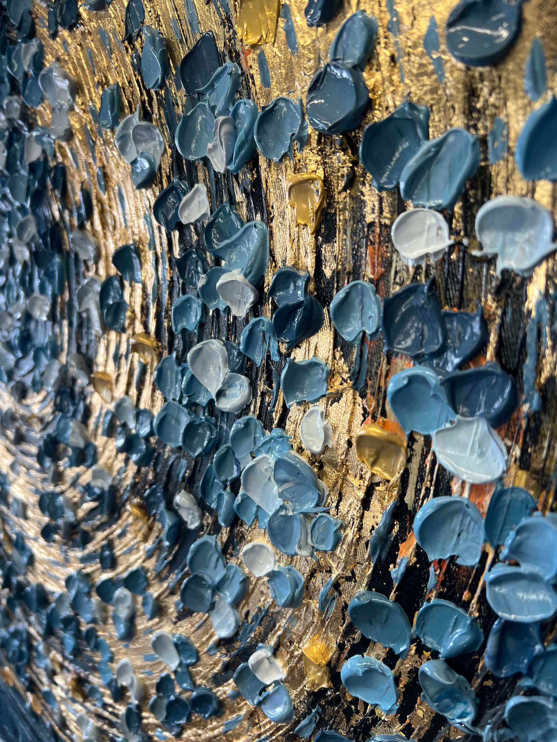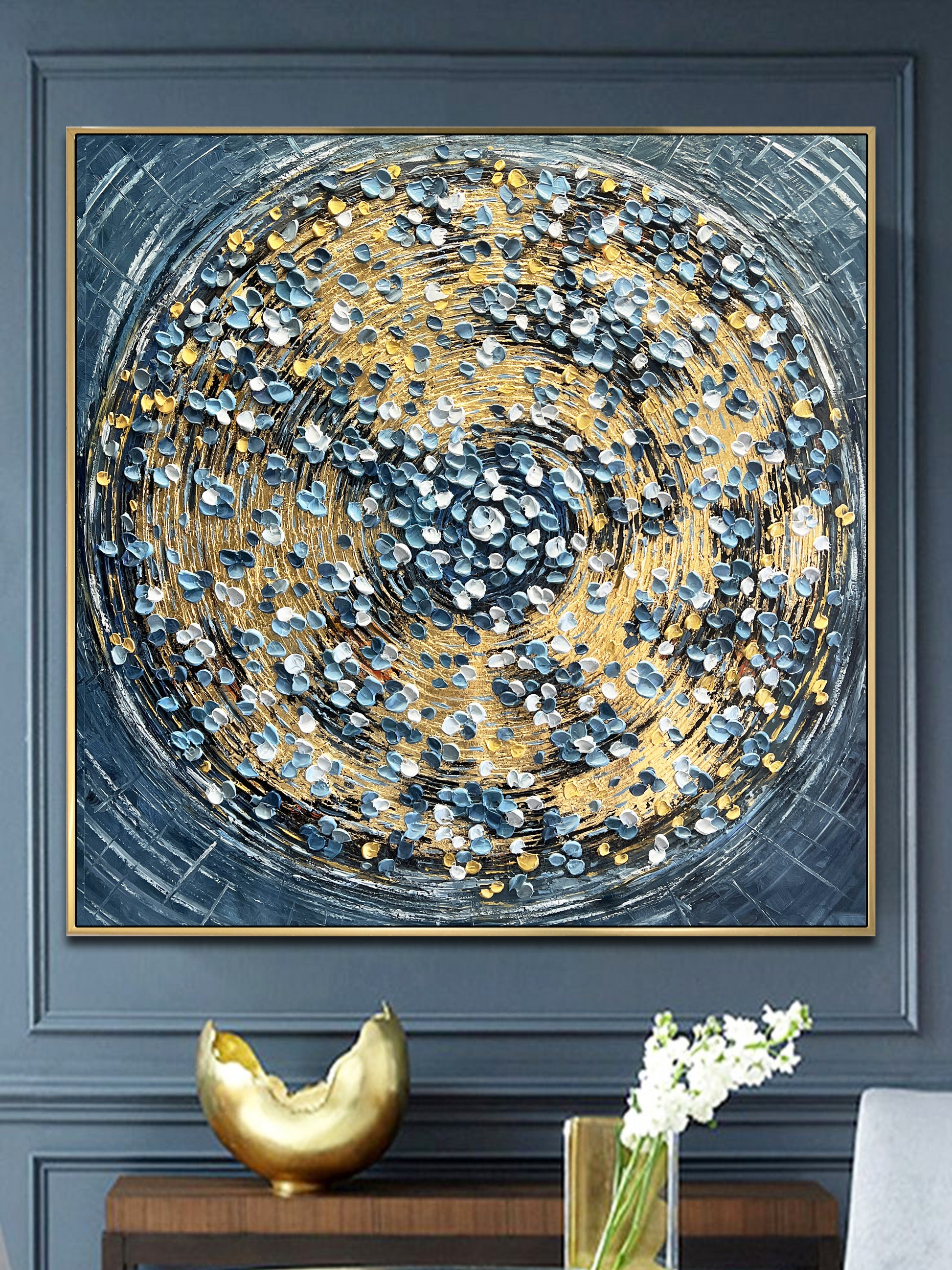The rich gold spirals form the heart of the painting, pulling you into a vortex of light and motion, while delicate petals in teal, white, and soft gray drift around it like scattered memories.