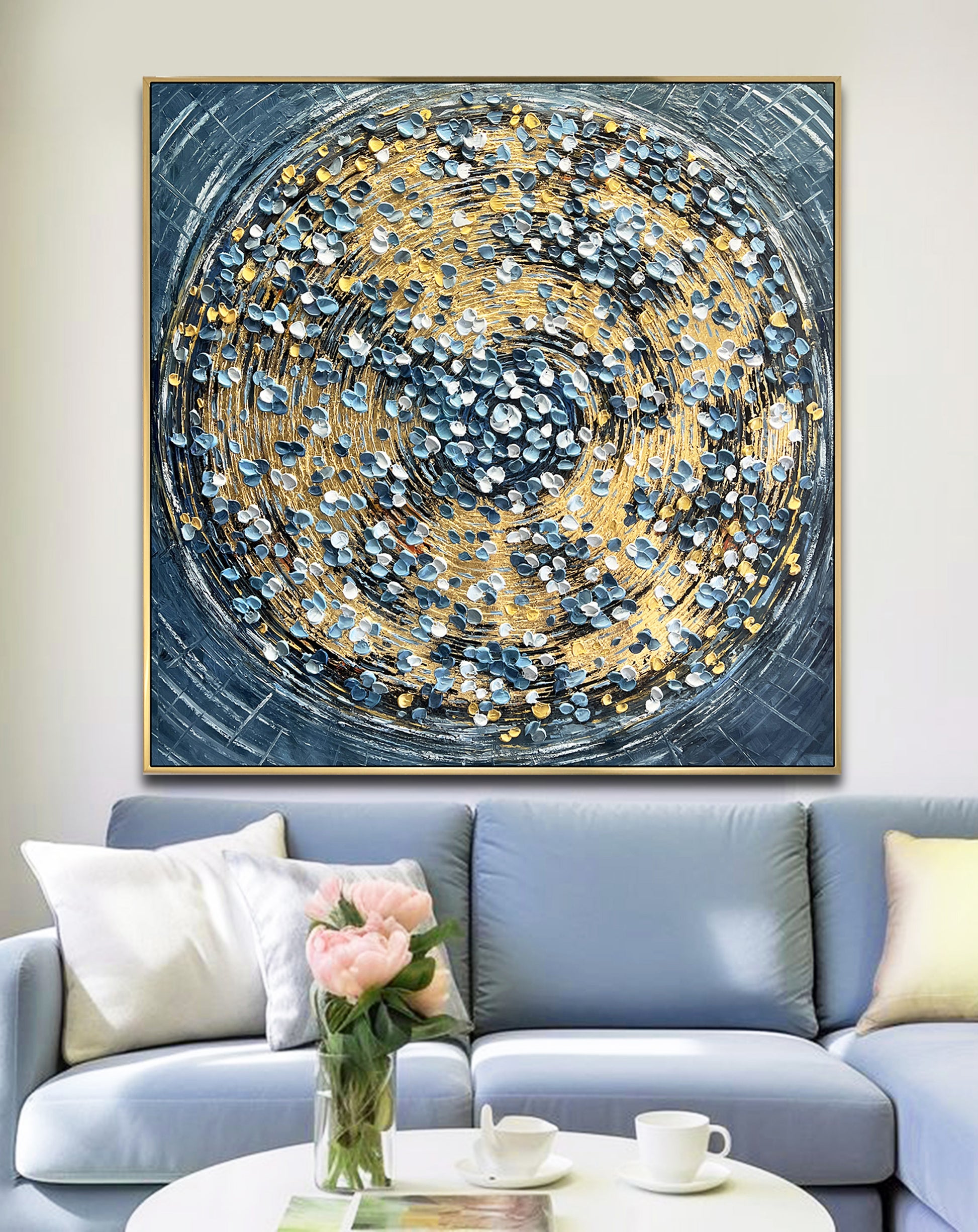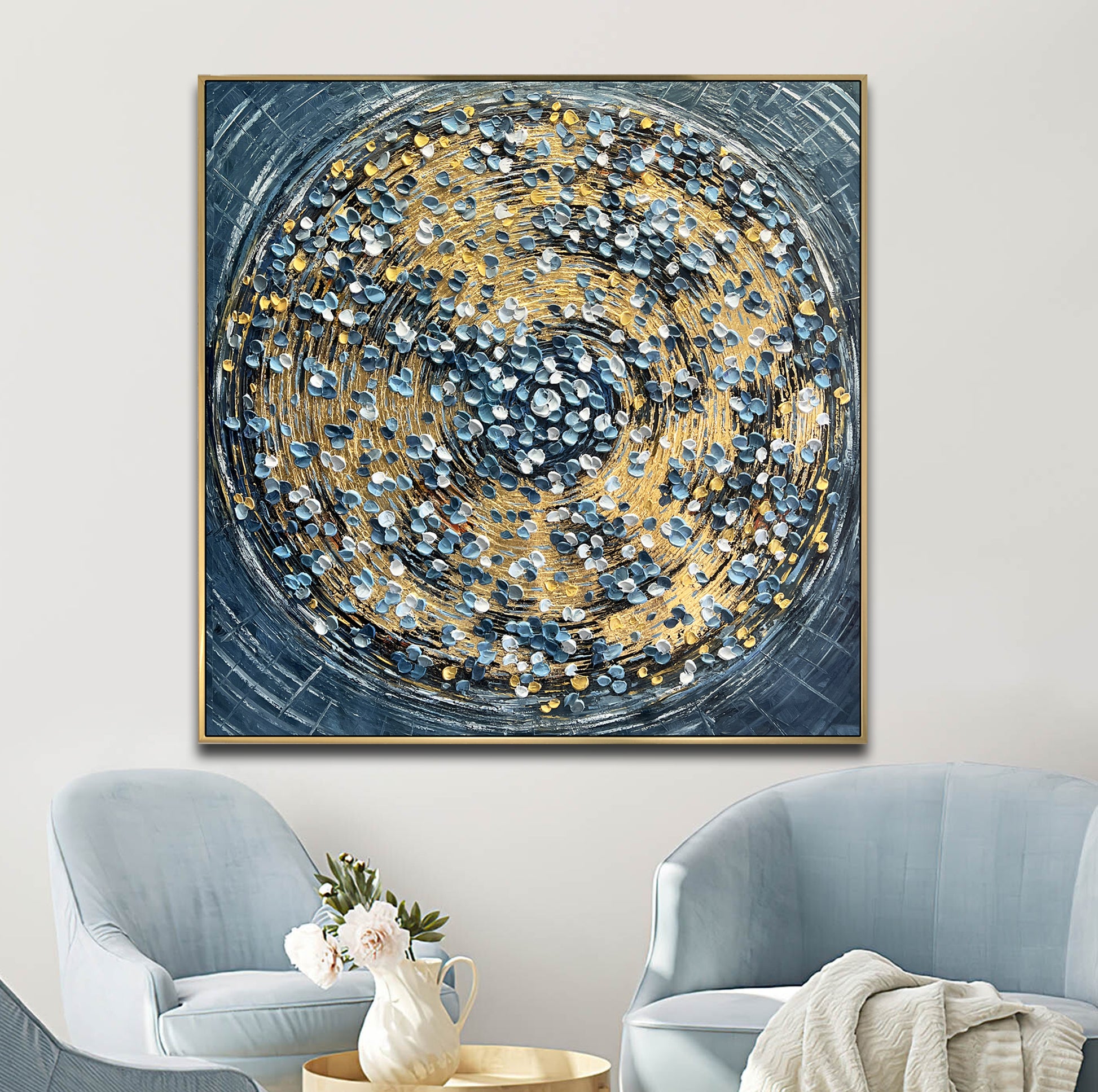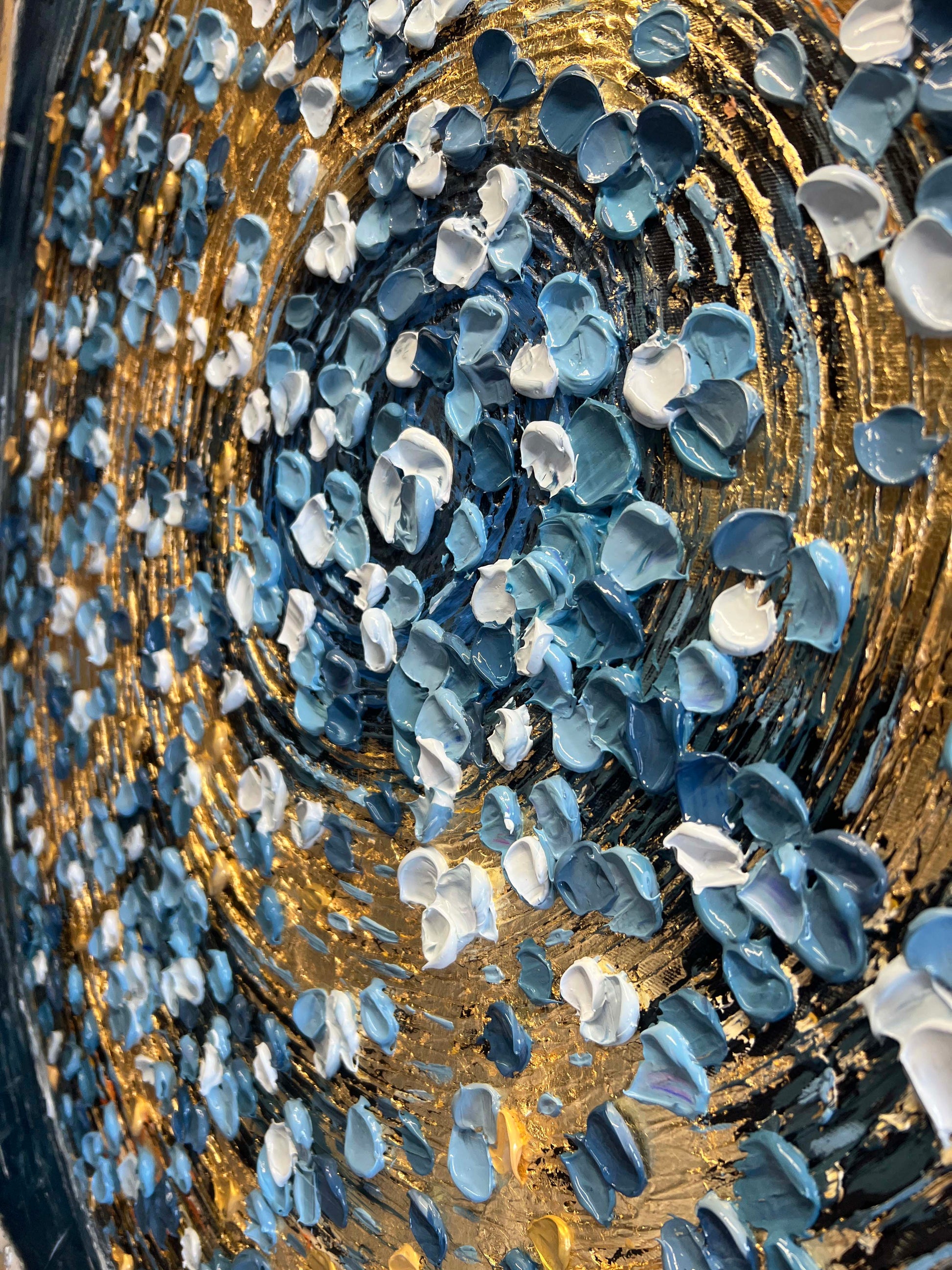 The rich gold spirals form the heart of the painting, pulling you into a vortex of light and motion, while delicate petals in teal, white, and soft gray drift around it like scattered memories.