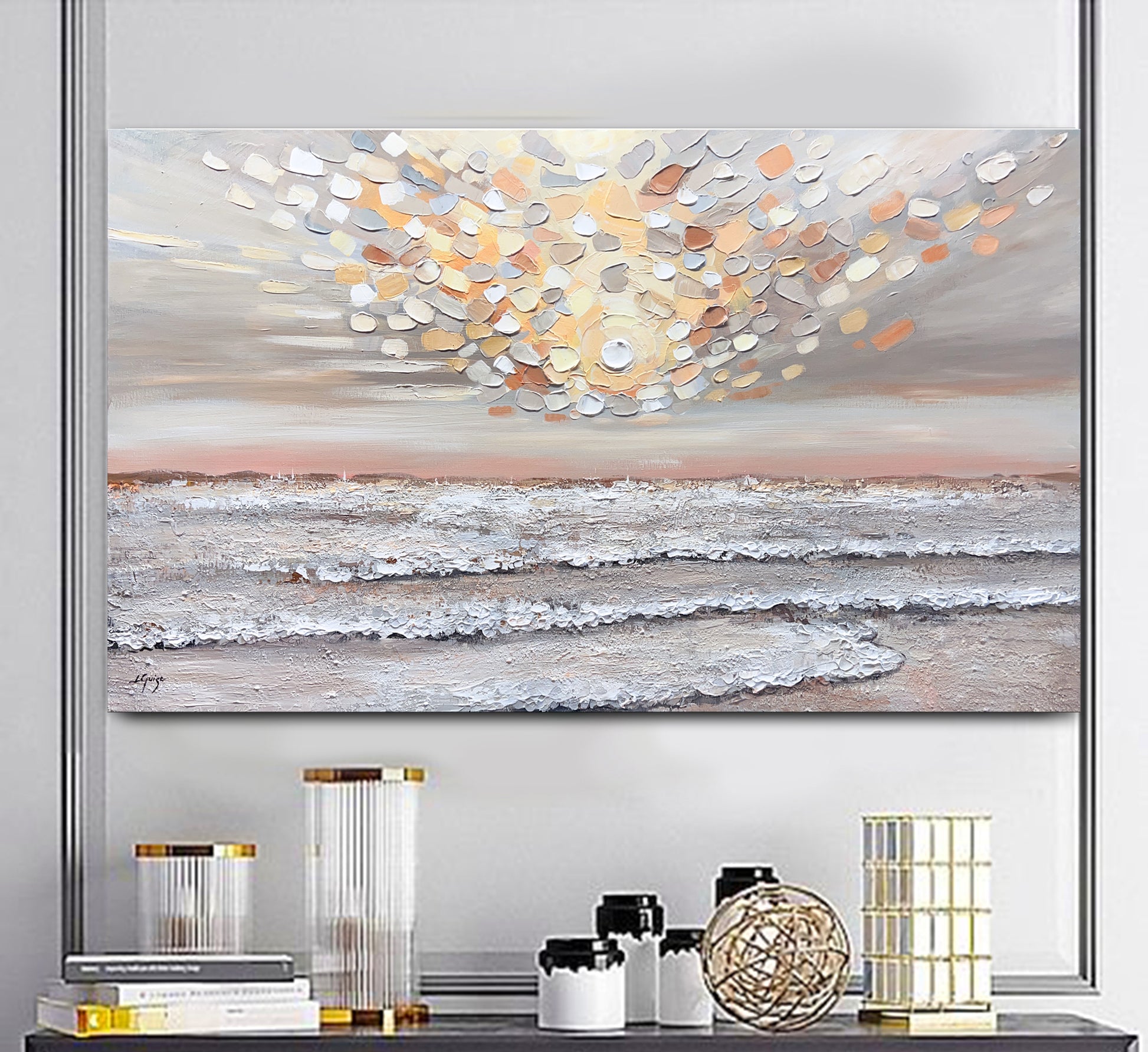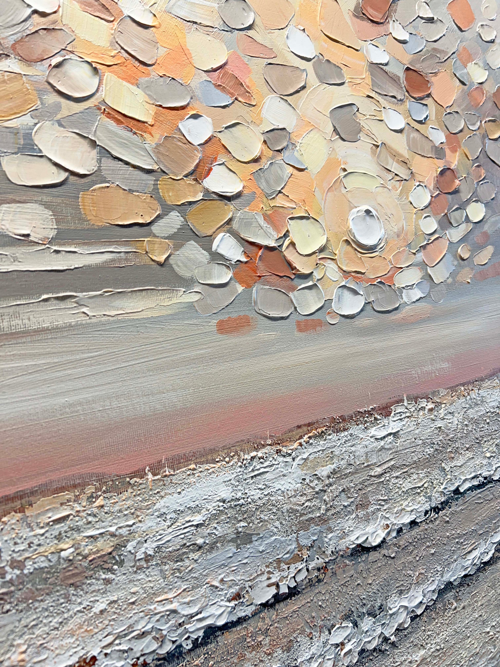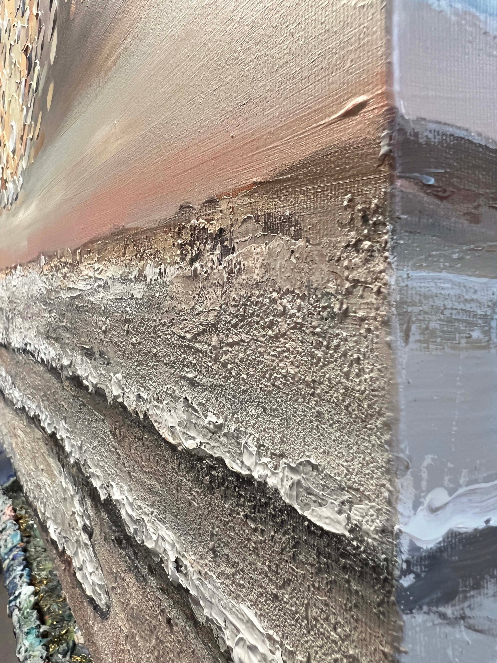 Heavenly Rise is a captivating textured seascape that evokes the serene warmth of a pastel sunrise.